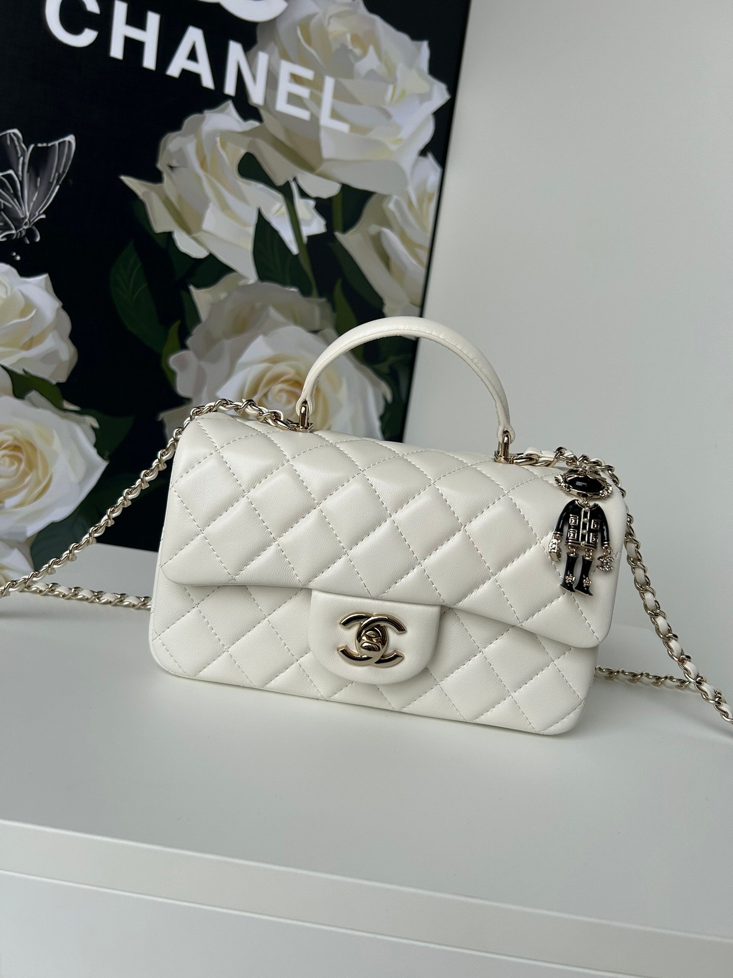 21K’s latest Mini CF handle handbag AS2431 classic diamond cushion bag with head hanging decoration is decorated with exquisite classic chains and portable, delicate sheepskin: retouches the handbag, stands out and interprets eternal elegance. Size: 20x12x6cm
