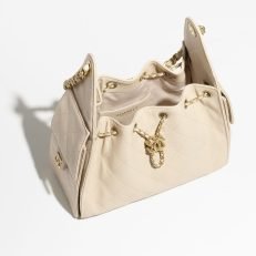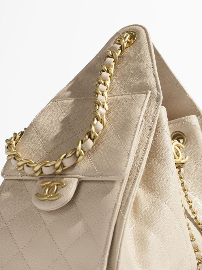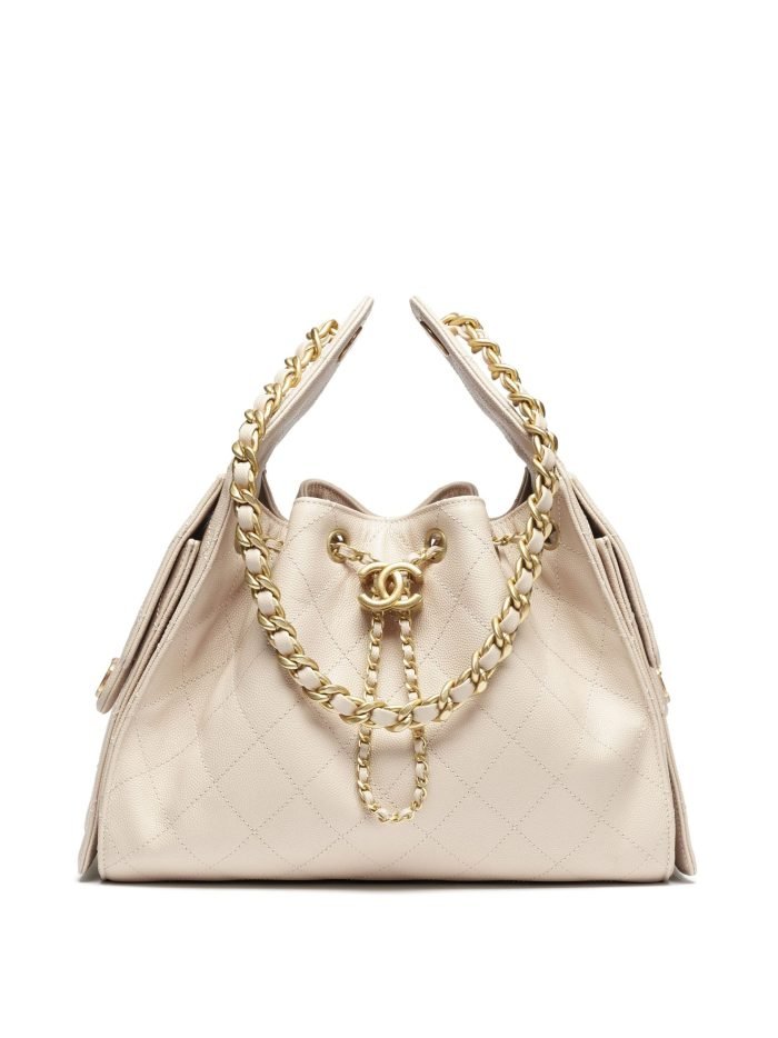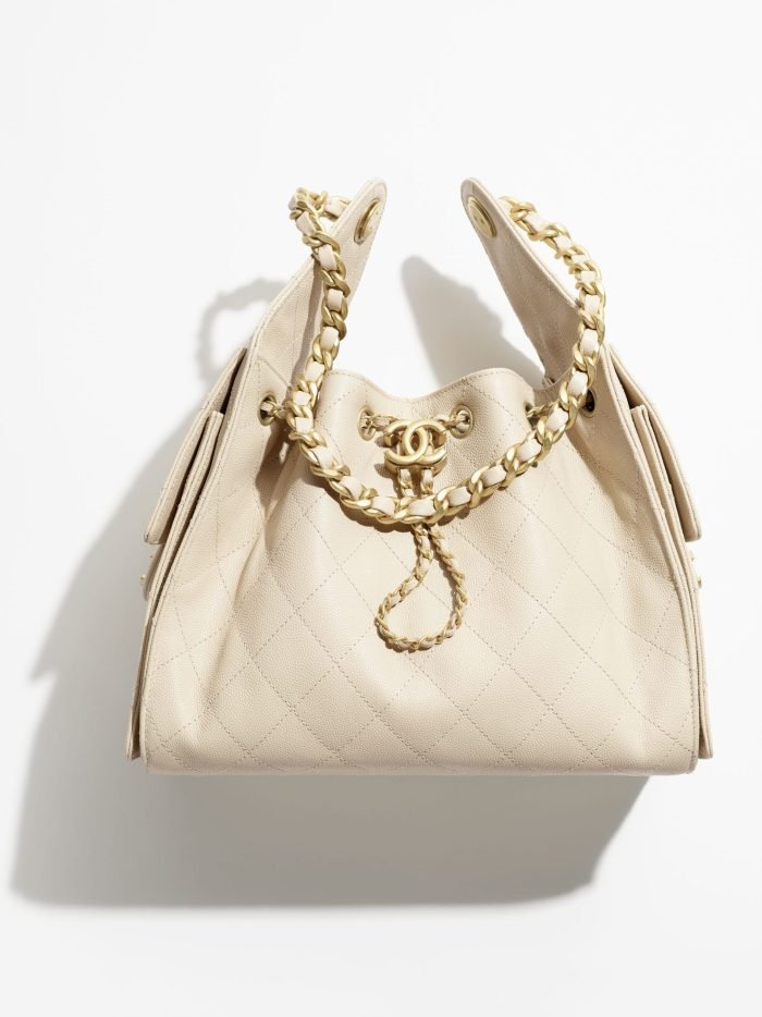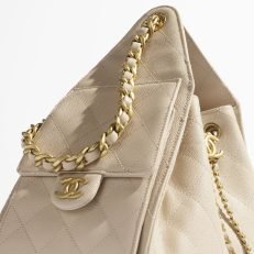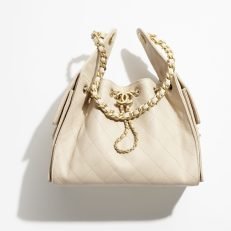 The Chanel Small 25 Hobo Bag is crafted from beige shiny grained calfskin with antique gold hardware and features signature diamond quilting. two exterior pockets. drawstring closure and an interwoven antique gold and white leather shoulder strap.