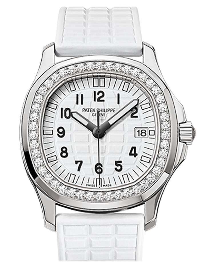 Stainless steel case with a tropical composite strap bracelet. 46 diamonds (~1 ct) bezel. Glitter white embossed dial with black hands and Arabic numeral hour markers. Minute markers around the outer rim. Dial Type: Analog. Date display at the 4 o’clock position. Calibre E23-250 S C quartz movement. Scratch resistant sapphire crystal. Screw down crown. Case size: 35.6 mm. Oval case shape. Aquanaut fold-over clasp. Water resistant at 120 meters / 400 feet. Functions: date. hour. minute. second. Luxury watch style. Watch label: Swiss Made. Aquanaut Diamond Ladies Watch
