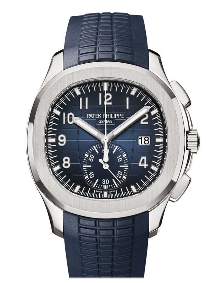 is reasserting the ??contemporary casual chic?? spirit of the Aquanaut flyback chronograph with the first white gold version of this self-winding model. combined with an elegant midnight blue color for the dial and matching composite strap. The dial is enlivened by a black-gradient rim. Water-resistant to 120 m. the case is enhanced by polished and satin finishes. The 60-minute counter at 6 o’clock picks up the rounded octagonal shape of the bezel. The patented fold-over clasp is secured by four independent catches. Self-winding mechanical movement. Caliber CH 28?520 C. Flyback chronograph. Central chronograph hand. 60-minute counter. Date in an aperture. Blue. black-gradient. embossed with Aquanaut pattern. gold applied numerals with luminescent coating. White gold. Screw-down crown. Sapphire-crystal case back. Water-resistant to 120m. Diameter (10-4 o’clock): 42.2 mm. Height: 11.9 mm. Composite material. midnight blue. Aquanaut fold-over clasp.