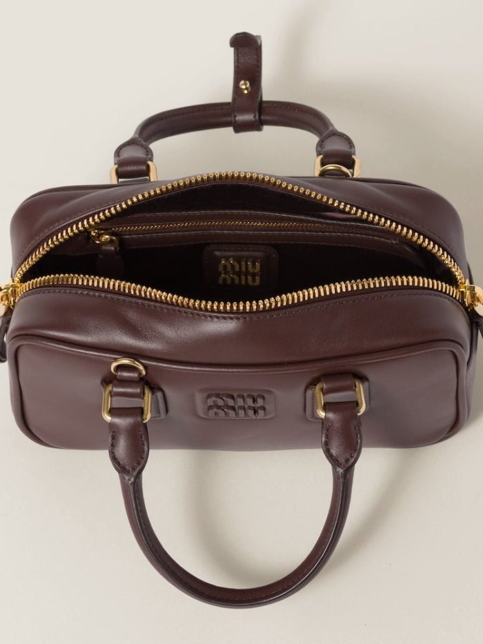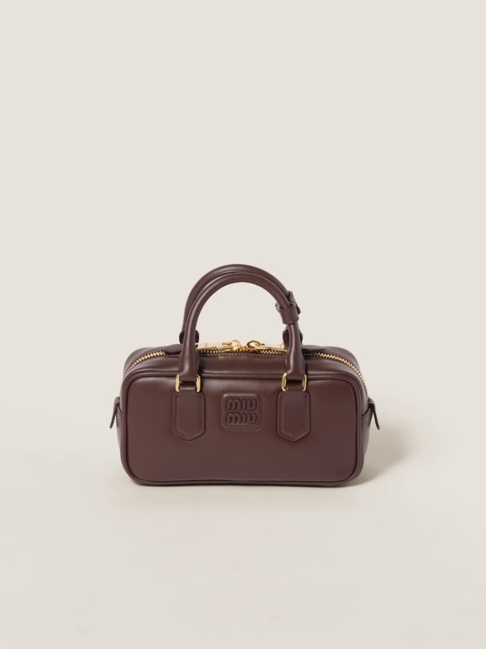 This Arcadie leather bag expresses a notion of fashion as a means of translating a reaction to current reality into material form. The light padding gives the bag a voluminous look and a cosmopolitan style. The lettering logo. which echoes the finishes of the metal hardware. crosses the boundaries between function and decoration and helps to define the distinctive and iconic aesthetic of the top-handle bag.