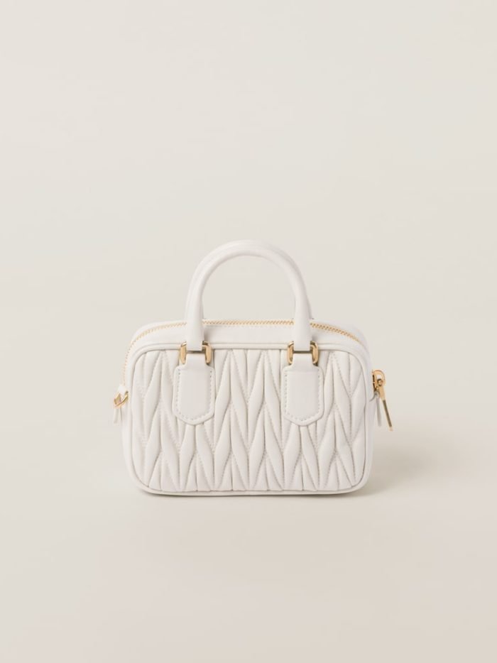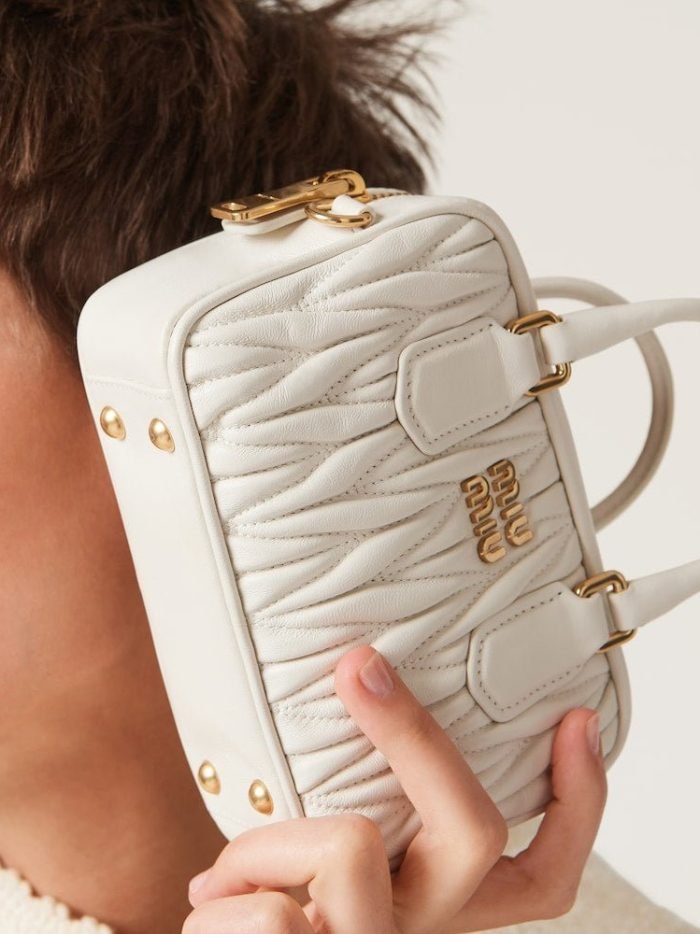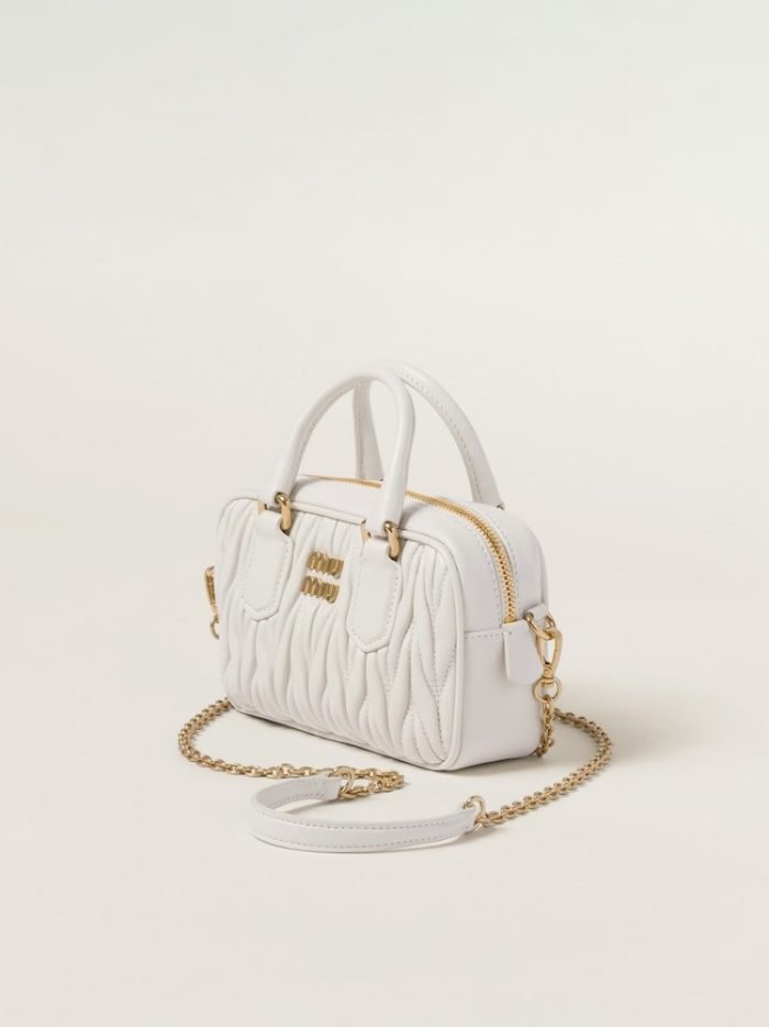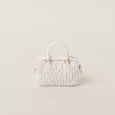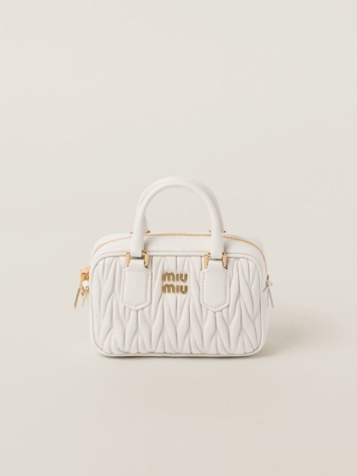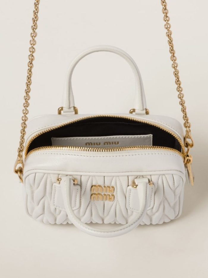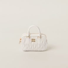 Miu Miu revisits classic codes. plays with iconic shapes. and reimagines functions. Made of matelass?? nappa leather. a Miu Miu hallmark. this micro Arcadie bag blends day and night. becoming a versatile accessory of great modernity and elegance. Sophisticated color details brighten the bag.