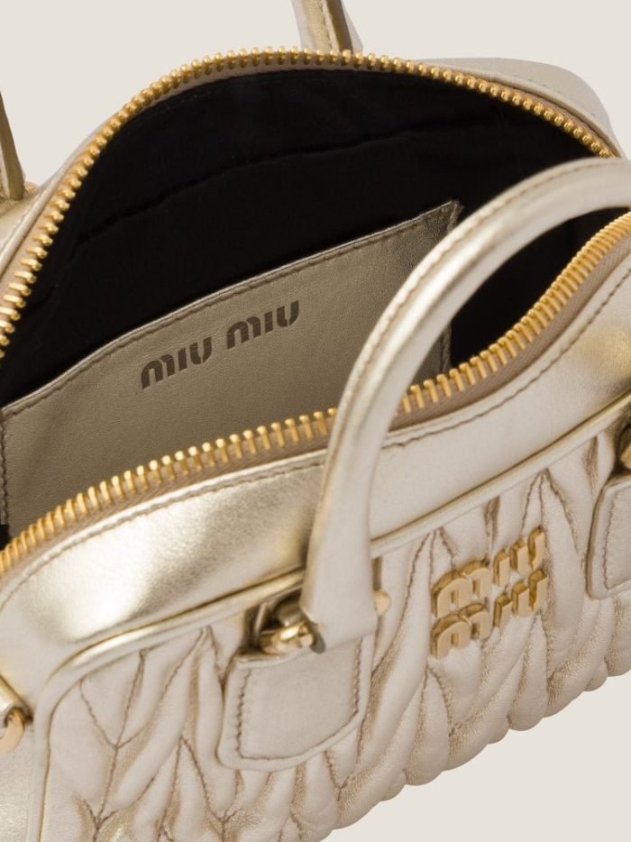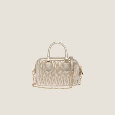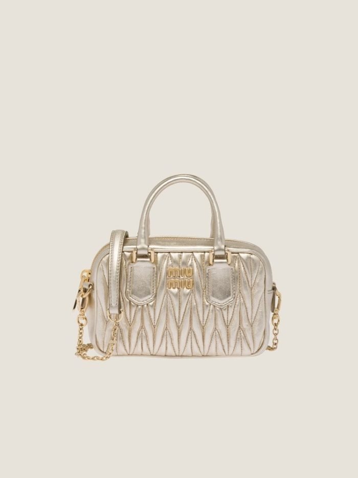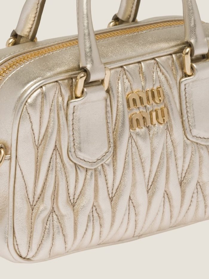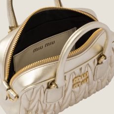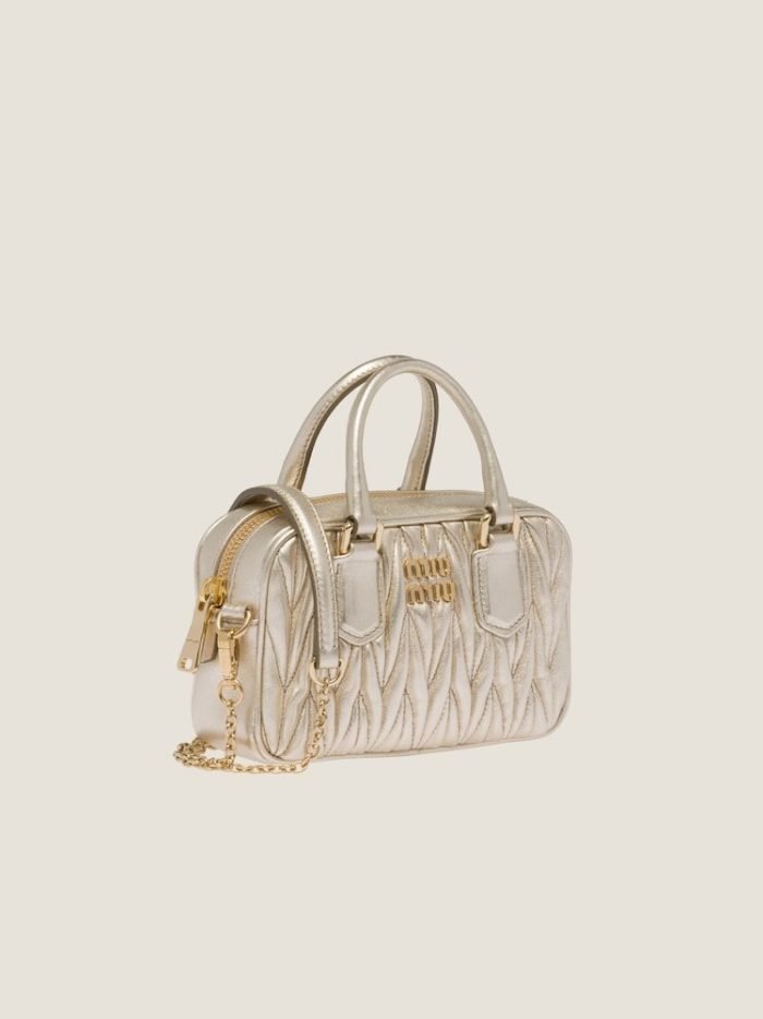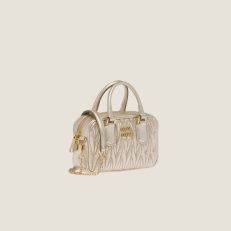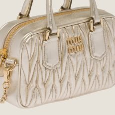 Miu Miu revisits classic codes. plays with iconic shapes. and reimagines functions. Made of matelass?? nappa leather. a Miu Miu hallmark. this micro Arcadie bag blends day and night. becoming a versatile accessory of great modernity and elegance. Sophisticated color details brighten the bag.
