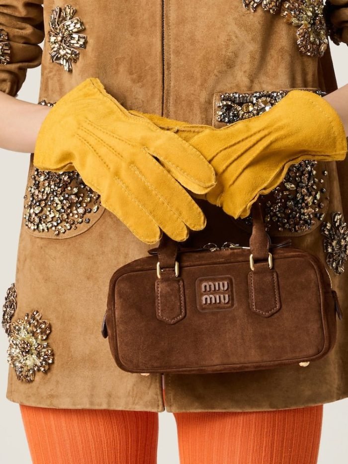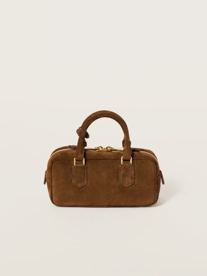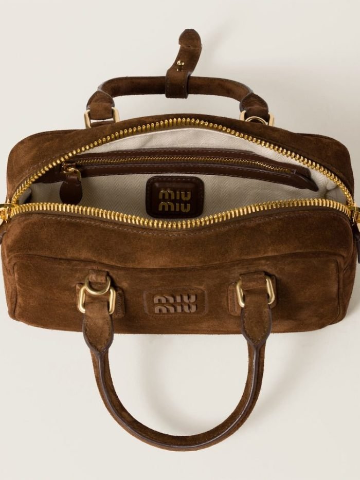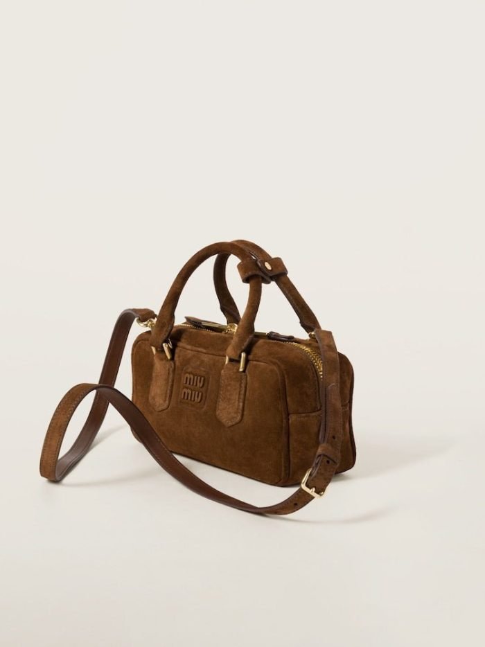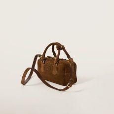 This Arcadie suede bag expresses a concept of fashion as a means for translating a reaction to current reality into a particular shape. The light padding gives a voluminous appearance and cosmopolitan style to the accessory. The lettering logo. in the same color as the hardware. crosses the boundaries between function and decoration and helps define the distinctive and iconic aesthetic of the top-handle bag.