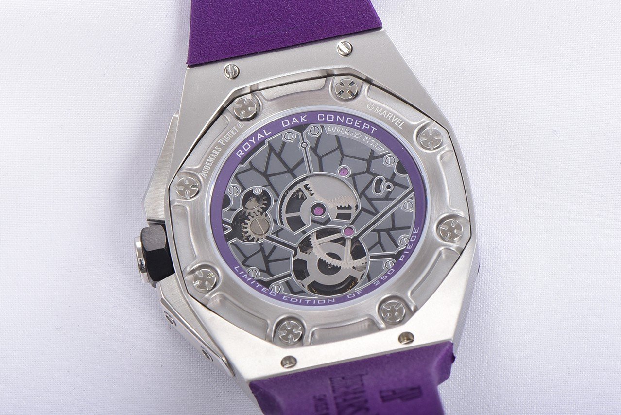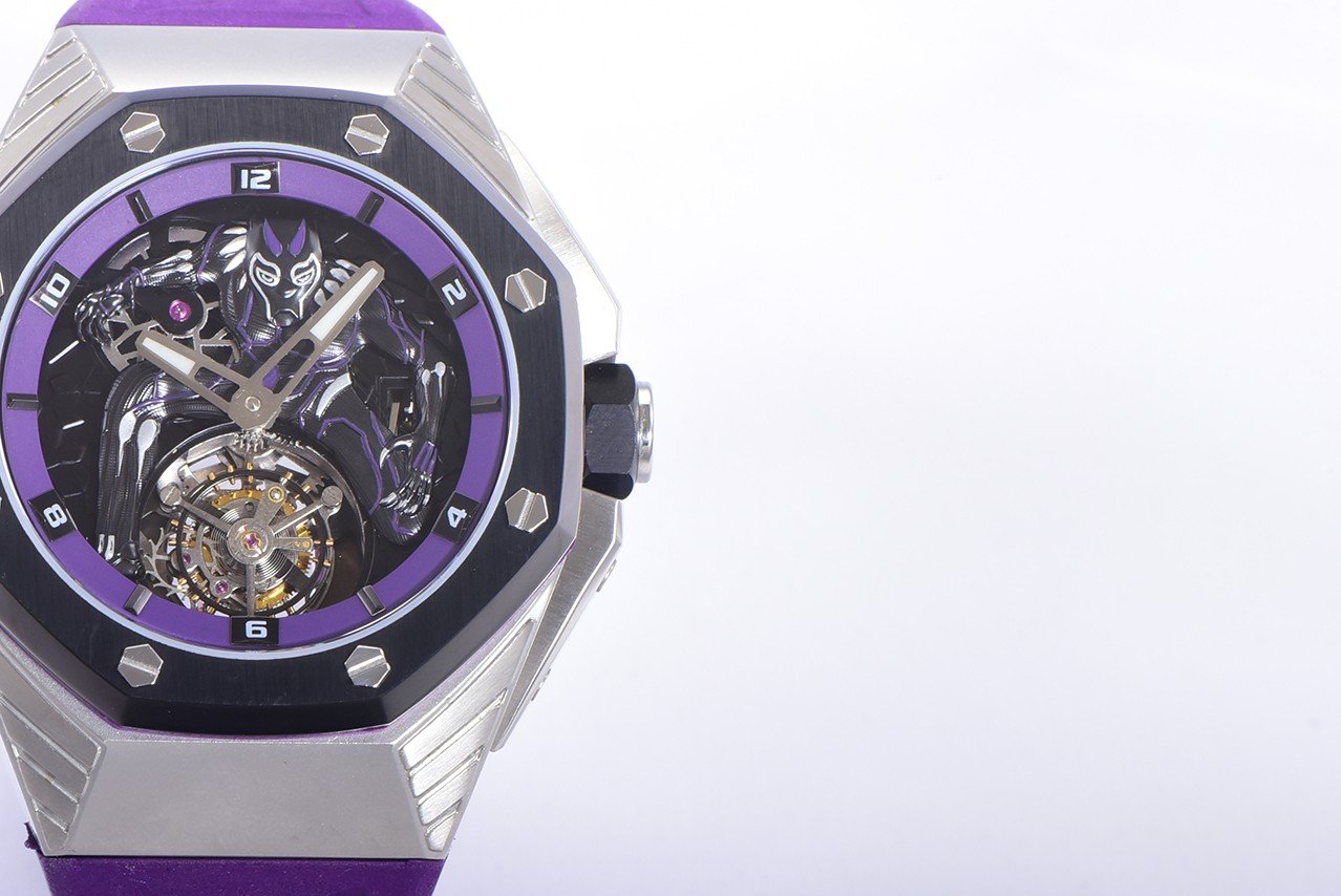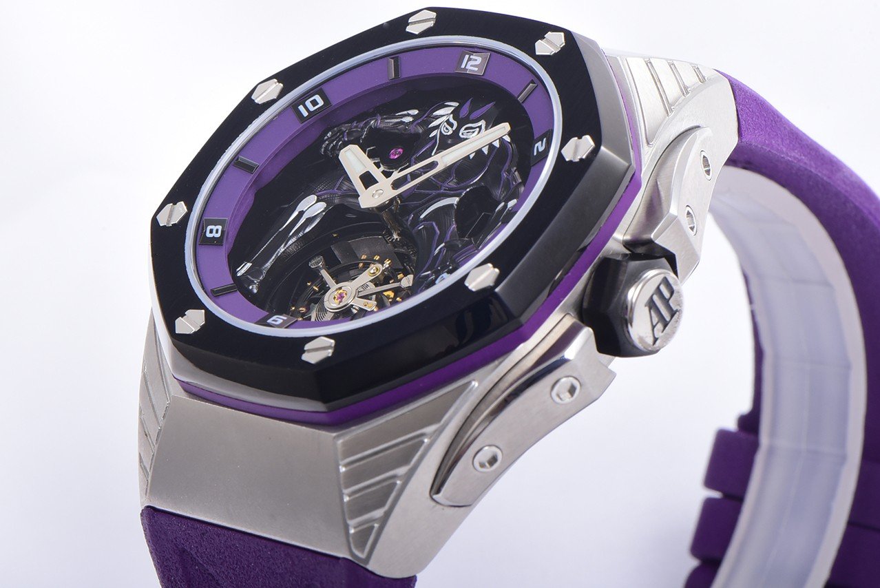 Audemars Piguet AP Black Panther (True Tourbillon) and Marvel’s 26620 Black Panther limited edition of 250 pieces, the Royal Oak Concept “Black Panther” floating tourbillon watch is enhanced by purple coloring. This is the role of a modern fine watch: to do everything in its power to create a piece of craftsmanship that is both refined and wearable. Take a closer look at the Royal Oak Concept Panther, which is dressed in a battle suit that is so vivid and authentic in every detail. 1 On the Royal Oak Concept Panther, every detail of the Panther in his battle dress comes to life. The three-dimensional micro-sculpture of the Black Panther on the Royal Oak Concept Panther watch is made of white gold, laser-cut and hand-engraved to reveal the texture of the suit, and finished with a wash of color that is repeated over and over again. The Black Panther micro-sculpture is fixed to an inner bezel of the dial, which is sandblasted in the same shade of purple as the strap. 2 The decorative details of the Black Panther, including the paws, muscles and facial features, were hand-carved by the same sculptor and took a total of 30 hours to complete. If every comic book lover has a hobby of collecting models, then Audemars Piguet’s Royal Oak Concept Black Panther is probably the most incredible, eye-popping, overpriced “toy” you can imagine. We’ve thought of all sorts of ways to get closer to the world of Marvel’s superheroes, and the Audemars Piguet Royal Oak Concept Panther instantly raises the bar so high that it’s just as convincing. 3 Audemars Piguet Royal Oak Concept Black Panther Floating Tourbillon 26620, sandblasted titanium case, black ceramic-colored bezel and crown, diameter 44 mm, thickness 14.6 mm, hand-painted 3D panther motif in white gold, purple inner bezel, white gold hour-markers and hands. Hand-wound movement caliber 2965, 28,800 vibrations at 3 Hz, 75-hour power reserve, purple rubber strap with AP folding clasp