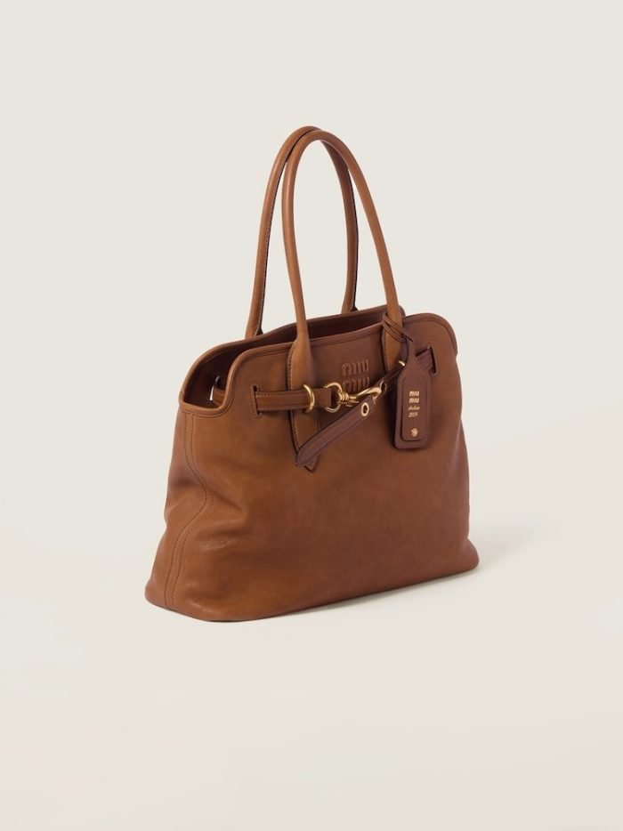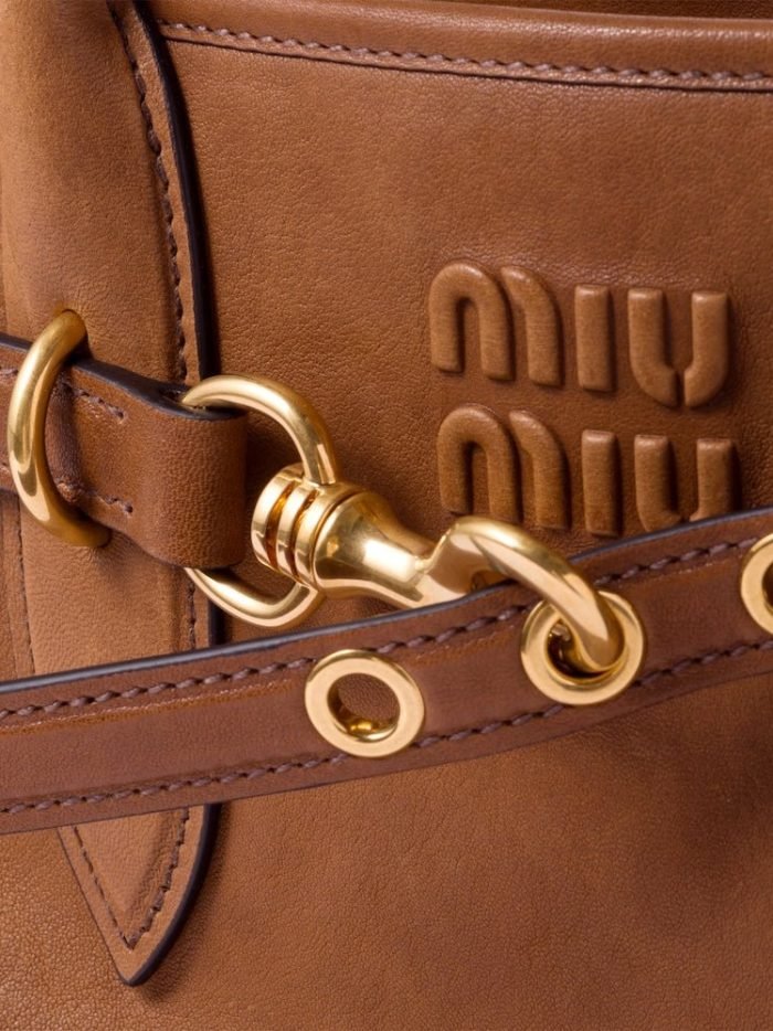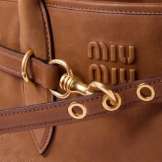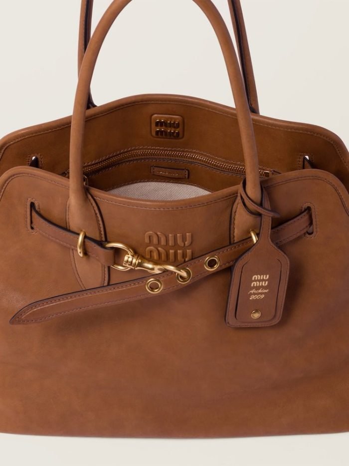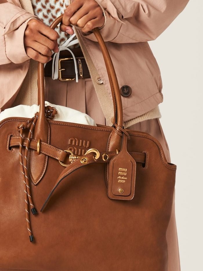 The Aventure top-handle bag. recovered from the Miu Miu archives. has been reinterpreted in terms of a lighter structure and attitude. creating a classic style with timeless charm. The embossed lettering logo completes the design with an iconic note.