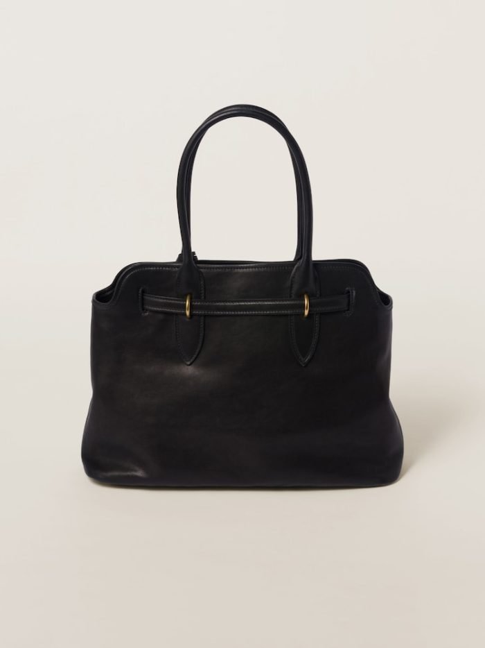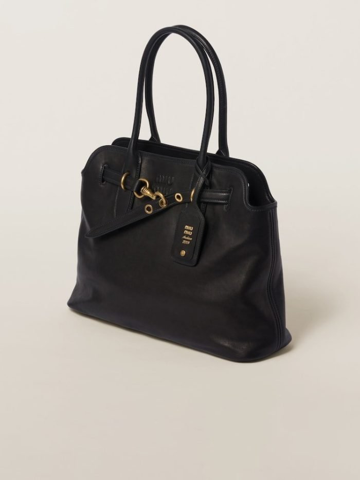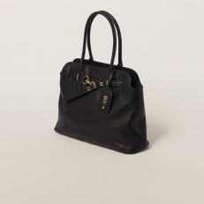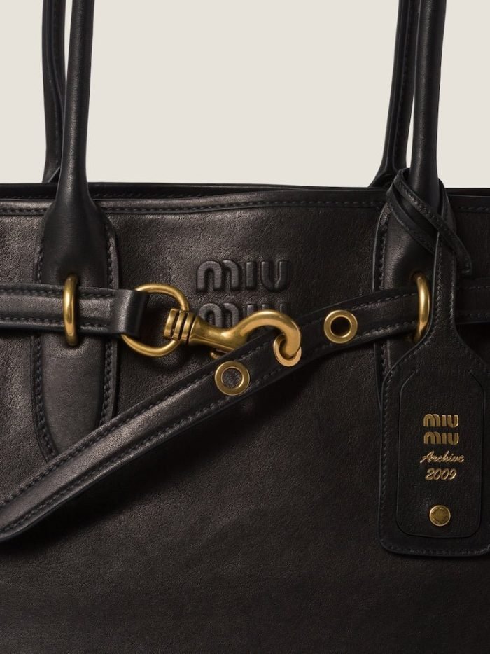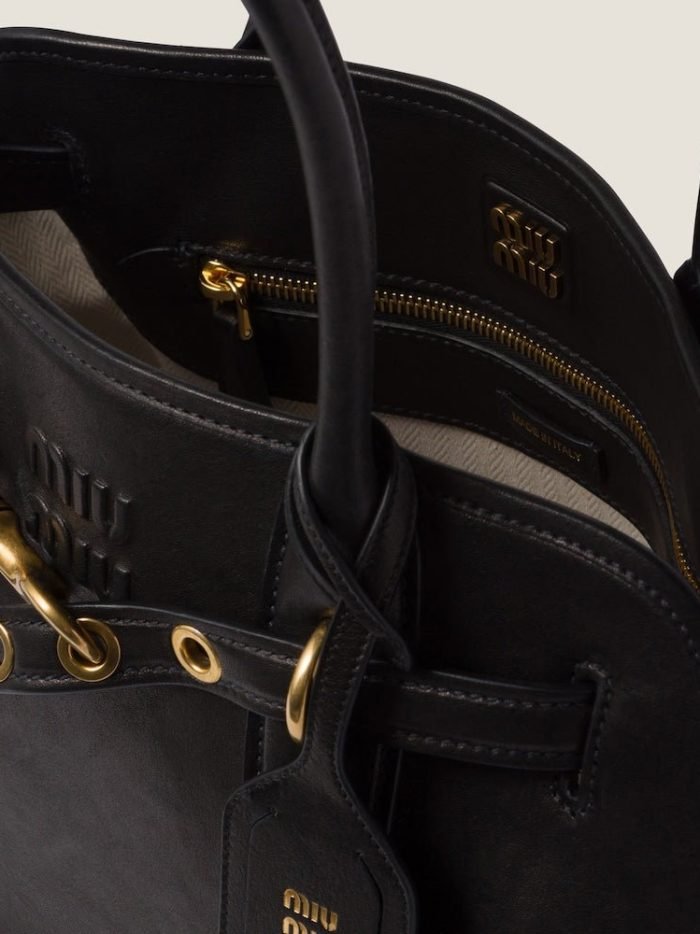 The Aventure top-handle bag. recovered from the Miu Miu archives. has been reinterpreted in terms of a lighter structure and attitude. creating a classic style with timeless charm. The embossed lettering logo completes the design with an iconic note.
