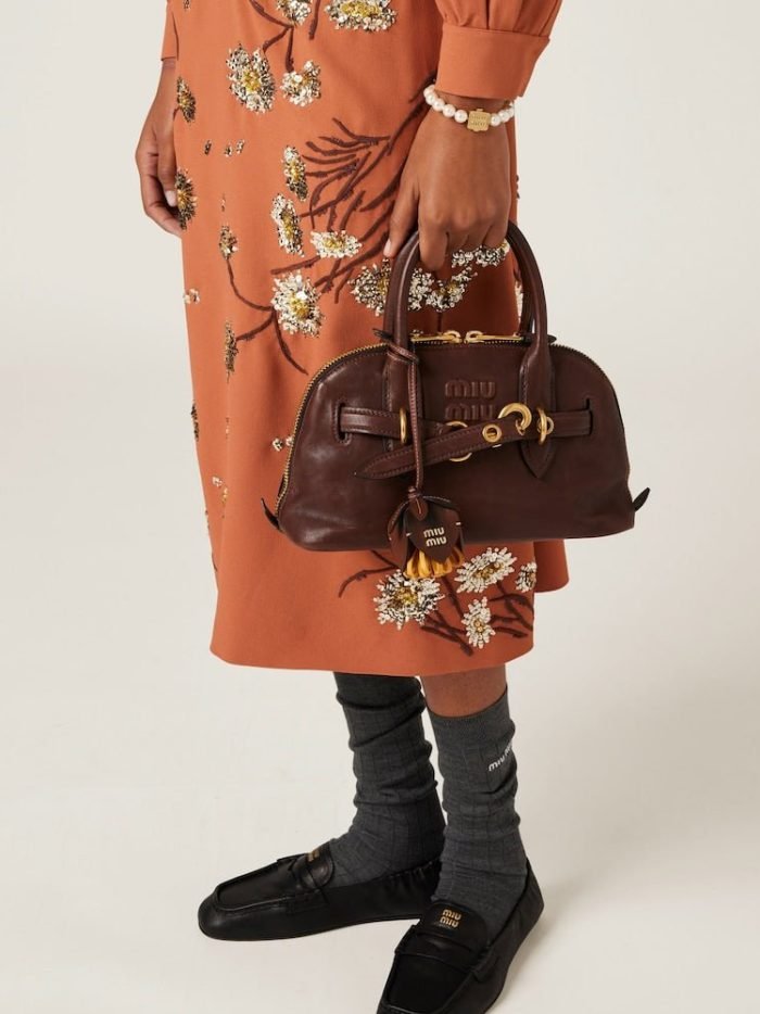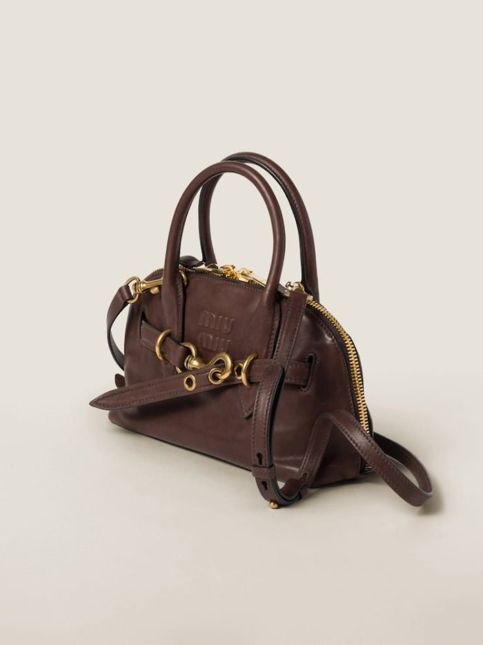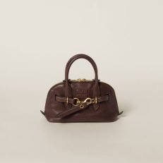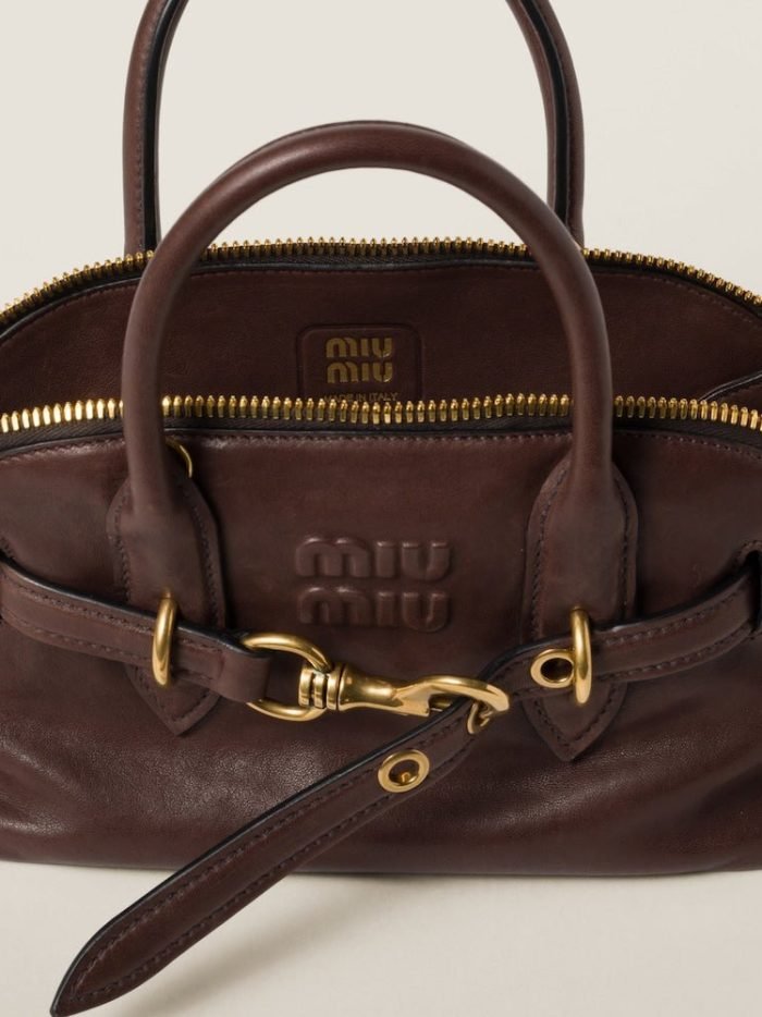 The Aventure top-handle bag. recovered from the Miu Miu archives. has been reinterpreted in terms of a lighter structure and attitude. creating a classic style with timeless charm. The embossed lettering logo completes the design with an iconic note.