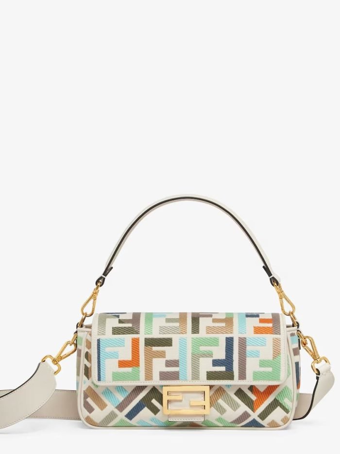 Iconic medium Baguette bag. made of natural canvas with a raised FF motif embroidered in multicolor yarn. Finished with off-white leather trim and embellished with an FF clasp.Featuring a front flap. magnetic clasp. internal compartment with zipper pocket and vintage gold-finish metalware.The bag can be carried by hand. or worn either on the shoulder or cross-body thanks to the handle and shoulder strap. both detachable.