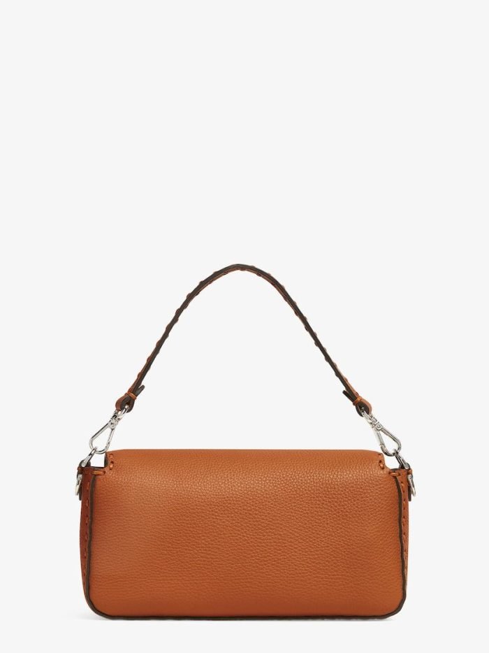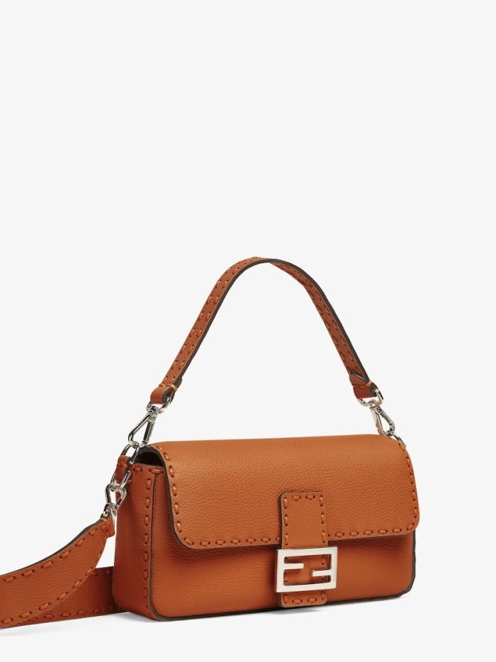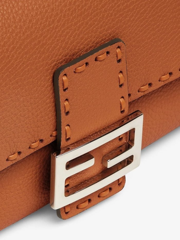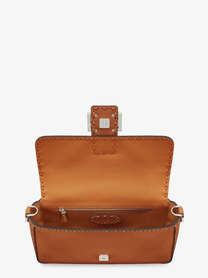 Iconic medium Baguette bag. made of brown Cuoio Romano leather embellished with oversized tone-on-tone hand stitching. Decorated with an FF clasp.Featuring a front flap. magnetic clasp. internal compartment with zip pocket and leather Selleria stamp. and palladium-finish metalware.The bag can be carried by hand. or worn either on the shoulder or cross-body thanks to the handle and shoulder strap. both detachable.Made in Italy