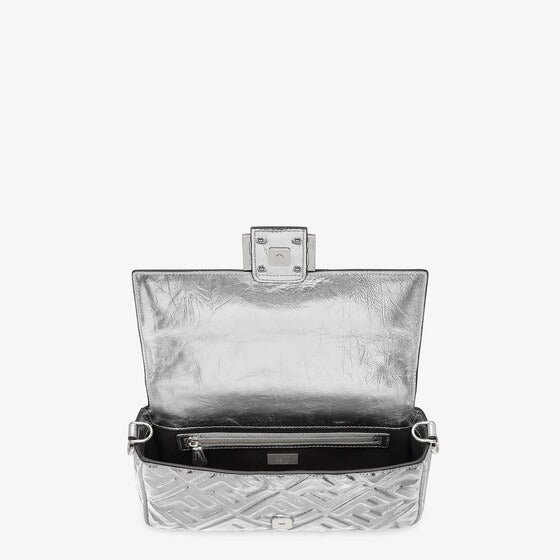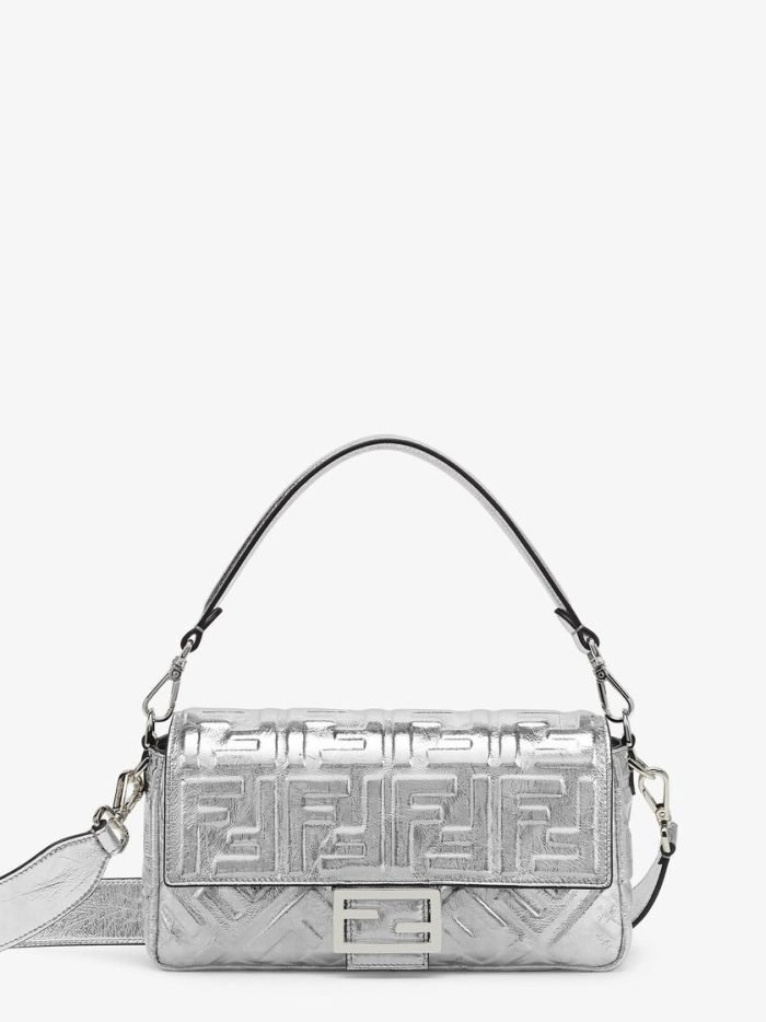 Iconic medium Baguette bag made of soft silver laminated nappa leather with a craquel?? effect and 3D embossed FF motif. Decorated with an FF clasp.Featuring a front flap. magnetic clasp. internal compartment lined in black fabric with zip pocket. and palladium-finish metalware.The bag can be carried by hand. or worn either on the shoulder or cross-body thanks to the handle and shoulder strap. both detachable.
