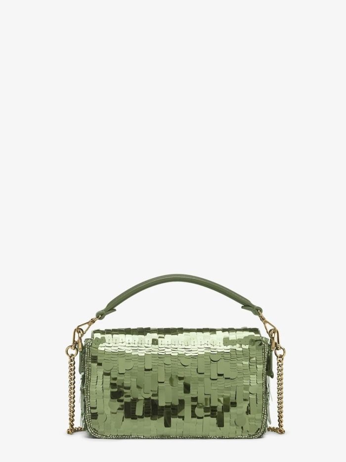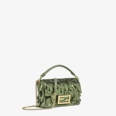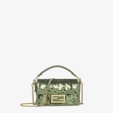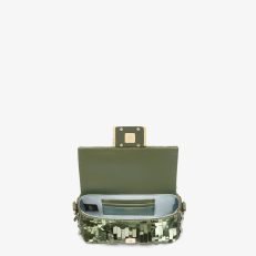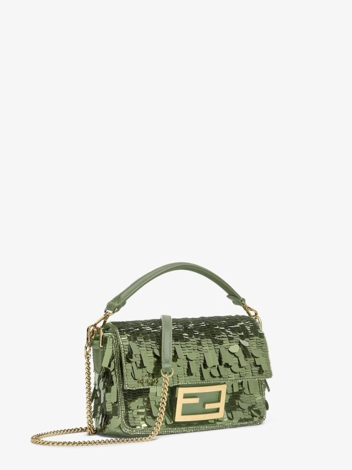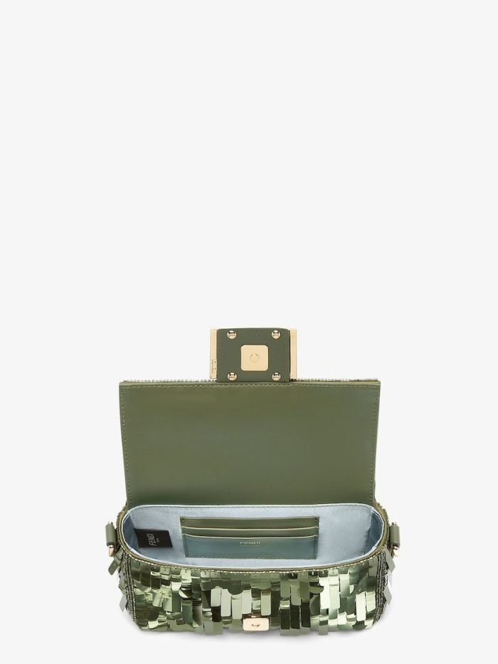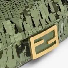 Iconic small Baguette bag hand-embroidered with green sequins of different shapes and sizes. Trimmed in green calfskin and embellished with an FF clasp.Featuring a front flap. magnetic clasp. brown satin-lined internal compartment with a leather pocket and gold-finish metalware.The bag can be carried by hand. or worn either on the shoulder or cross-body thanks to the handle and chain shoulder strap. both detachable.Holds a 6.7-inch smartphone. Mini Trifold card holder or wallet. keys and lipstick.Made in Italy