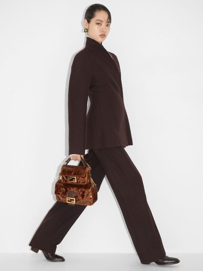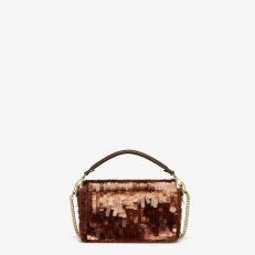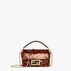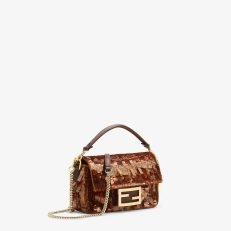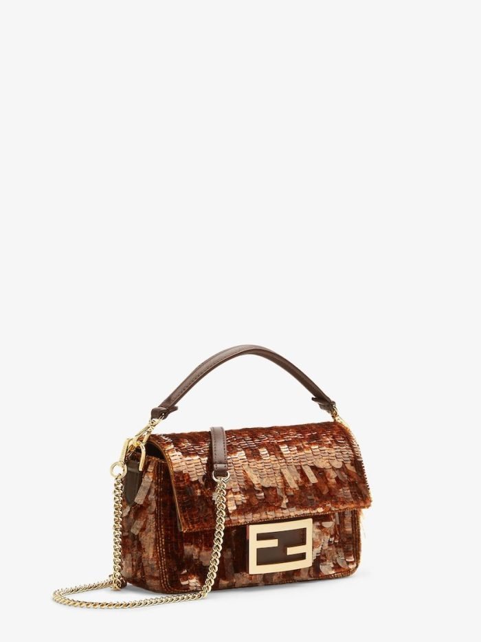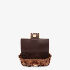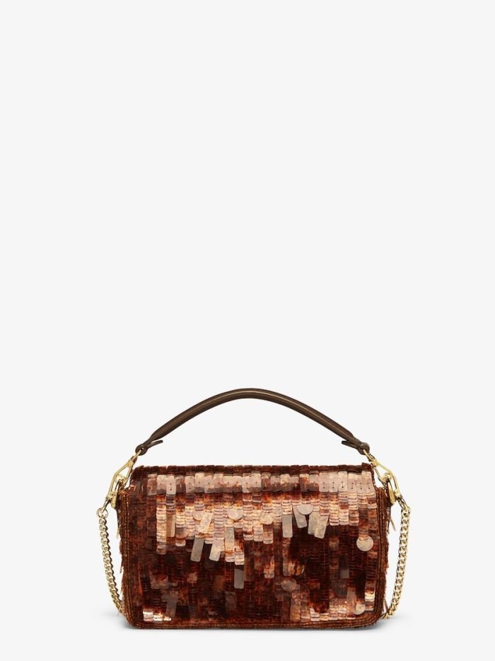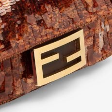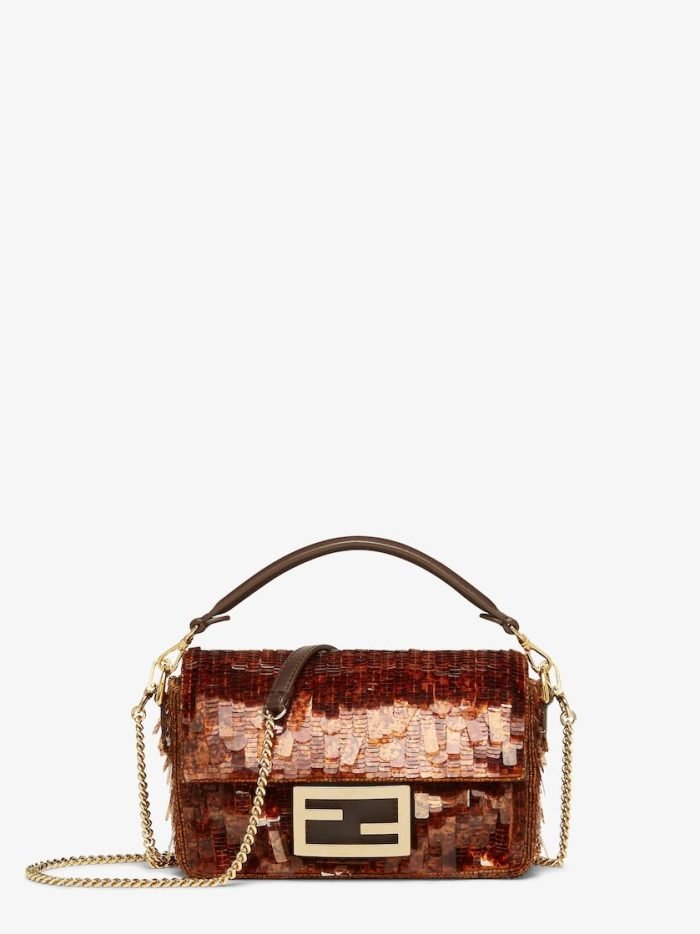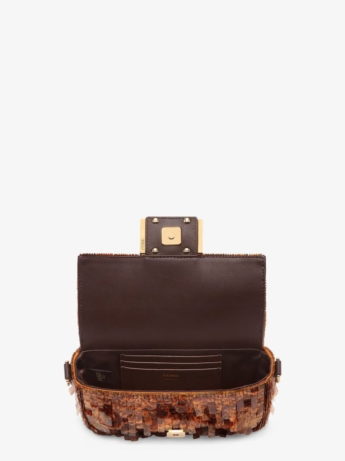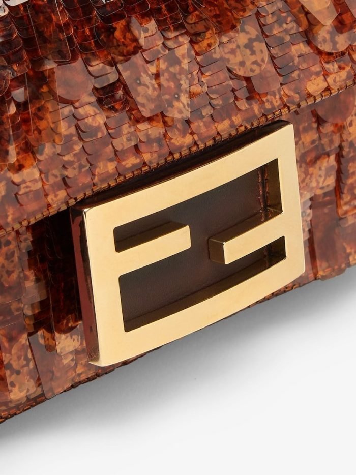 Iconic small Baguette bag hand-embroidered with brown. tortoiseshell-effect sequins of different shapes and sizes. Trimmed in brown calfskin and embellished with an FF clasp with plexiglass filling.Featuring a front flap. magnetic clasp. brown satin-lined internal compartment with a leather pocket and gold-finish metalware.The bag can be carried by hand. or worn either on the shoulder or cross-body thanks to the handle and chain shoulder strap. both detachable.Holds a 6.7-inch smartphone. Mini Trifold card holder or wallet. keys and lipstick.Made in Italy