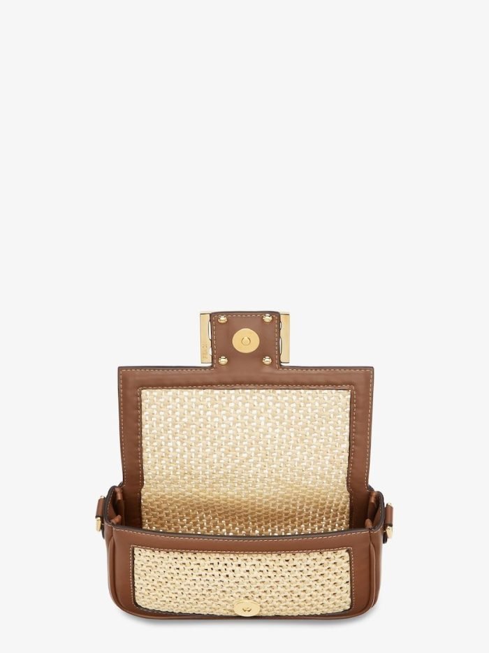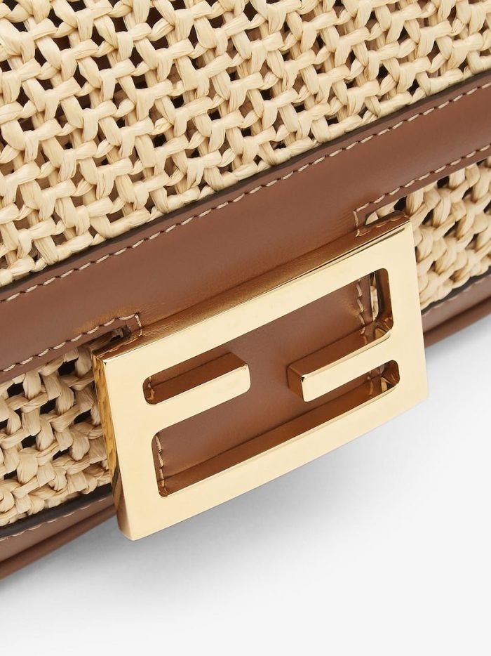Iconic small Baguette bag. made of natural-colored macram??. Trimmed in brown calfskin and embellished with an FF clasp.Featuring a front flap. magnetic clasp. unlined internal compartment and gold-finish metalware.The bag can be carried by hand. or worn either on the shoulder or cross-body thanks to the handle and chain shoulder strap. both detachable.
