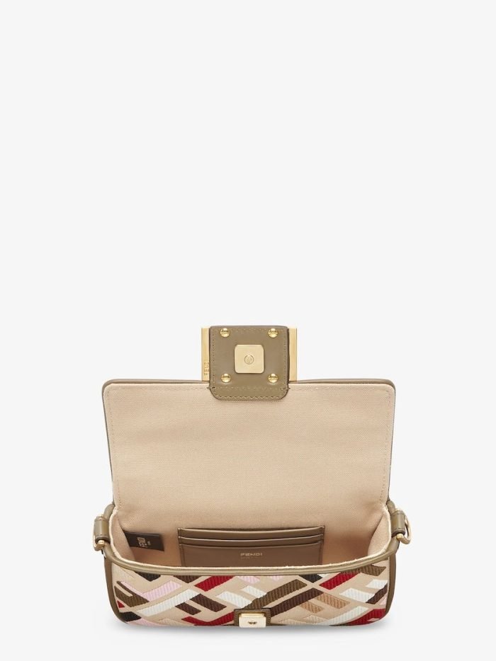 Iconic small Baguette bag made of beige canvas fabric with the iconic embossed FF motif embroidered in multicolor yarn. Trimmed in green calfskin and embellished with an FF clasp.Featuring a front flap. magnetic clasp. one canvas fabric-lined internal compartment with a calfskin pocket and gold-finish metalware.The bag can be carried by hand. or worn either on the shoulder or cross-body thanks to the handle and chain shoulder strap. both detachable.Holds a 6.7-inch smartphone. Mini Trifold card holder or wallet. keys and lipstick.