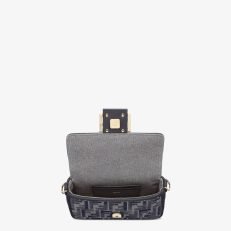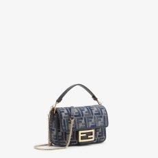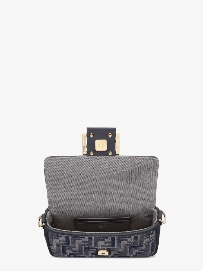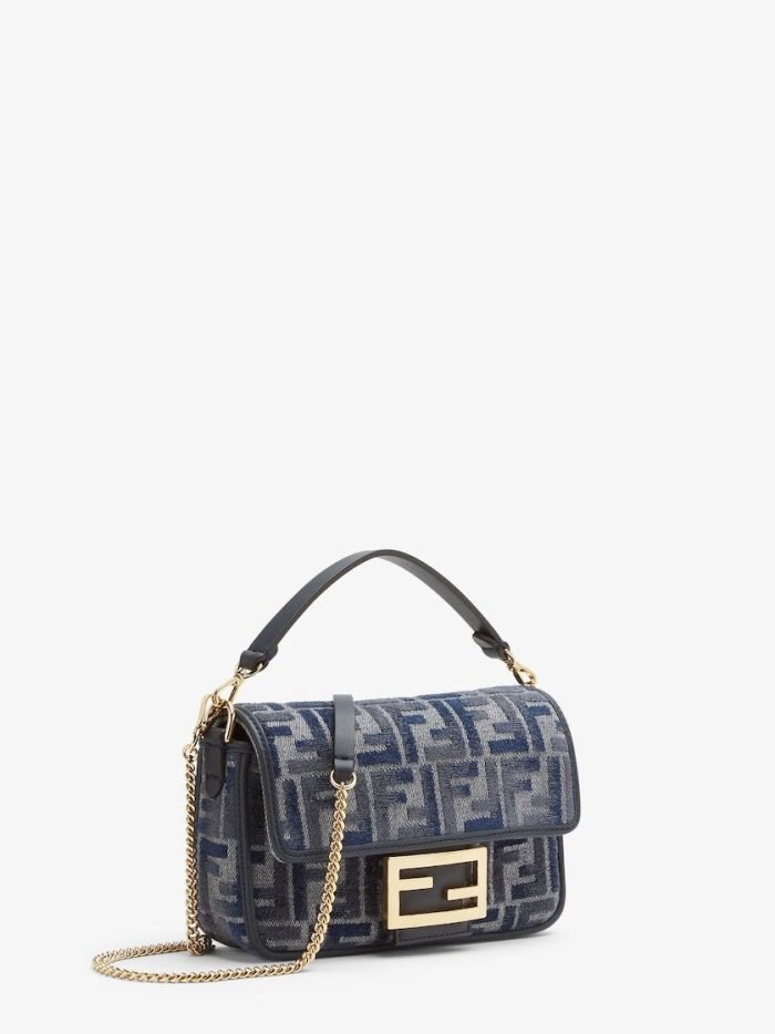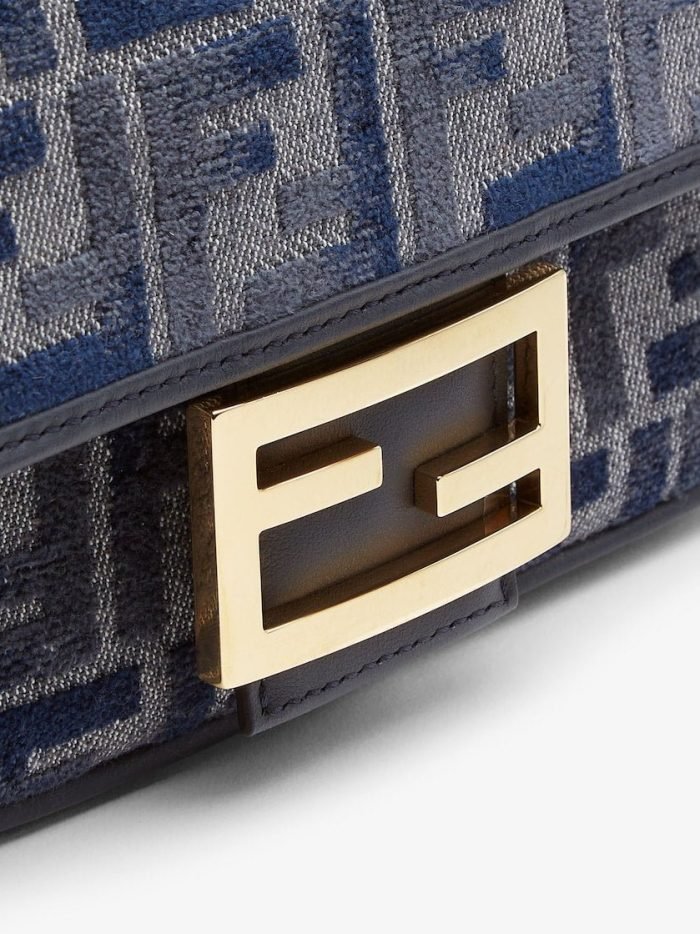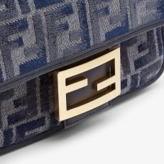 Small iconic Baguette bag made of chenille with the iconic FF motif in dark blue gradient tones. embellished with dark blue calfskin trim and decorated with an FF clasp.Featuring a front flap. magnetic clasp. one gray fabric-lined internal compartment with a calfskin pocket and gold-finish metalware.The bag can be carried by hand. or worn either on the shoulder or cross-body thanks to the calfskin handle and chain shoulder strap. both detachable.Holds a 6.7-inch smartphone. Mini Trifold card holder or wallet. keys and lipstick.Made in Italy
