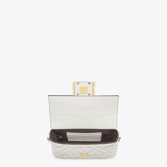 Small iconic Baguette bag made of soft. white nappa leather with a 3D-effect embossed iconic FF motif and embellished with an FF clasp.Features a front flap. magnetic clasp. fabric-lined internal compartment with a pocket and gold-finish metalware.The bag can be carried by hand. or worn either on the shoulder or cross-body thanks to the handle and chain shoulder strap. both detachable.Holds a 6.7-inch smartphone. Mini Trifold card holder or wallet. keys and lipstick.Made in Italy