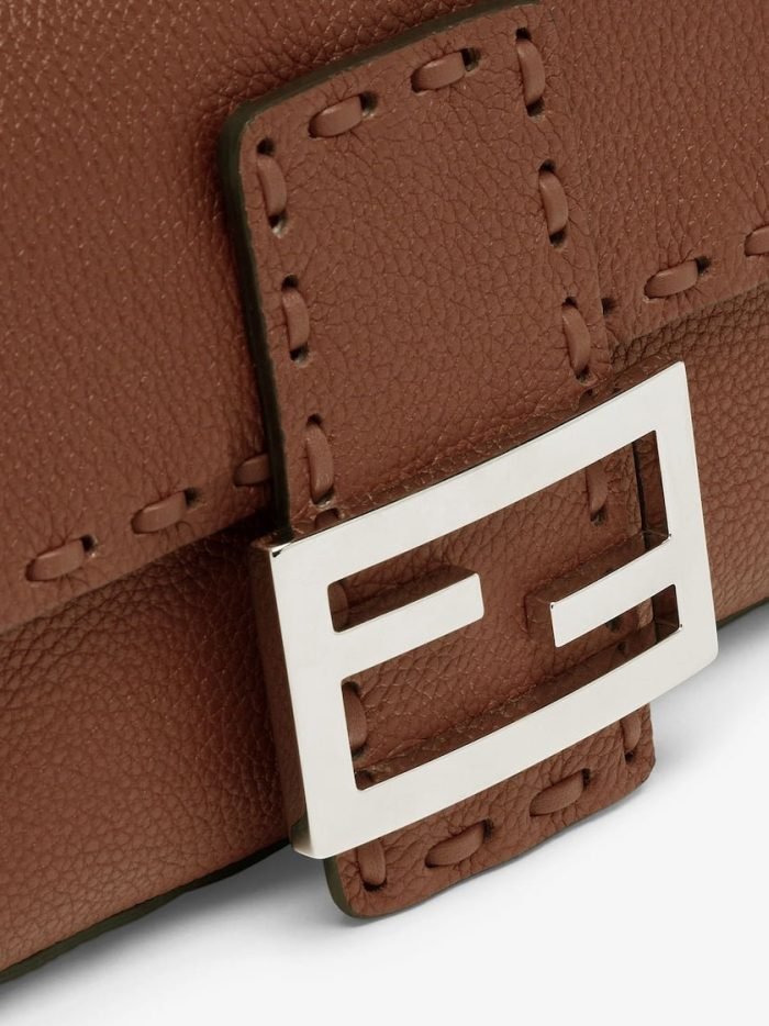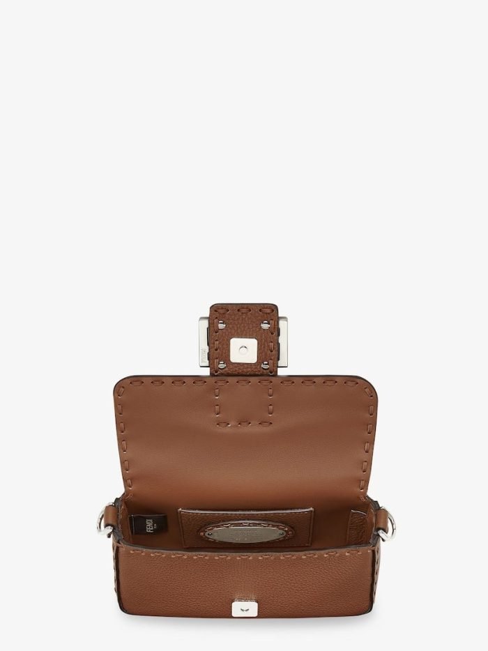 Mini iconic Baguette bag made with 309 tone-on-tone macro topstitches. an emblem of the iconic Selleria workmanship.Made of brown Cuoio Romano leather. calfskin with a characteristic natural grain. produced with a metal-free tanning process.Featuring a front flap. magnetic clasp. internal calfskin-lined compartment. internal pocket. silver Selleria plate. palladium-finish metalware.Decorated with an FF clasp.The bag can be carried by hand or worn on the shoulder thanks to the handle and shoulder strap. both detachable.