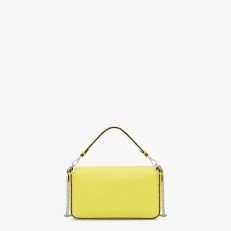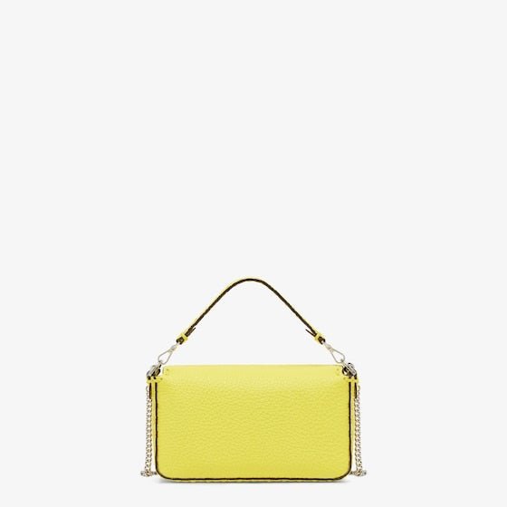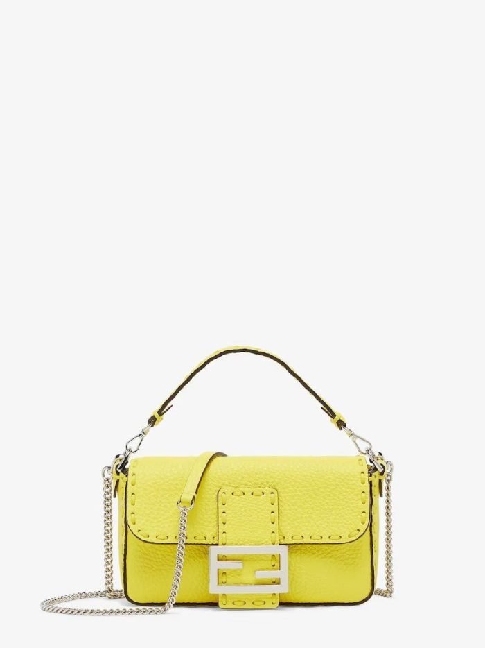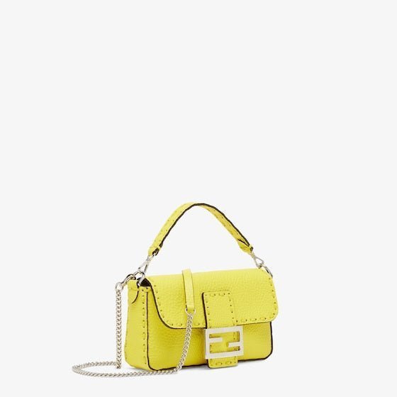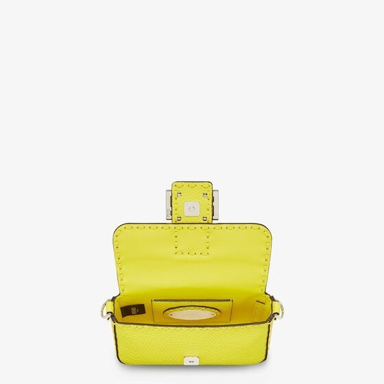 Mini iconic Baguette bag made with 309 tone-on-tone macro topstitches. an emblem of the iconic Selleria workmanship.Made of acid yellow Cuoio Romano leather. calfskin with a characteristic natural grain. produced with a metal-free tanning process.Featuring a front flap. magnetic clasp. internal calfskin-lined compartment. internal pocket. silver Selleria plate. palladium-finish metalware.Decorated with an FF clasp.The bag can be carried by hand or worn on the shoulder thanks to the handle and shoulder strap. both detachable.Made in Italy