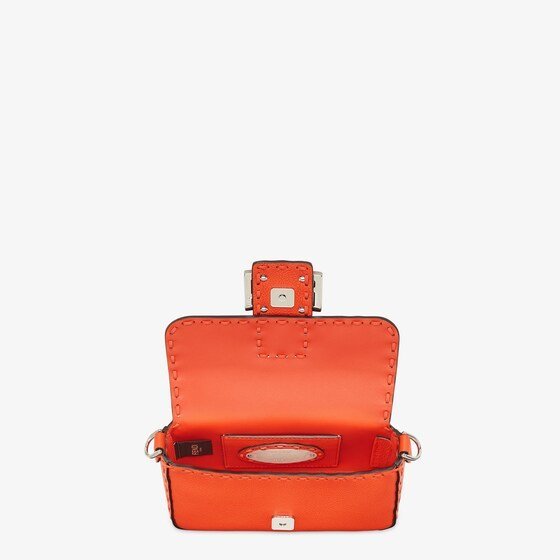 Mini iconic Baguette bag made with 309 tone-on-tone macro topstitches. an emblem of the iconic Selleria workmanship.Made of red Cuoio Romano leather. calfskin with a characteristic natural grain. produced with a metal-free tanning process.Featuring a front flap. magnetic clasp. internal calfskin-lined compartment. internal pocket. silver Selleria plate. palladium-finish metalware.Decorated with an FF clasp.The bag can be carried by hand or worn on the shoulder thanks to the handle and shoulder strap. both detachable.