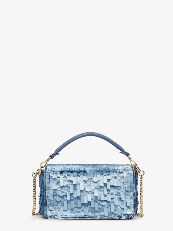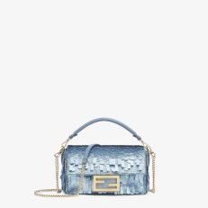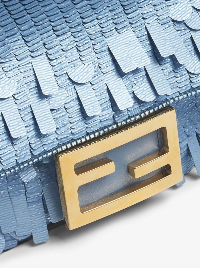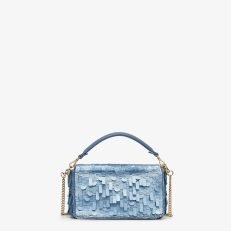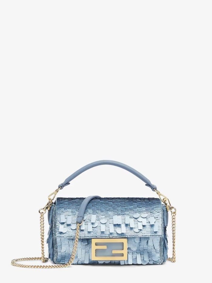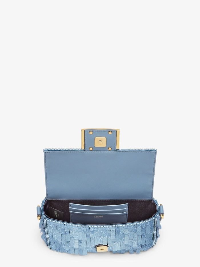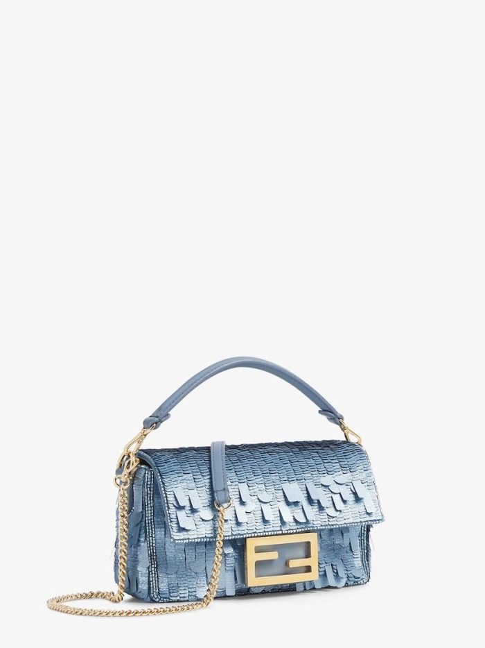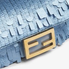 Iconic small Baguette bag. embroidered with light blue sequins of different shapes and sizes with a denim-effect finish. Trimmed in light blue calfskin and embellished with an FF clasp.Featuring a front flap. magnetic clasp. satin-lined internal compartment with a leather pocket and gold-finish metalware.The bag can be carried by hand or worn either on the shoulder or cross-body thanks to the handle and chain shoulder strap. both detachable.Holds a 6.7-inch smartphone. Mini Trifold card holder or wallet. keys and lipstick.Made in Italy