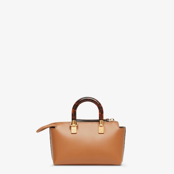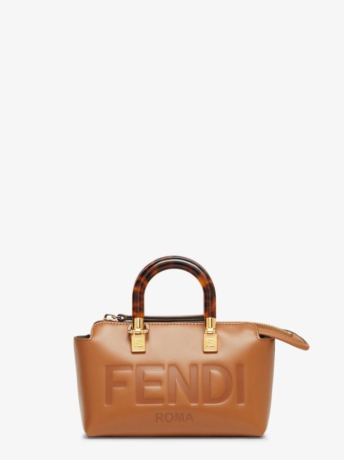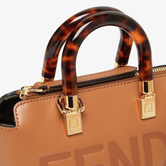 Iconic mini By The Way Boston bag made of brown leather with hot-stamped FENDI ROMA lettering and rigid tortoiseshell-effect plexiglass handles. Zip fastening.Featuring an interior lined in FF fabric with a zip pocket and gold-finish metalware.The bag can be carried by hand with the handles. or worn either on the shoulder or cross-body with the adjustable. detachable shoulder strap.