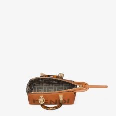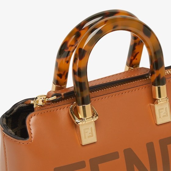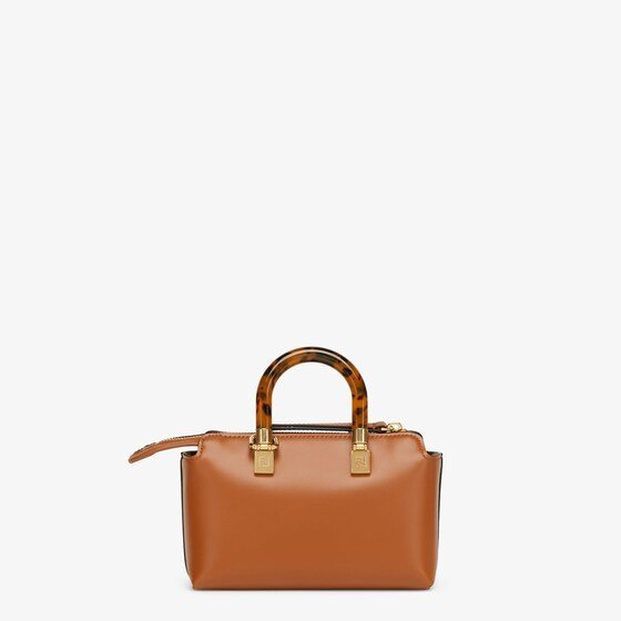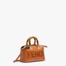 Iconic mini By The Way Boston bag made of brown leather with hot-stamped FENDI ROMA lettering and rigid tortoiseshell-effect plexiglass handles. Zip fastening.Featuring a fabric-lined interior with a pocket and gold-finish metalware.The bag can be carried by hand with the handles. or worn either on the shoulder or cross-body with the detachable shoulder strap.