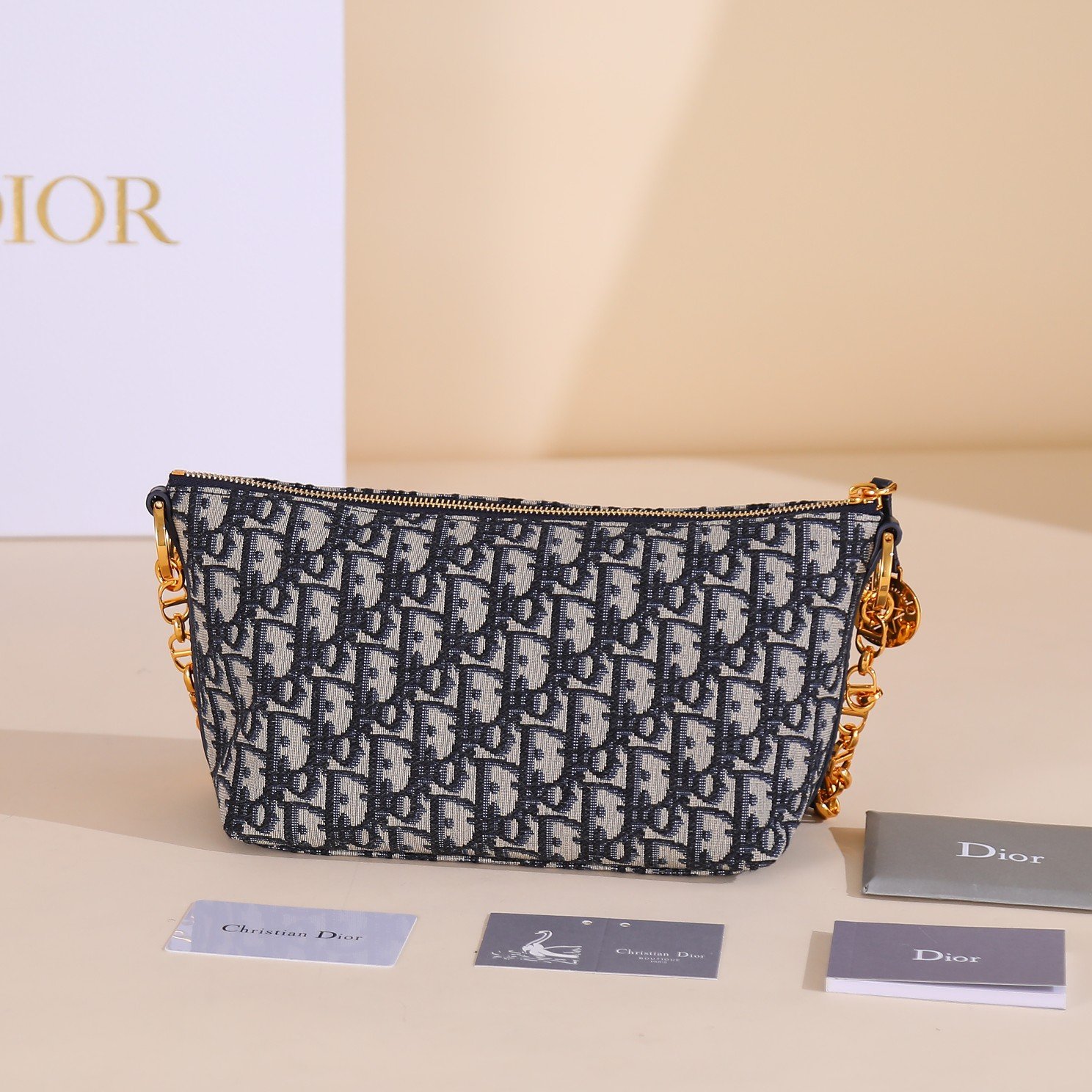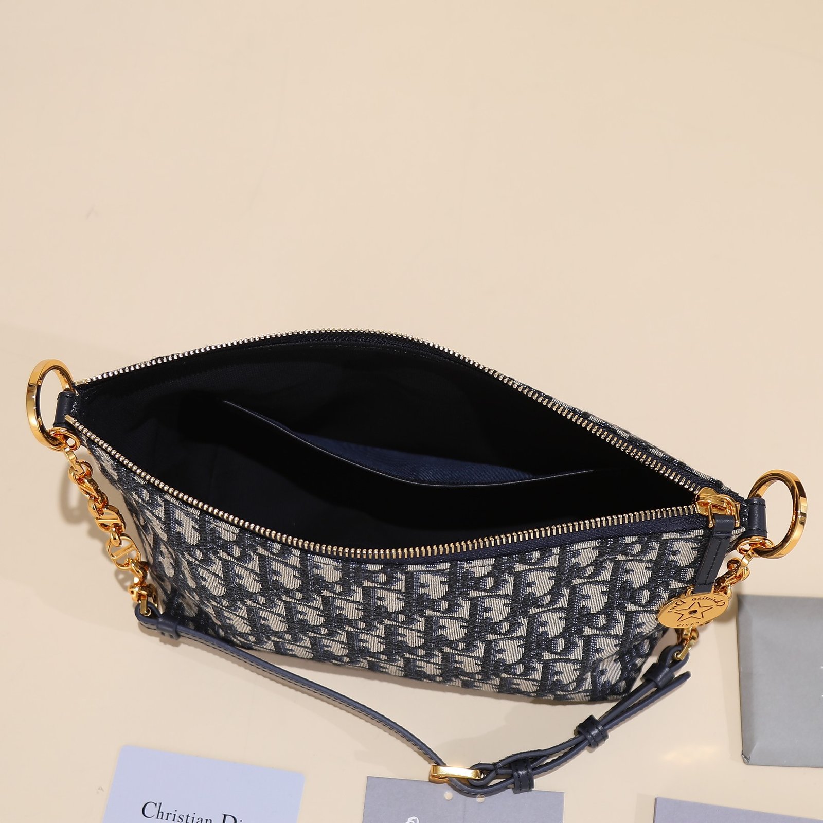 New to the Spring/Summer 2024 ready-to-wear collection, the Diorstar Hobo chain bag is both stylish and practical. Crafted from jacquard fabric with a blue oblique print, it has a soft silhouette and spacious compartments. Zip closure with a round plaque engraved with the Christian Dior Paris logo and the classic Dior star logo, and a delicate CD rivet on the side for added style. The interior is lined with suede cowhide and has card slots. It has an adjustable CD chain shoulder strap with a leather strap for increased comfort when carried on the shoulder. Zip closure with a round plaque engraved with the Christian Dior Paris logo and the star.
