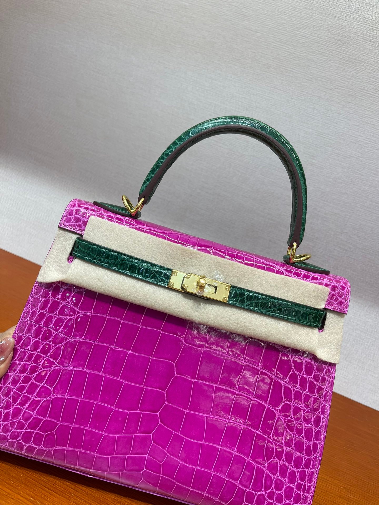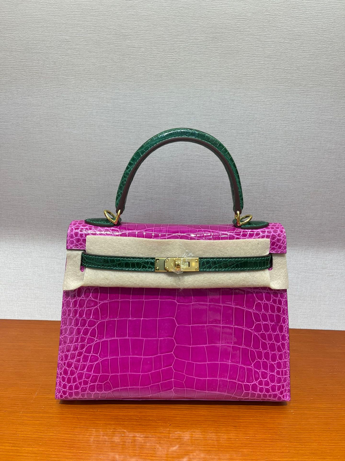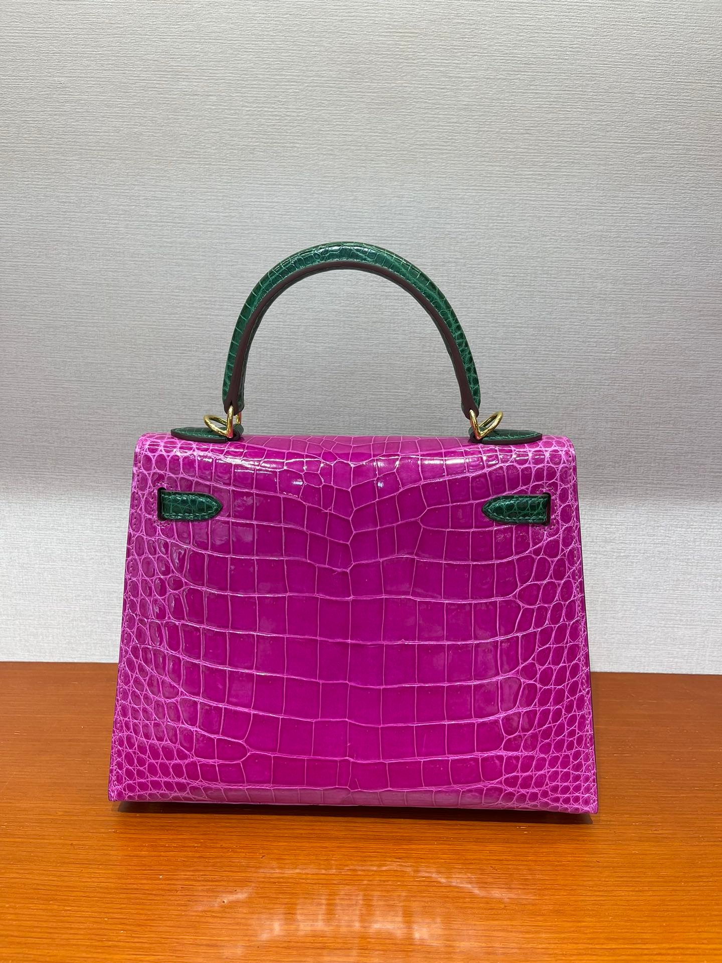 kelly 25 high-gloss crocodile leather Arabian Nights purple/emerald~gold Top craftsmanship hand-sewn wax thread sheepskin lining