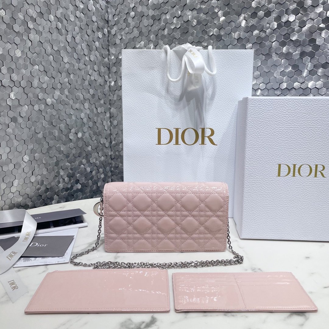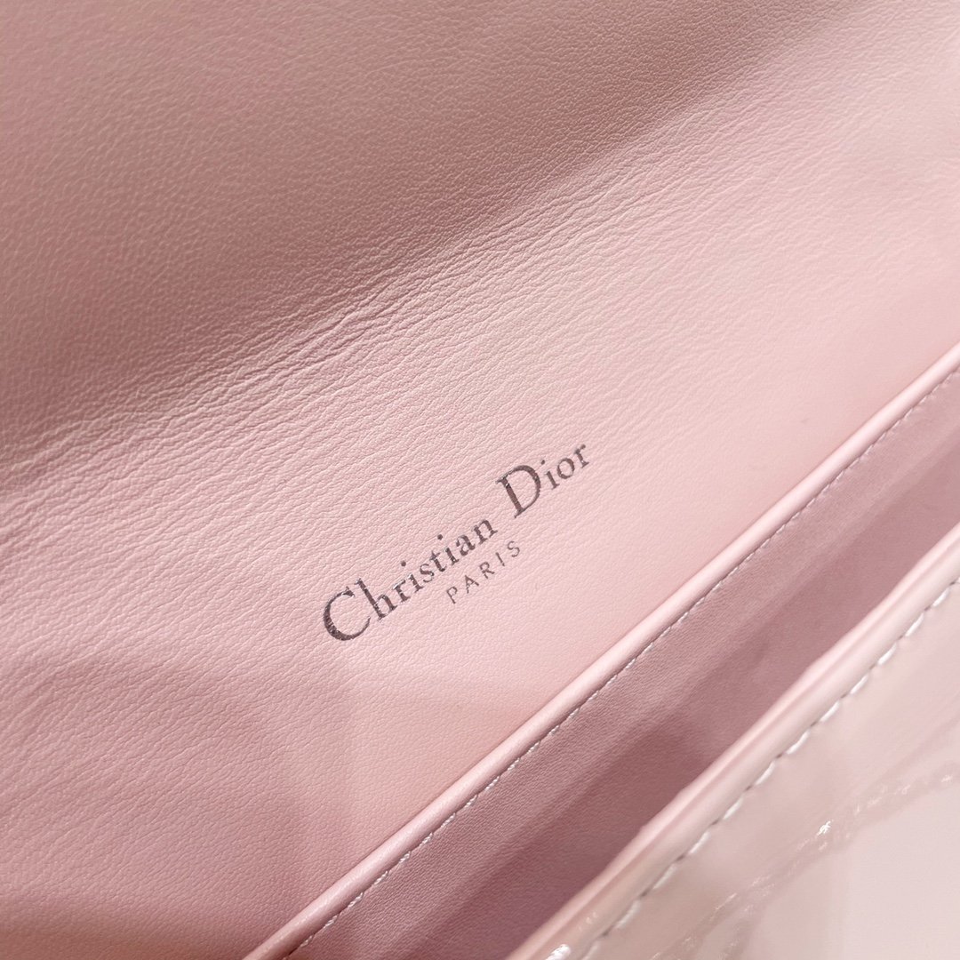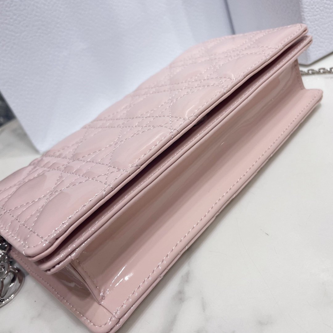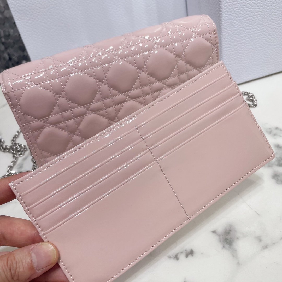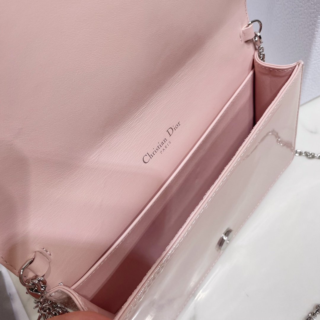Lady dior Cannage patent leather chain clutch, Cannage stitching decoration, with light gold metal accessories, detachable chain, large internal compartment, 1 flat pocket, 2 detachable parts: 1 zipper pocket, 1 pocket containing 8 card holders and 1 flat pocket