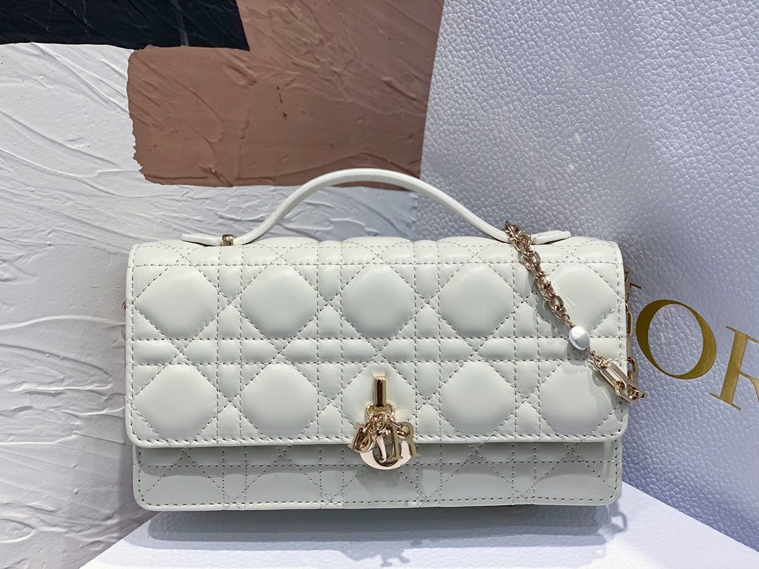 This clutch is new this season, with a top handle, elegant and practical, enriching the Lady Dior collection. Crafted from white lambskin leather, decorated with a rattan pattern, the flap design is enhanced with a D.I.O.R. charm. The practical style has multiple compartments and card slots to store various daily necessities, making it an ideal companion for day and evening wear. The top handle and the detachable chain are embellished with beads for a more refined look, and can be carried by hand or cross-body. Size: 21.11.4 cm
