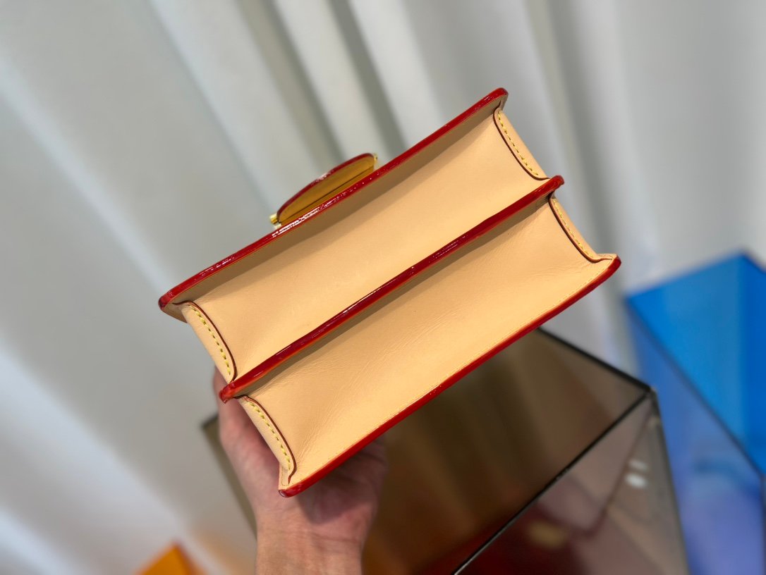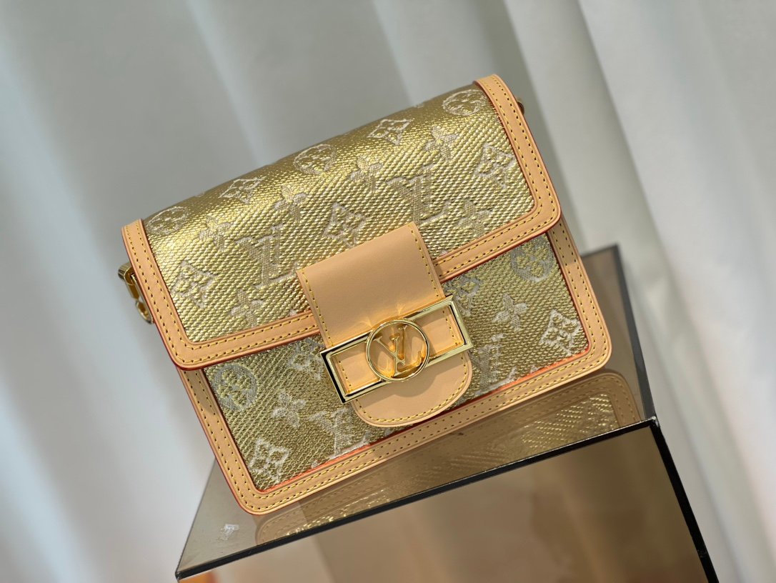 M22826 Gold Daphne Collection This Dauphine mini handbag is made of Monoglam canvas, with a coated jacquard canvas showing a shiny metallic luster. The cowhide leather trim and LV Circle magnetic buckle add a luxurious charm to the chic configuration. The detachable and adjustable leather shoulder strap adds a variety of carrying methods. Detailed Features 20 x 15 x 9 cm (length x height x width)