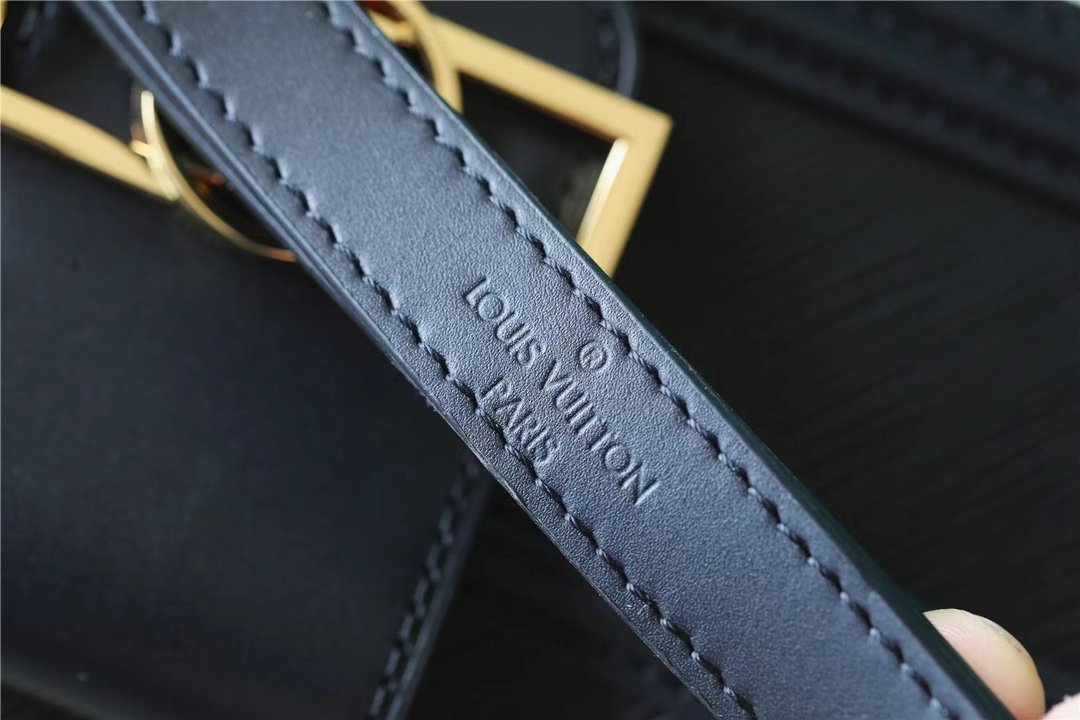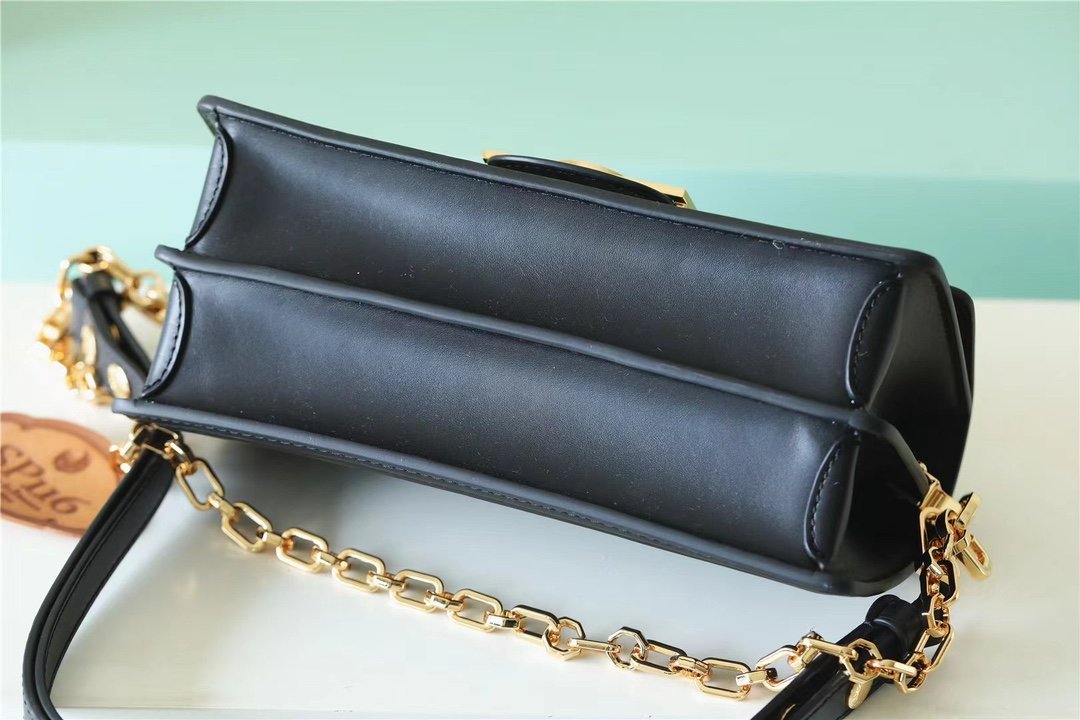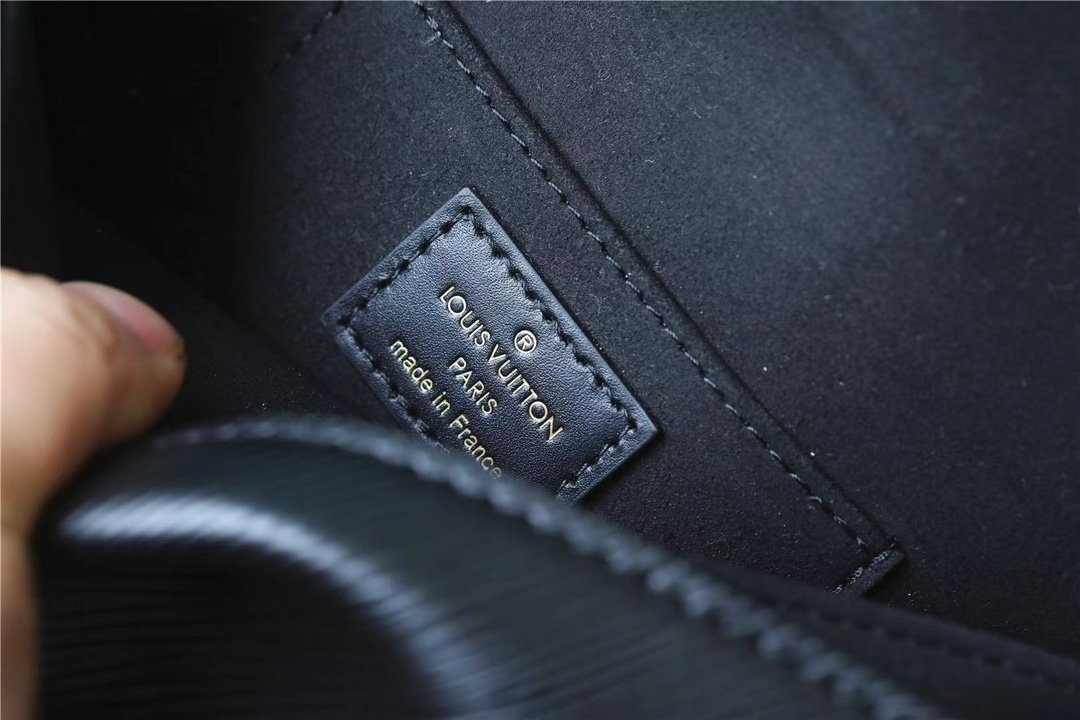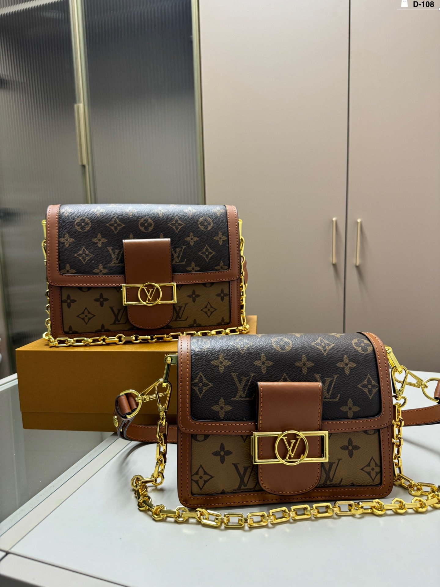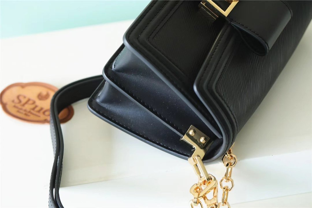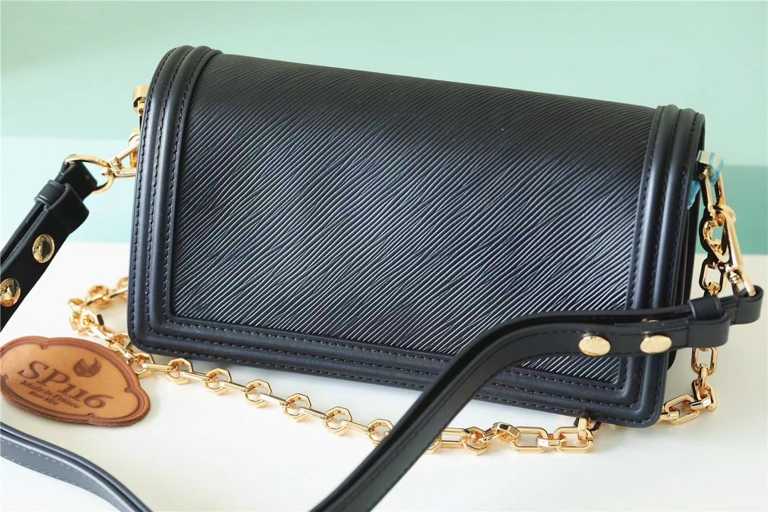 DAUPHINE EAST WEST BAG This Dauphine East-West bag is slender in Epi grain leather. The LV Circle logo and the bold chain links convey a metallic texture, the latter with beaded decoration. The Dauphine horizontal version of the Dauphine oo [handshake] [handshake] has two compartments inside, one of which has a patch pocket. Both the chain and leather shoulder straps are removable, providing a variety of carrying options.
