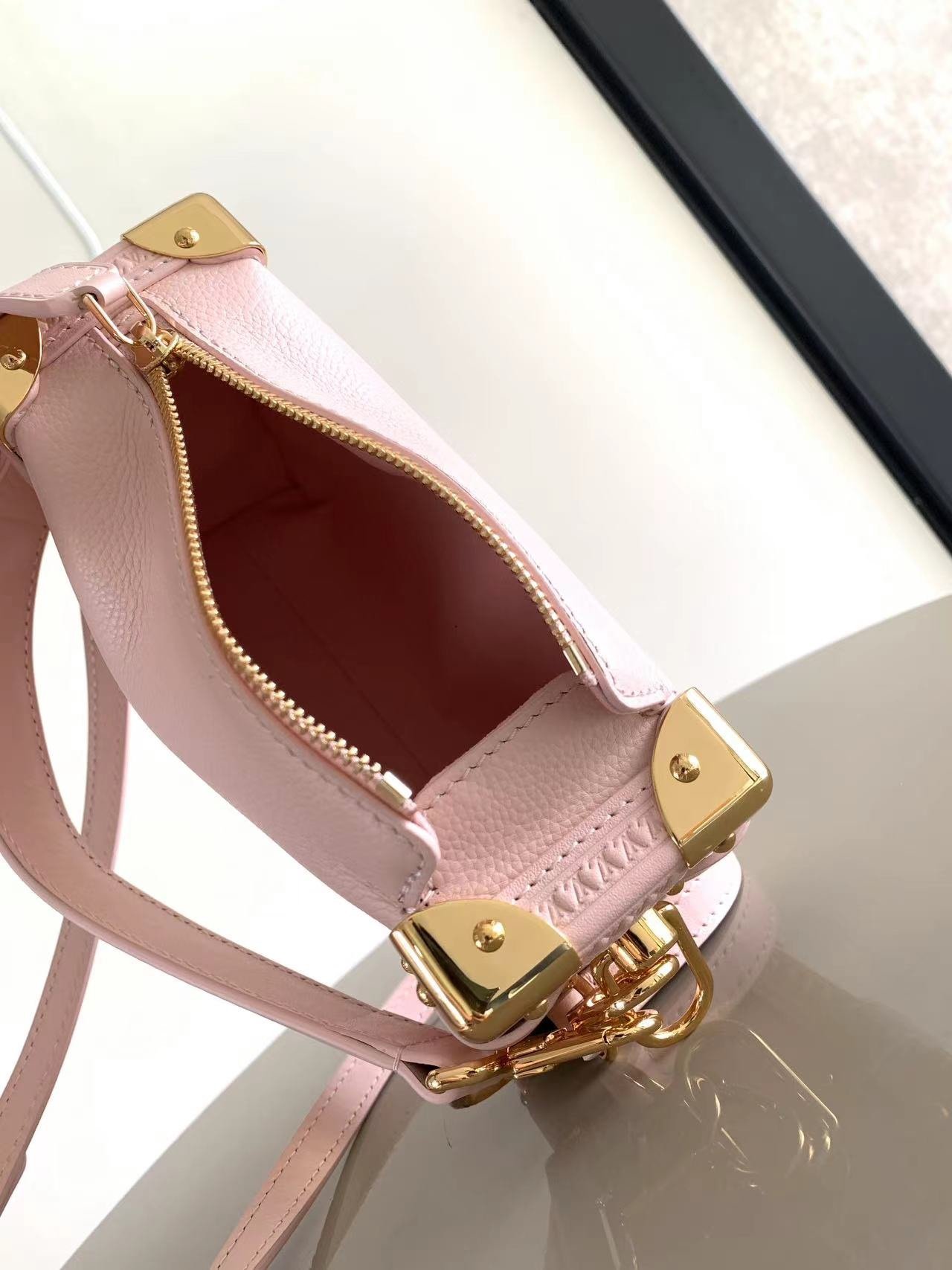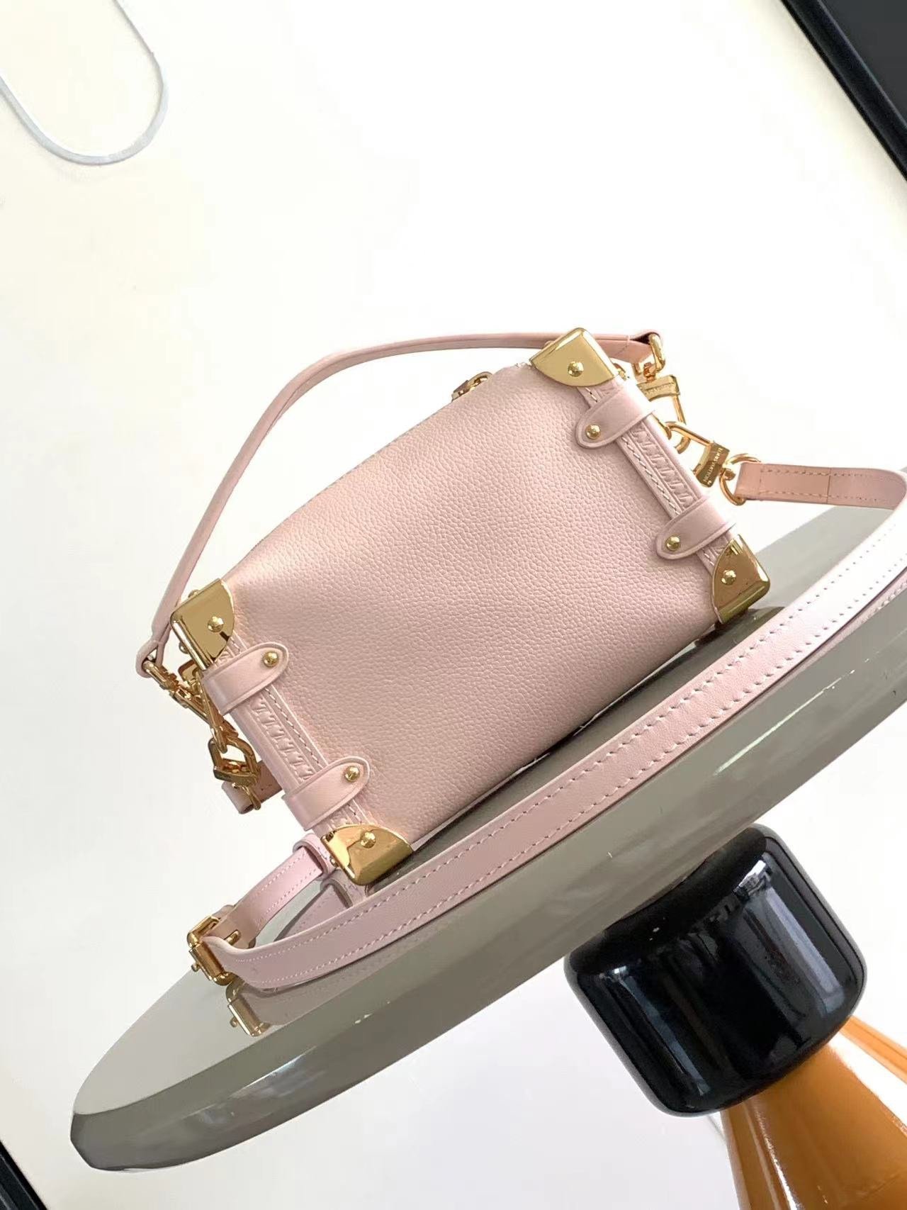 This small Side Trunk bag is made of grained cowhide leather with an S-lock clasp and corners, inspired by the brand’s traditional trunks. The leather handles and adjustable leather shoulder strap are both removable, providing a variety of carrying options. It can accommodate a wallet, large smartphone, keys and lipstick.