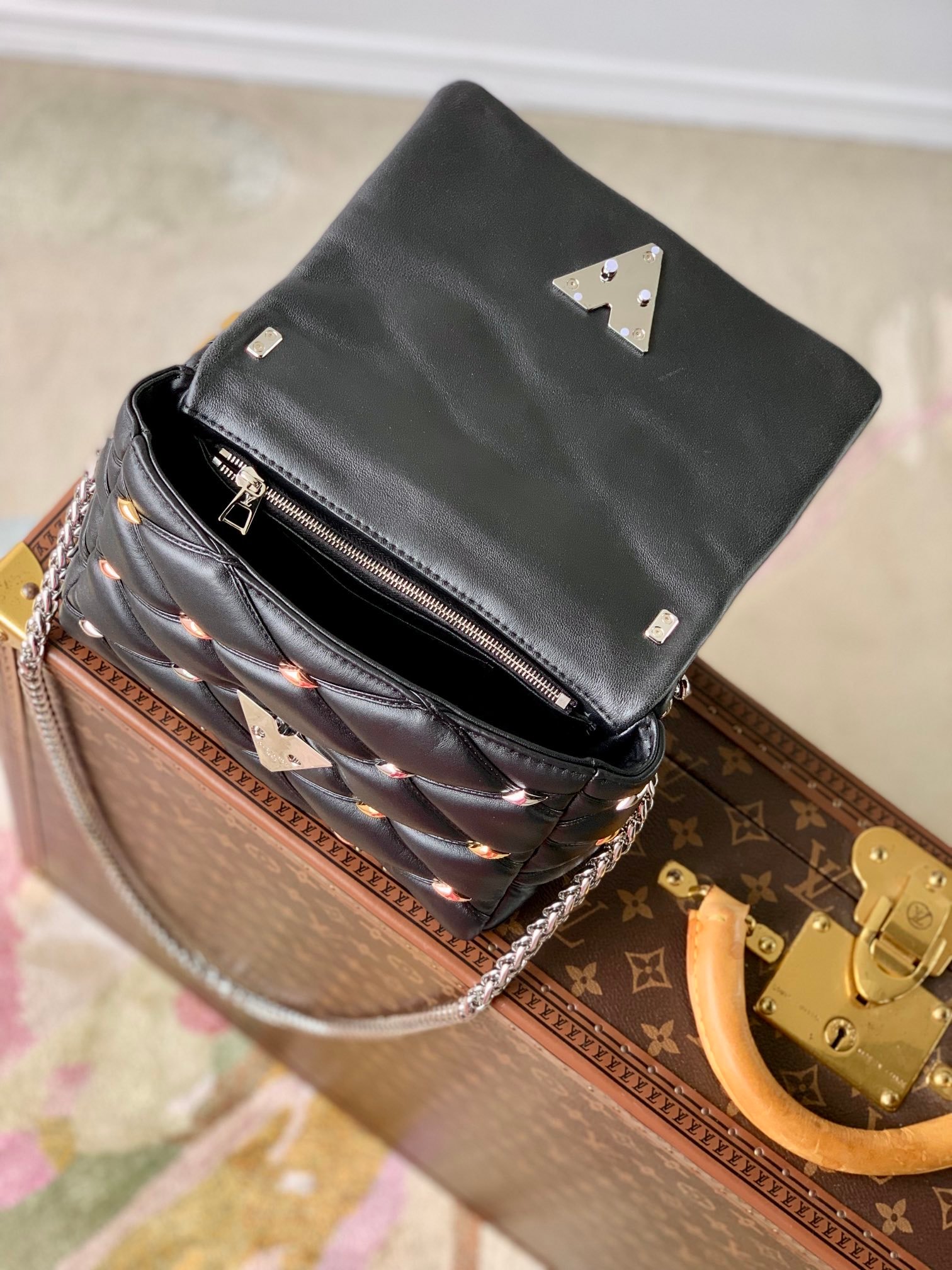 The GO-14 Medium Bag is quilted lambskin with a striking Malletage pattern, a testament to the House’s craftsmanship. Detailed metal studs and the LV Twist lock add a touch of brilliance, while the removable handle and adjustable sliding chain allow for expanded carrying options.