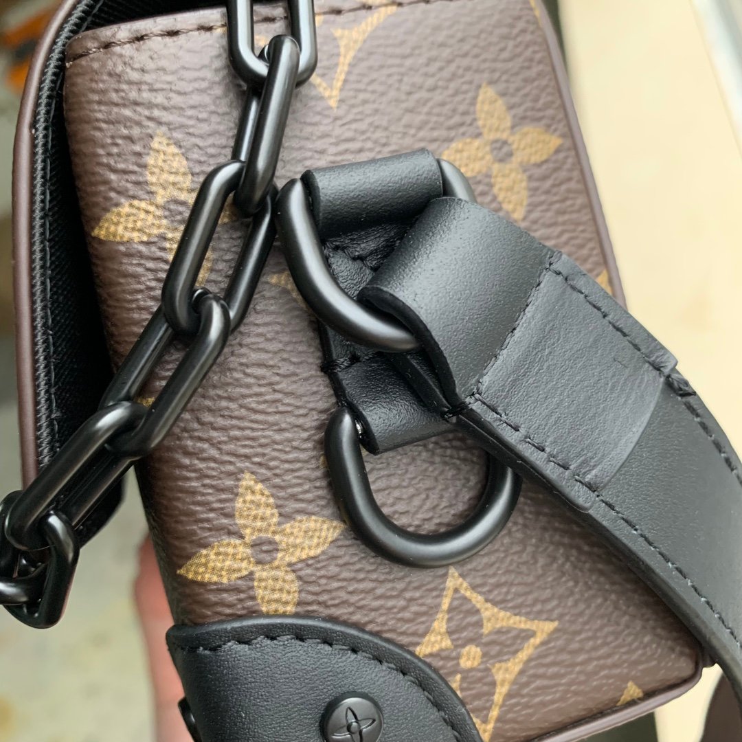 This Steamer mini bag is made of Monogram Macassar canvas and is recognizable with decorative chains and pins. The reinforced corners trace back to the brand’s box-making tradition, the magnetic buckle design makes it easy to take and put small items, and the adjustable shoulder strap allows for shoulder or crossbody options.