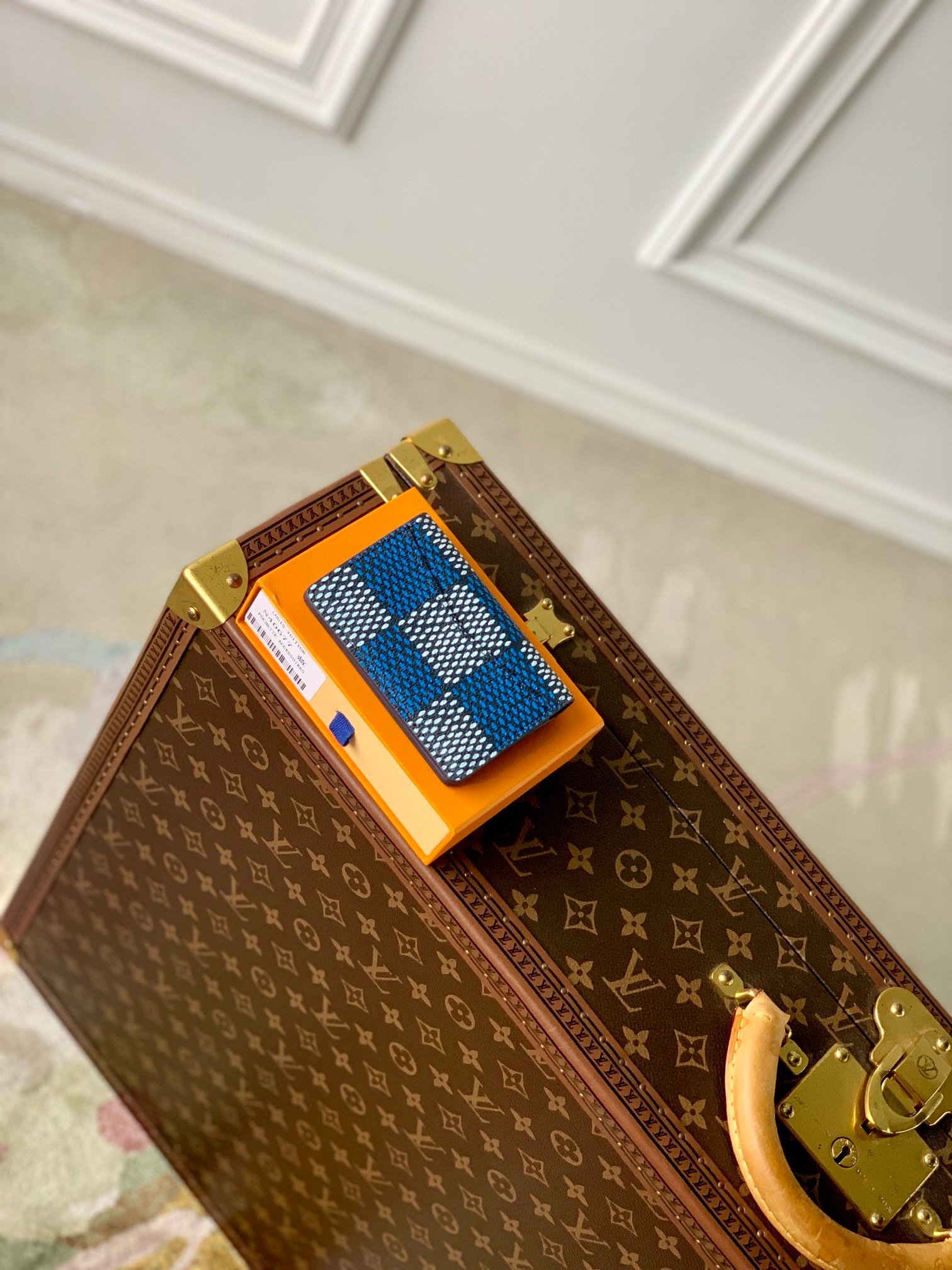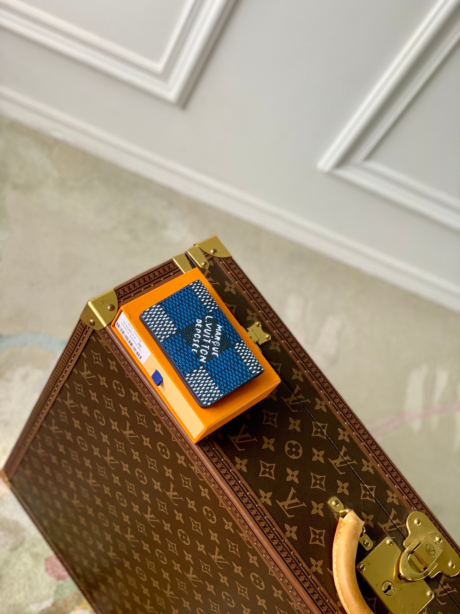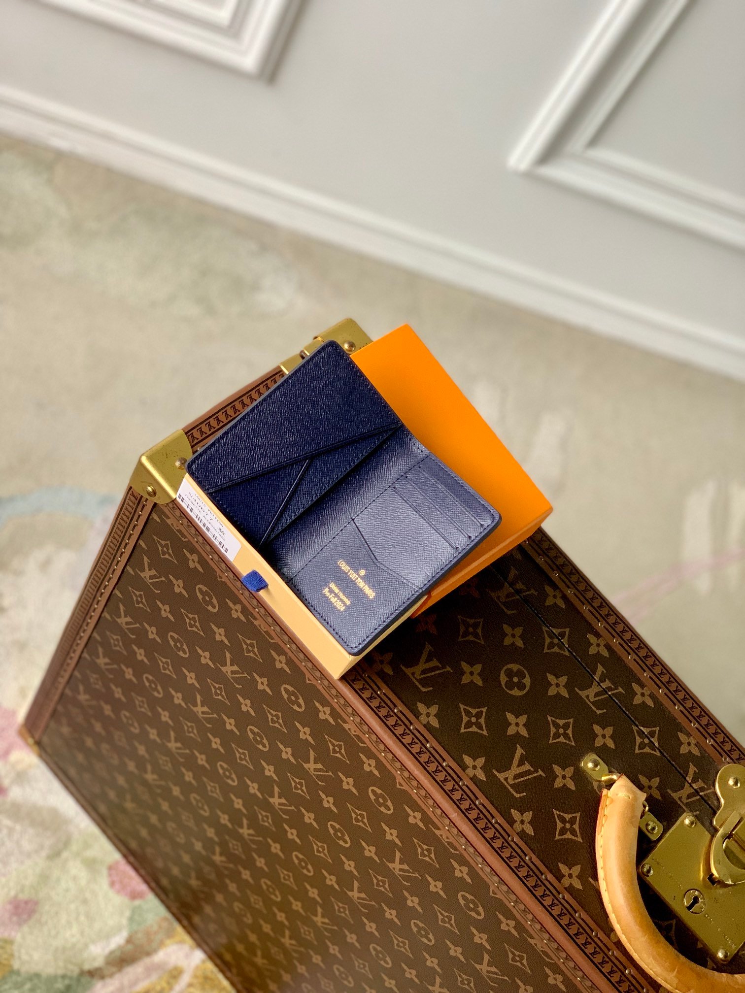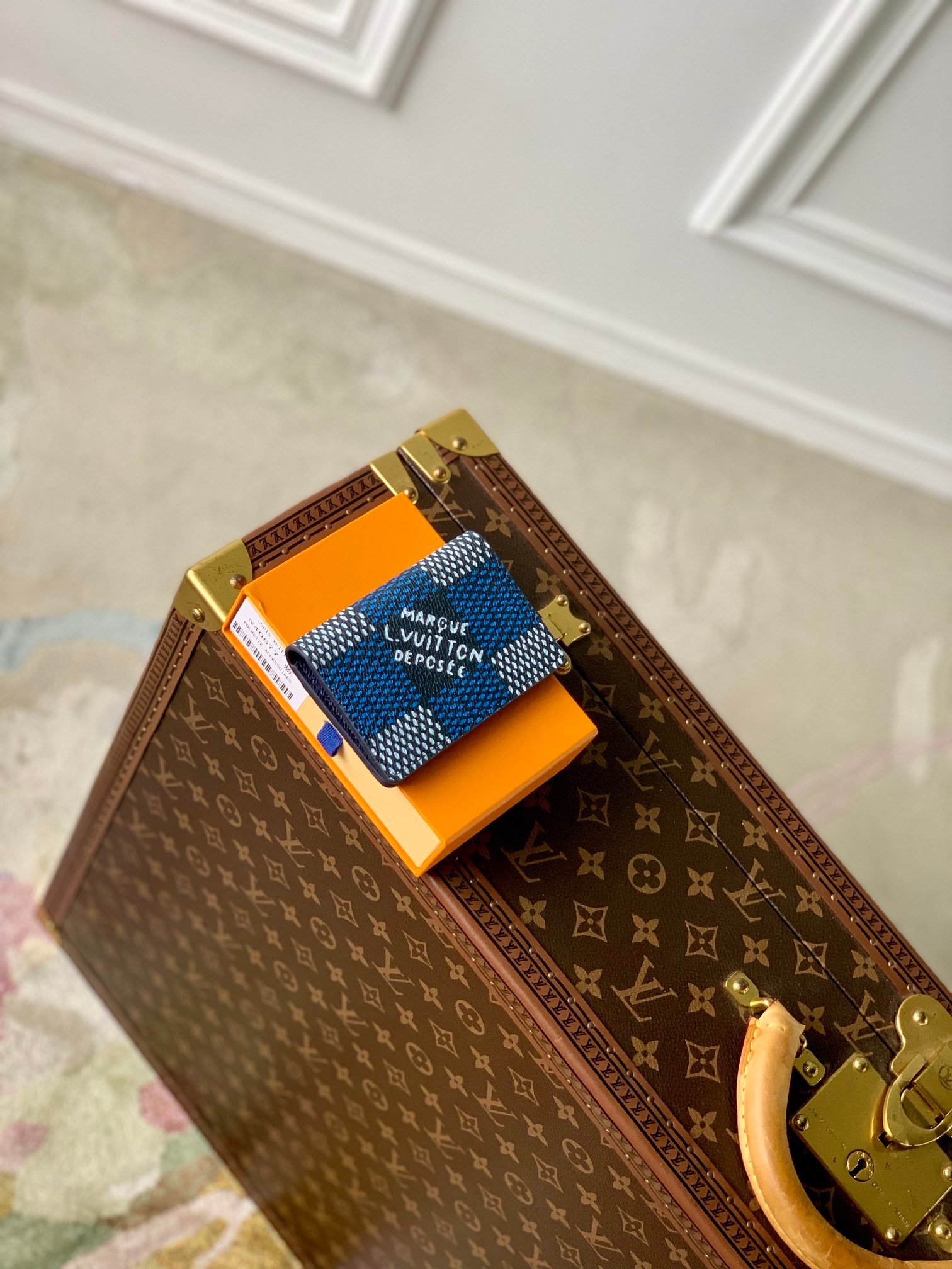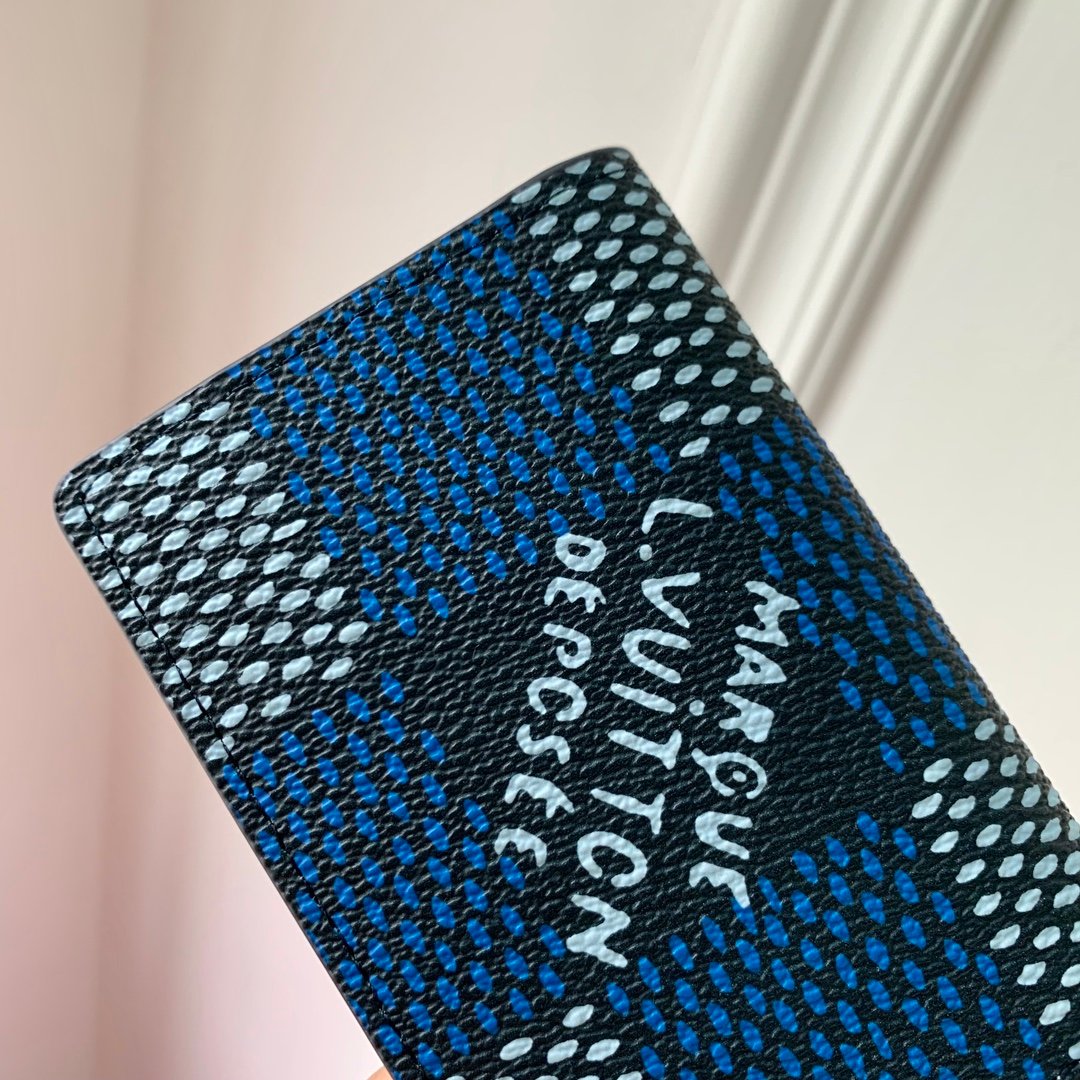 This Damier Heritage canvas pocket organizer has an oversized pattern with the words "Marque L. Vuitton Déposée" in the center. The style of the Damier tile was inspired by the original finish of the pattern. This small wallet has three slots for cards, five inner pockets and one outer pocket.