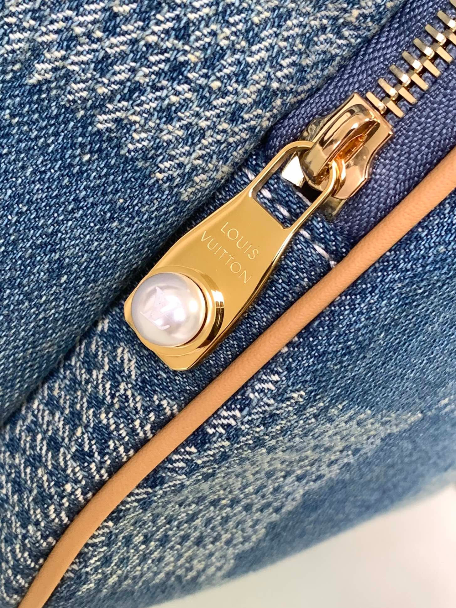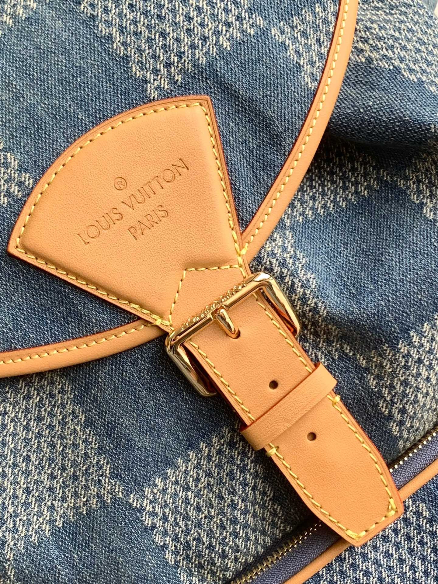 N40708 Top original Montsouris backpack combines Monogram yellow leather with patterns on faded denim, creating a personalized choice beyond the classic design. Drawstring to gather the soft structure, the vintage label comes from the brand’s collection. 32.0 x 40.0 x 19.0 cm (length x height x width)