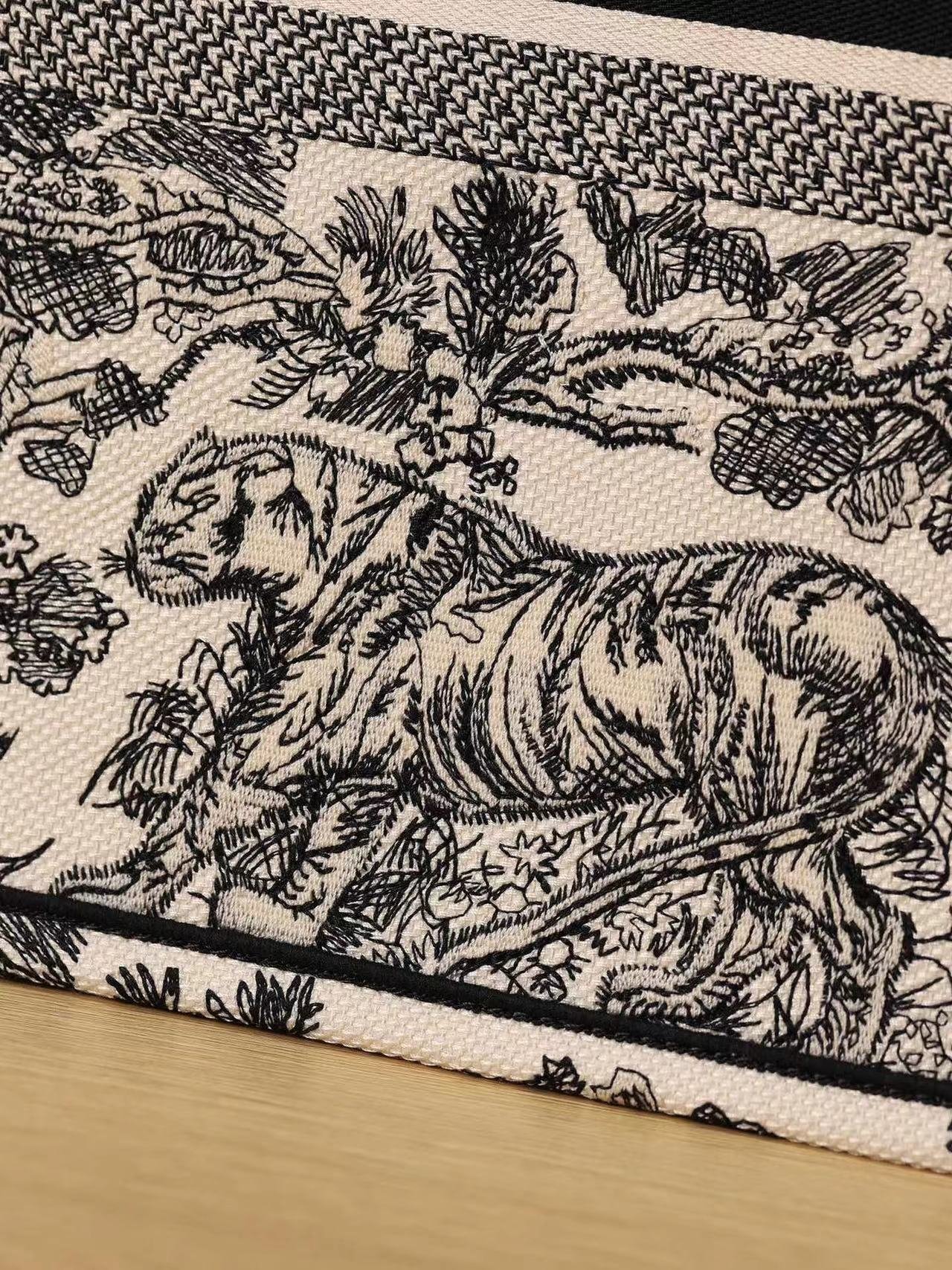 It holds all your daily essentials and is embroidered with the black Jouy print all over and the "CHRISTIAN DIOR" signature on the front.