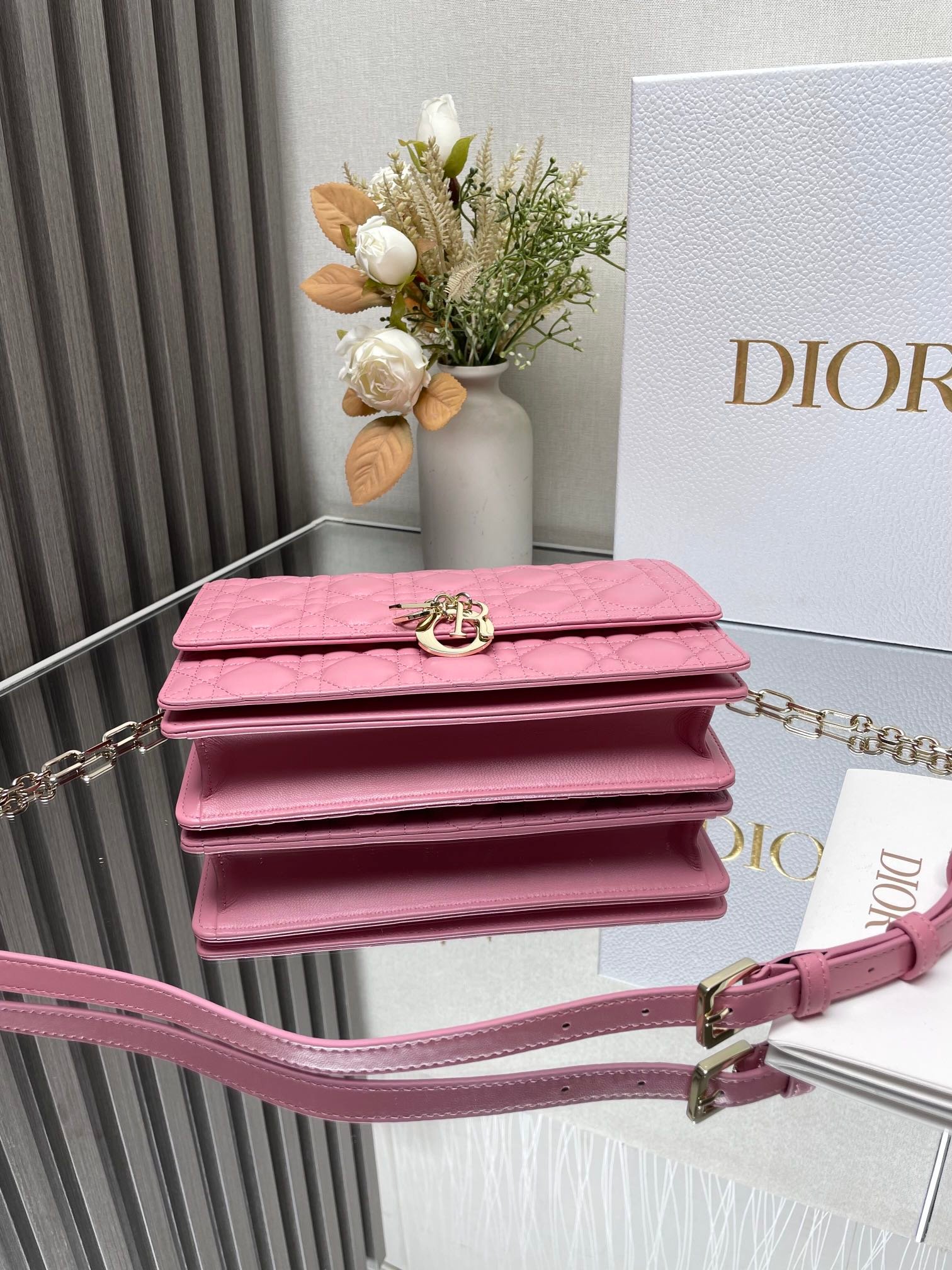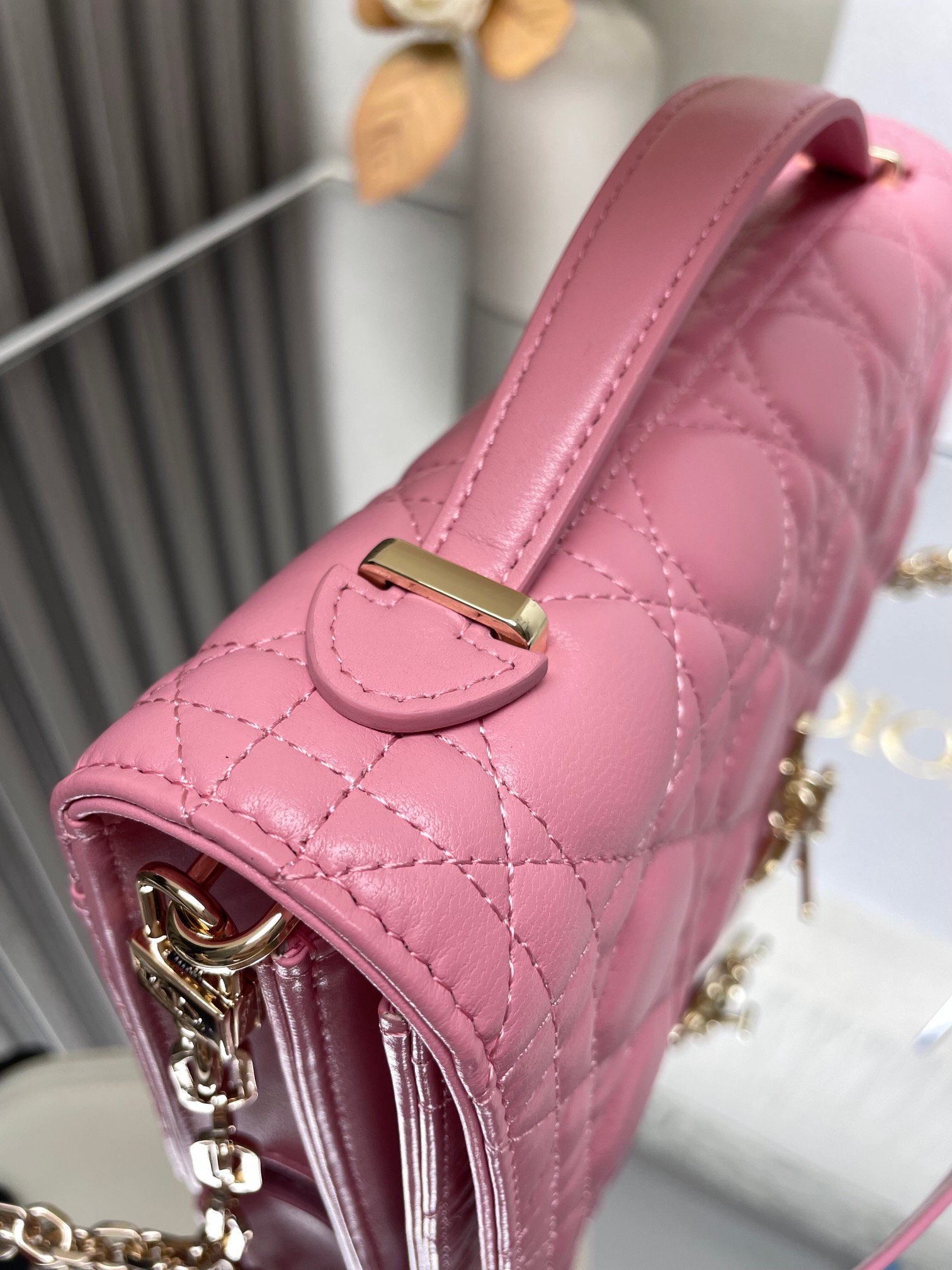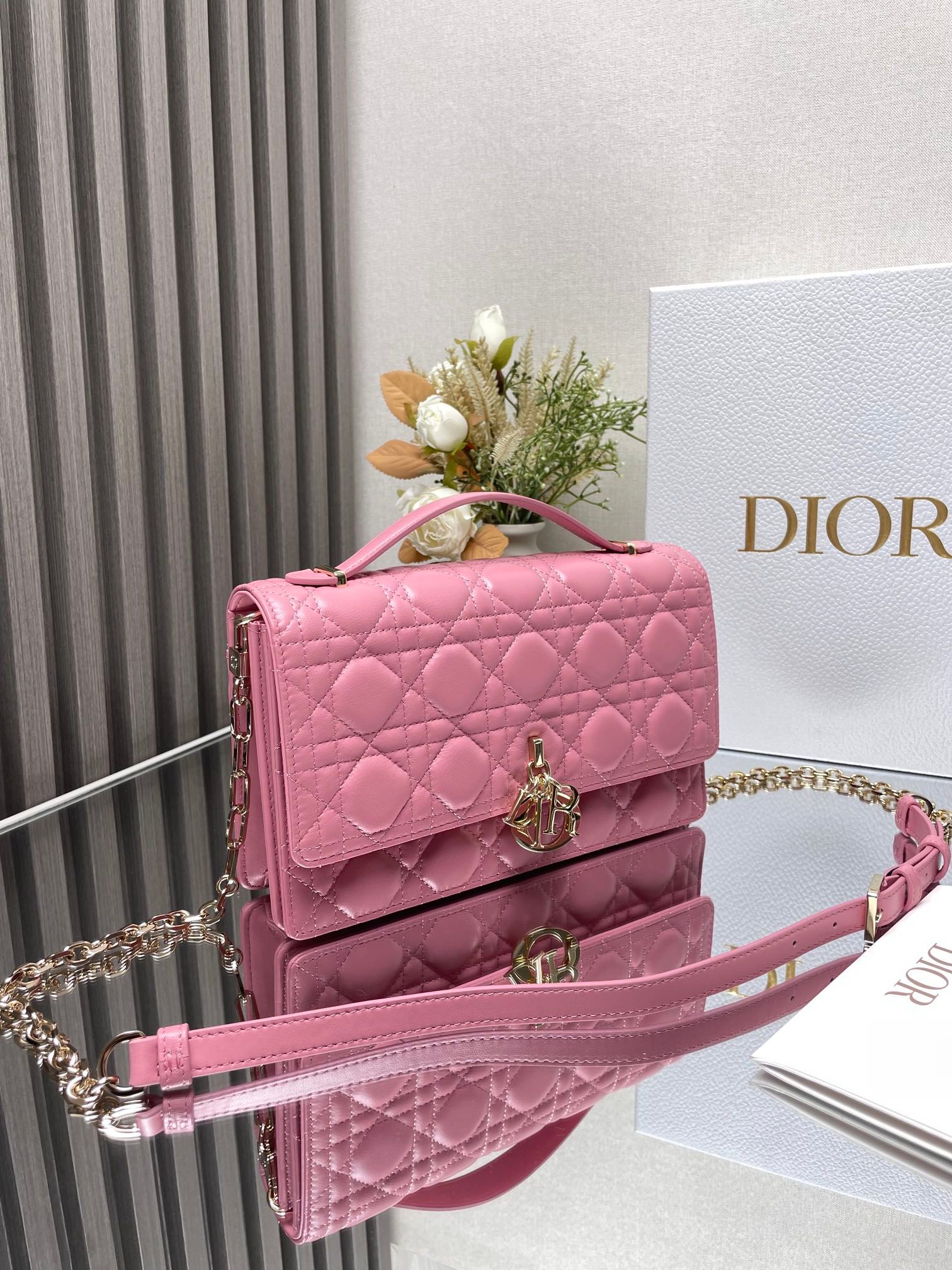 MISS DIOR Handbag Model: 0605 Pink Lambskin New to the Early Spring 2024 collection, this Miss Dior tote is elegant and functional. Crafted in black lambskin leather with rattan check stitching and a flap embellished with a D.I.O.R. charm, it features two compartments and a zippered clutch for organizing everyday essentials, and can be worn with everyday or evening looks. The classic top handle design and detachable chain shoulder strap with leather straps can be carried by hand, over the shoulder or across the body. Front D.I.O.R. charm Flap closure Two interior compartments with zippered clutches back side patch pocket Leather top handle Detachable, adjustable chain shoulder strap with leather straps Dimensions: 24 x 14 x 7.5 cm (L x H x W) Holds 1 wallet, 1 cell phone and lipstick