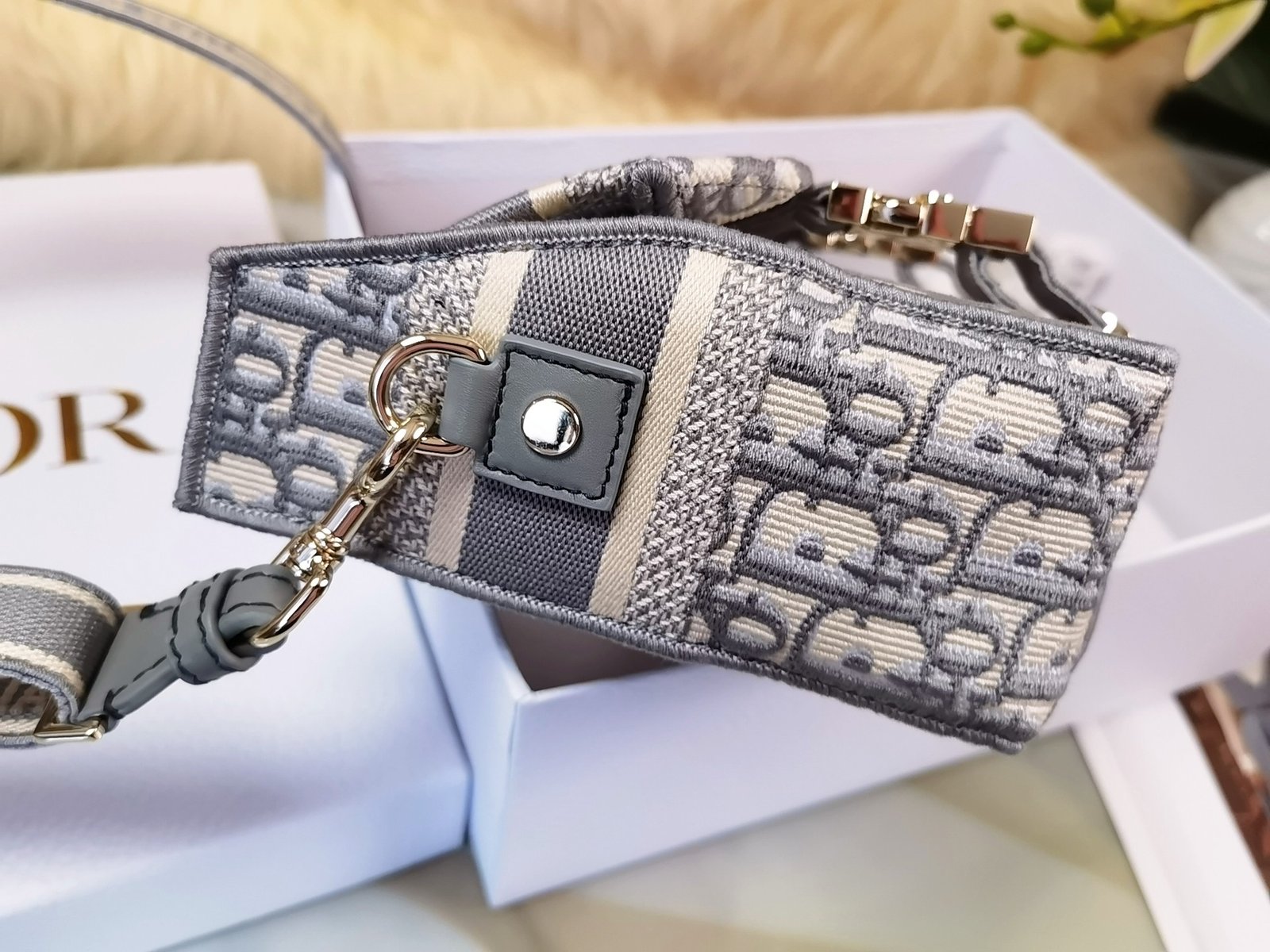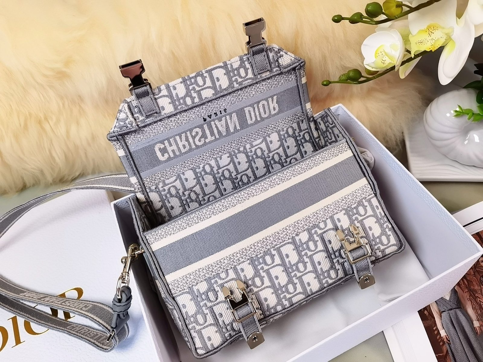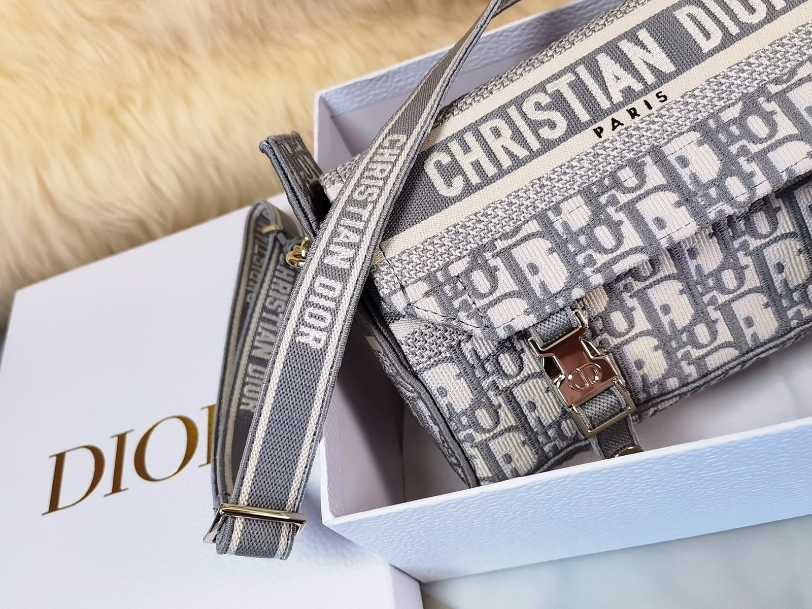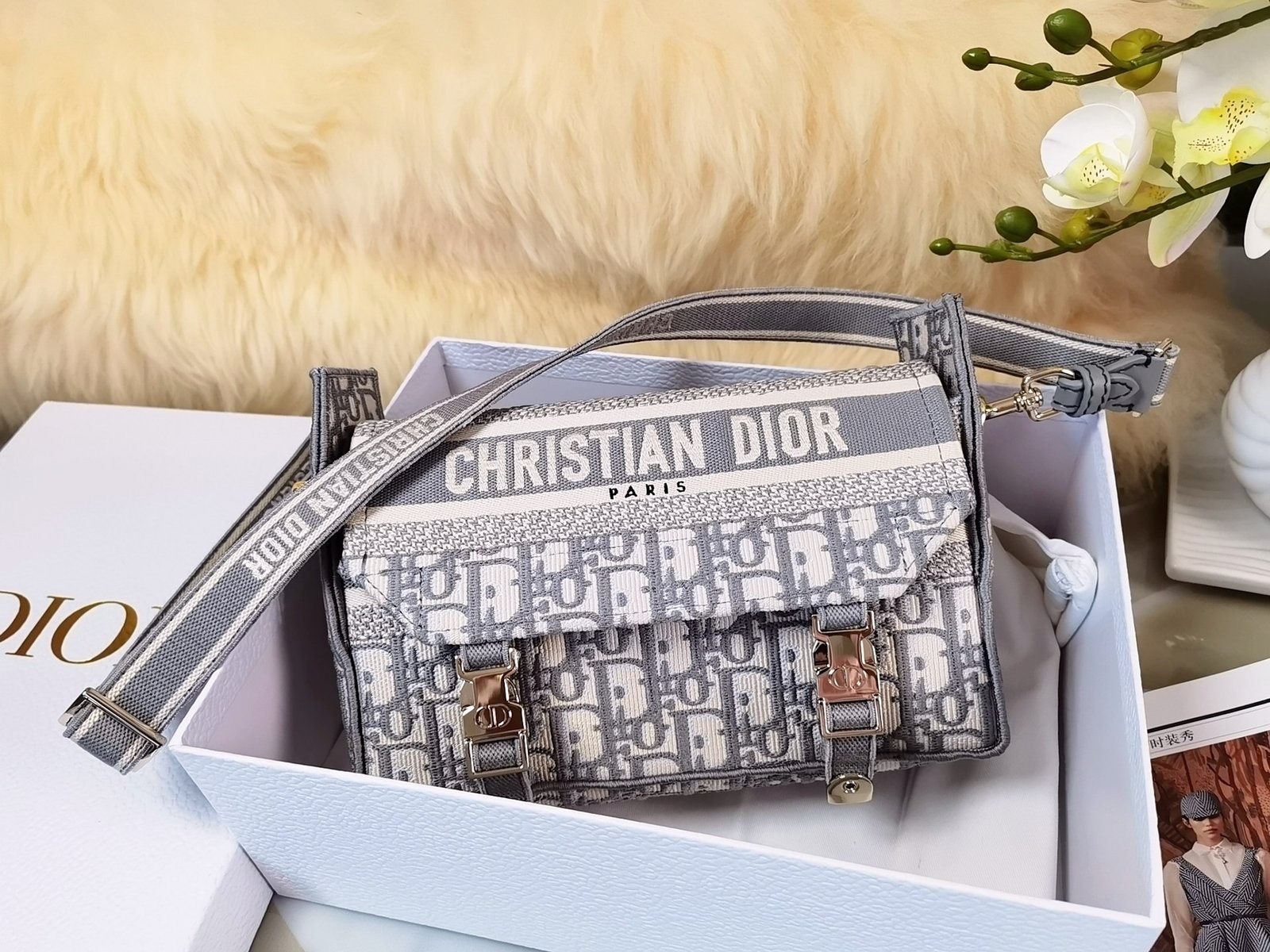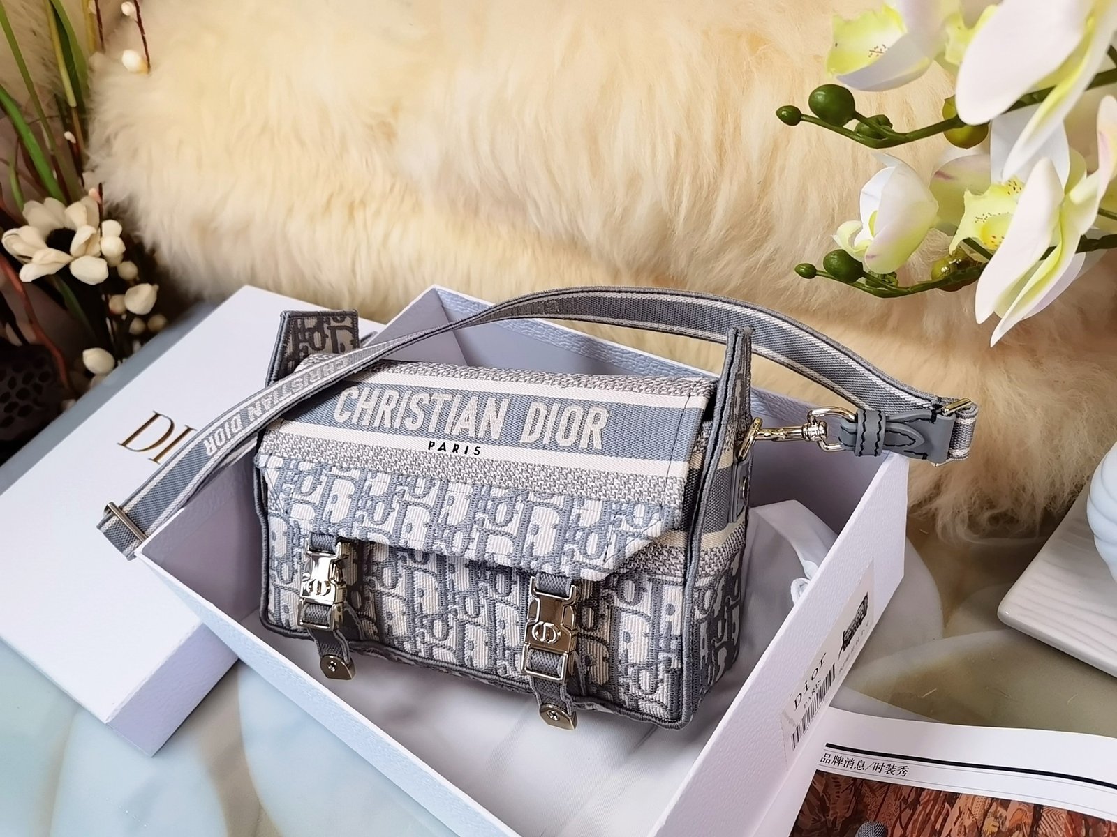 New Small Messenger Bag The Diorcamp bag, designed by Maria Grazia Chiuri, is a play on the classic messenger bag, with iconic Dior elements for a casual, chic look. Decorated with an all-over blue embroidered Oblique print, this small bag is enhanced with a "CHRISTIAN DIOR" signature flap and a sporty "CD" buckle. This compact style is perfect for urban looks, with an adjustable and removable shoulder strap that can be carried on the shoulder or crossbody. "CHRISTIAN DIOR" signature "CD" buckle on the front Removable and adjustable shoulder strap Dust bag included Dimensions: 23 x 15 x 8 cm