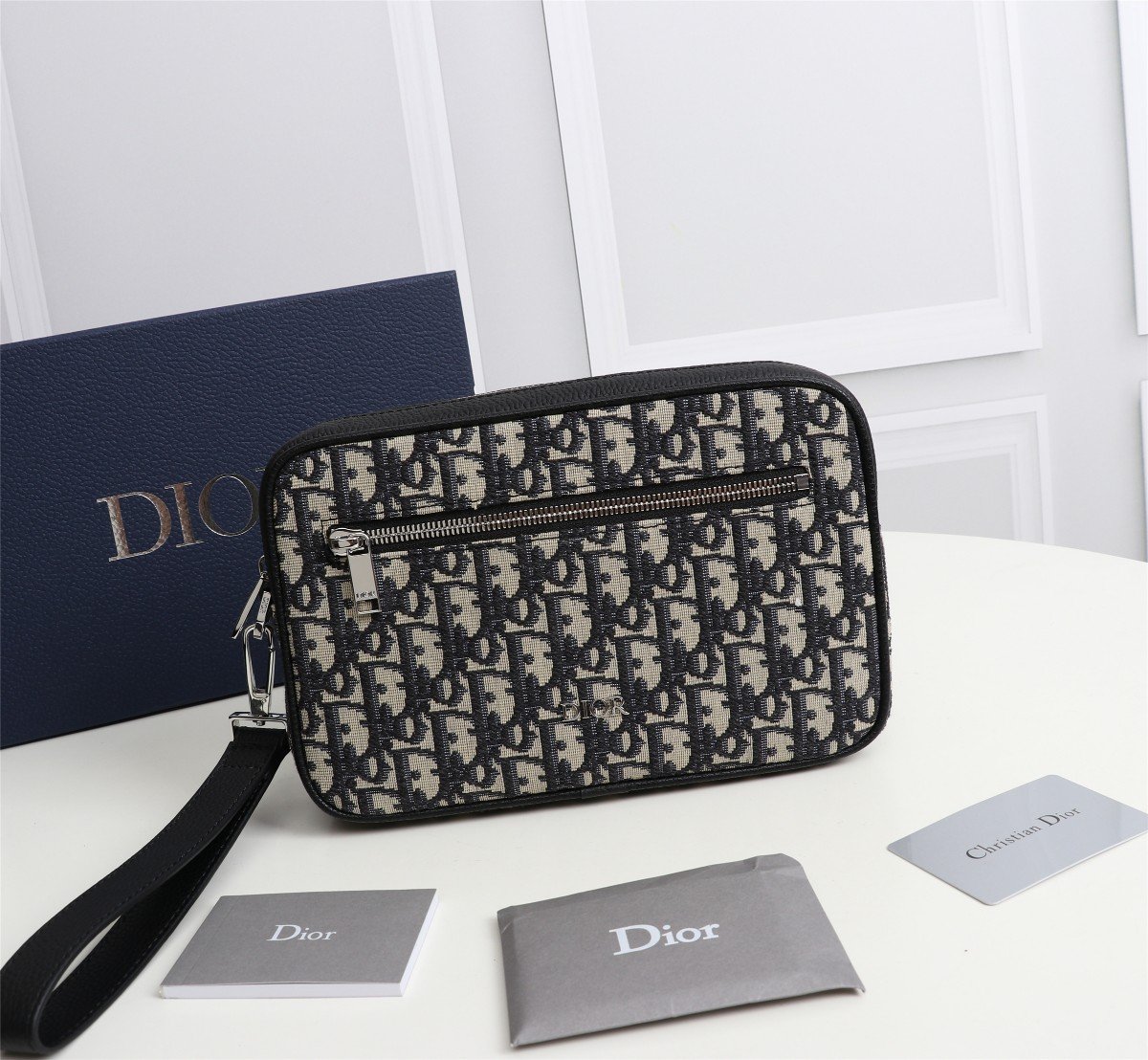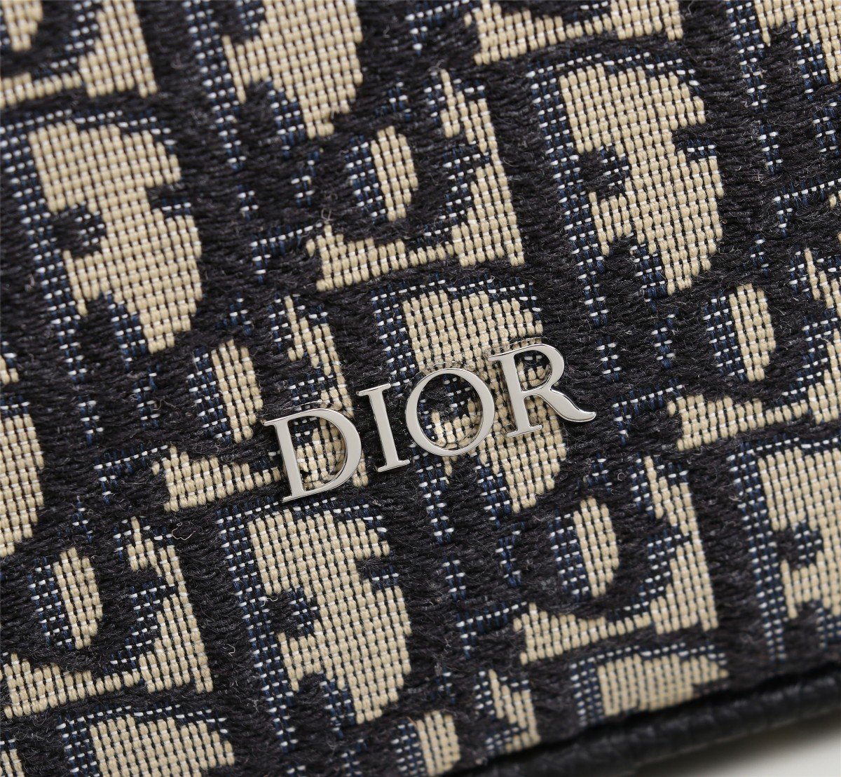 Practical and smart, this wash bag. Crafted in beige and black jacquard Oblique print, it is trimmed with black grained calfskin leather and embellished with the ‘DIOR’ signature on the front. Large zip compartment with front zip pocket. It can be easily carried by hand or put inside the bag thanks to the removable leather strap. Model No.: 2ESCA340YSE_H05E Beige and black jacquard Oblique print Metallic brass ‘DIOR’ signature on the front Embossed ‘DIOR’ signature on the inside Metallic brass two-way zip closure Removable leather strap 6 card slots inside Front zip pocket Dimensions: 24 x 15.5 x 5.5 cm