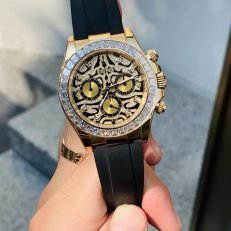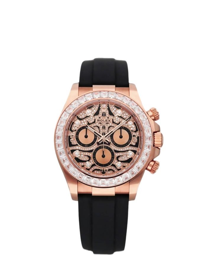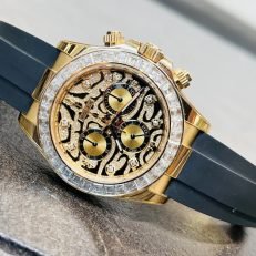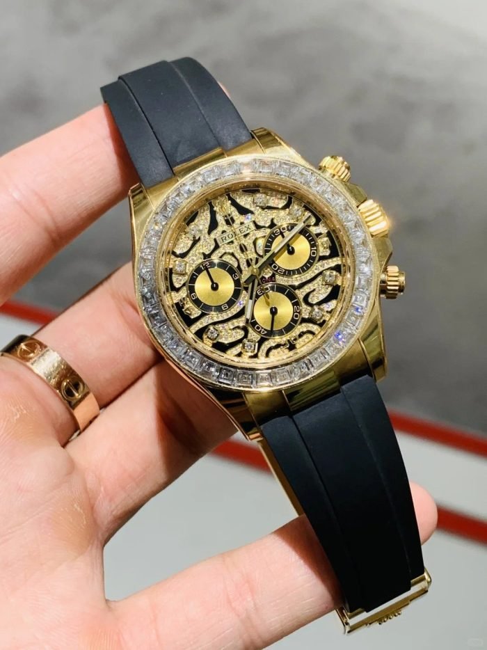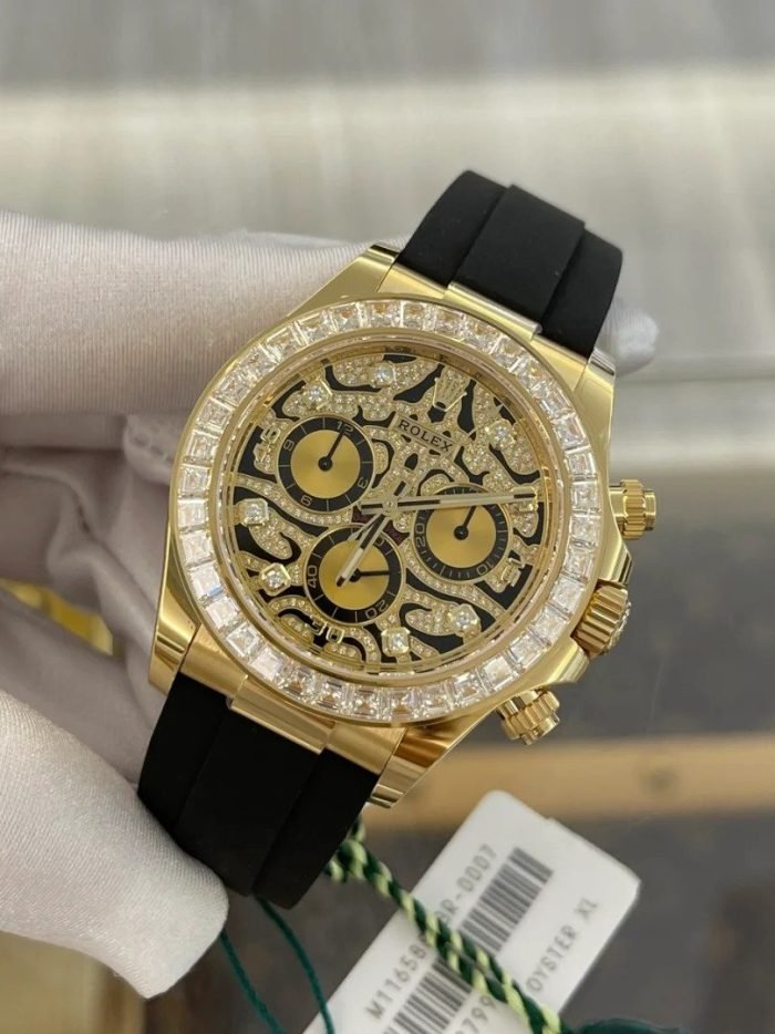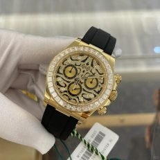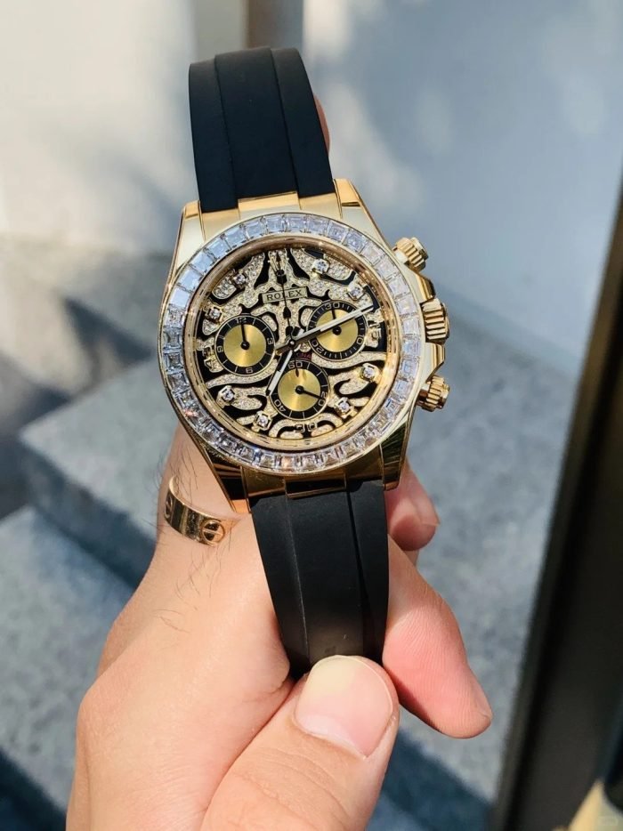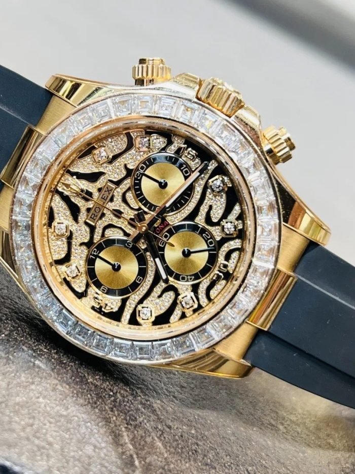 A Rolex Daytona with diamonds is not something new but one with a dial like the 116588TBR sure is! The black-lacquered dial has an applied 18k yellow-gold and diamond-set. wavy structure on the surface. which can remind you of a tiger’s fur.