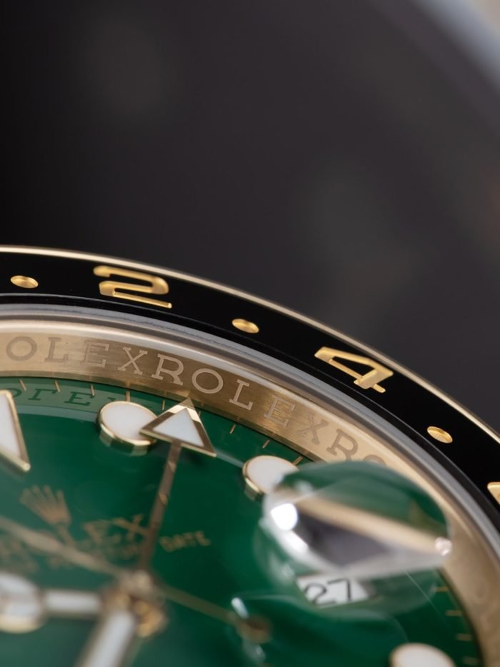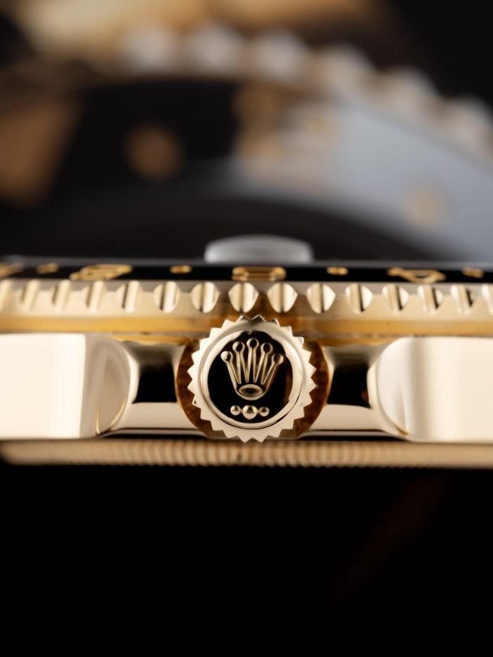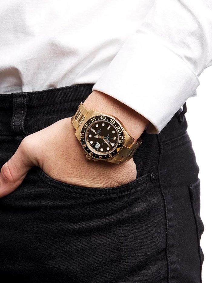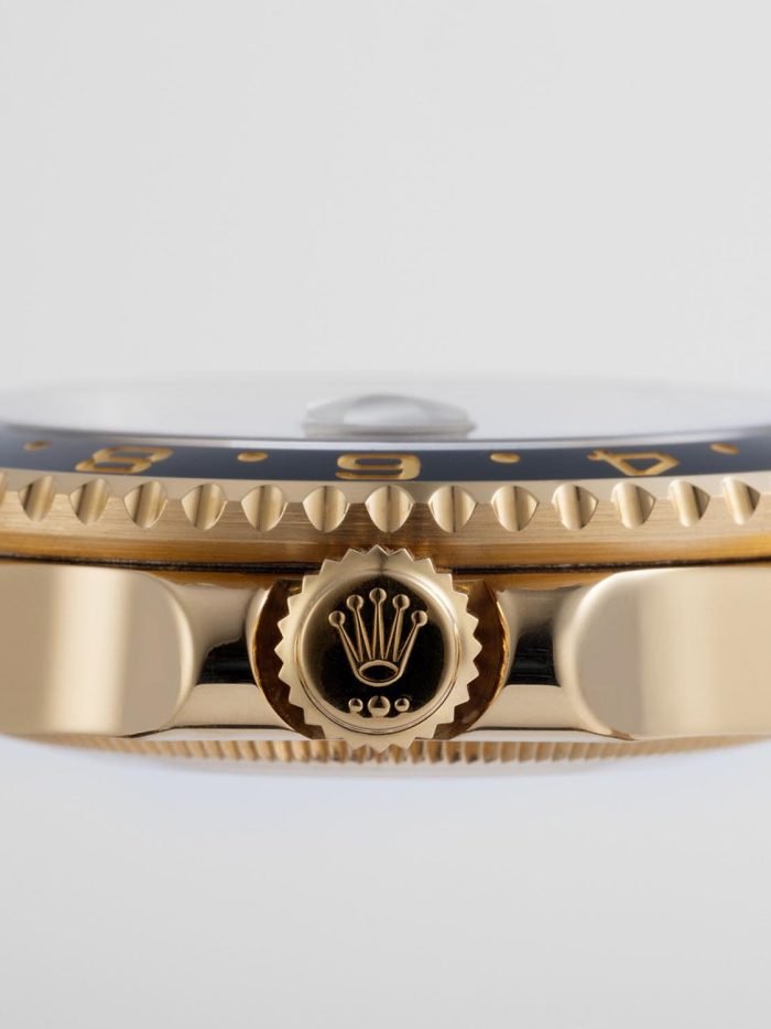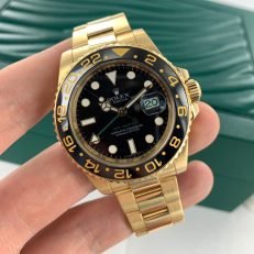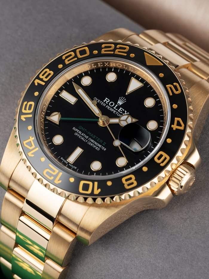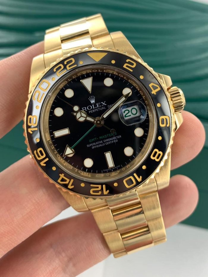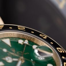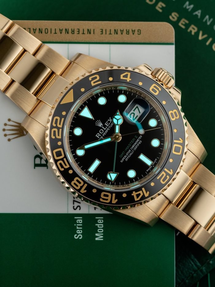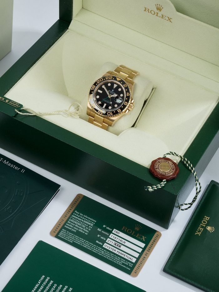 Rolex celebrated the 50th anniversary of their legendary GMT Master pilot’s watch in 2005 by releasing the yellow gold ref. 116718 you see here. As an anniversary Rolex that also happened to be discontinued. this GMT is particularly sought-after on the secondary market. It also stands to hold its value alongside the price of gold and hails from the exclusive Rolex catalog ?C all excellent reasons to consider investing in this yellow gold stunner. Other features include a contemporary black ceramic bezel. Maxi hour markers and Mercedes hands. longer-lasting luminescent material. scratch-resistant sapphire. a Triplock waterproof screw-down crown. and the caliber 3186 Perpetual movement. Keep perfect time for anywhere in the world with this stylish gold Rolex GMT Master II ref. 116718 on your wrist.