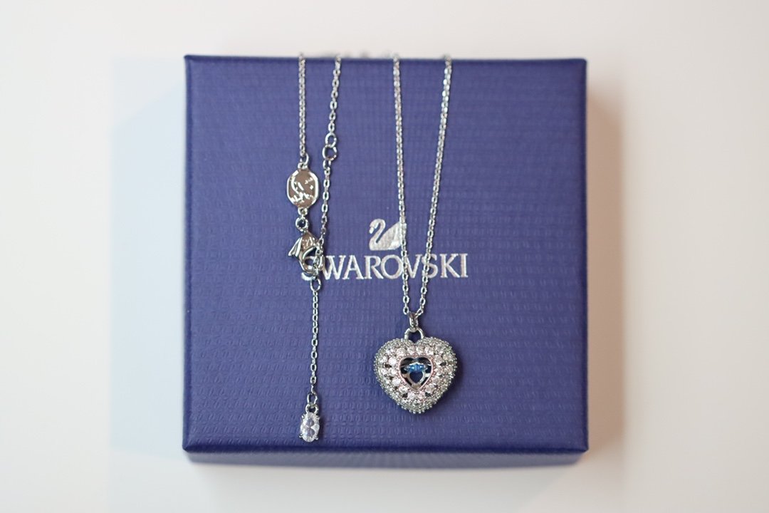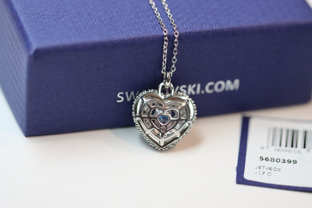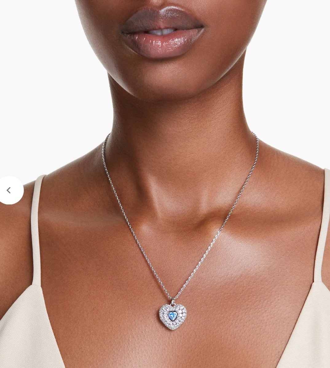 This romantic Swarovski pendant combines two hearts into one. The rhodium-plated pattern adopts a cage design with maximum volume. To enhance the dome-shaped effect, round transparent Swarovski cubic zirconia is set with a striking stacking bezel technique, and the blue heart-shaped smart gem in the center captures light from all angles. This is a perfect way to say "I love you" to someone special.