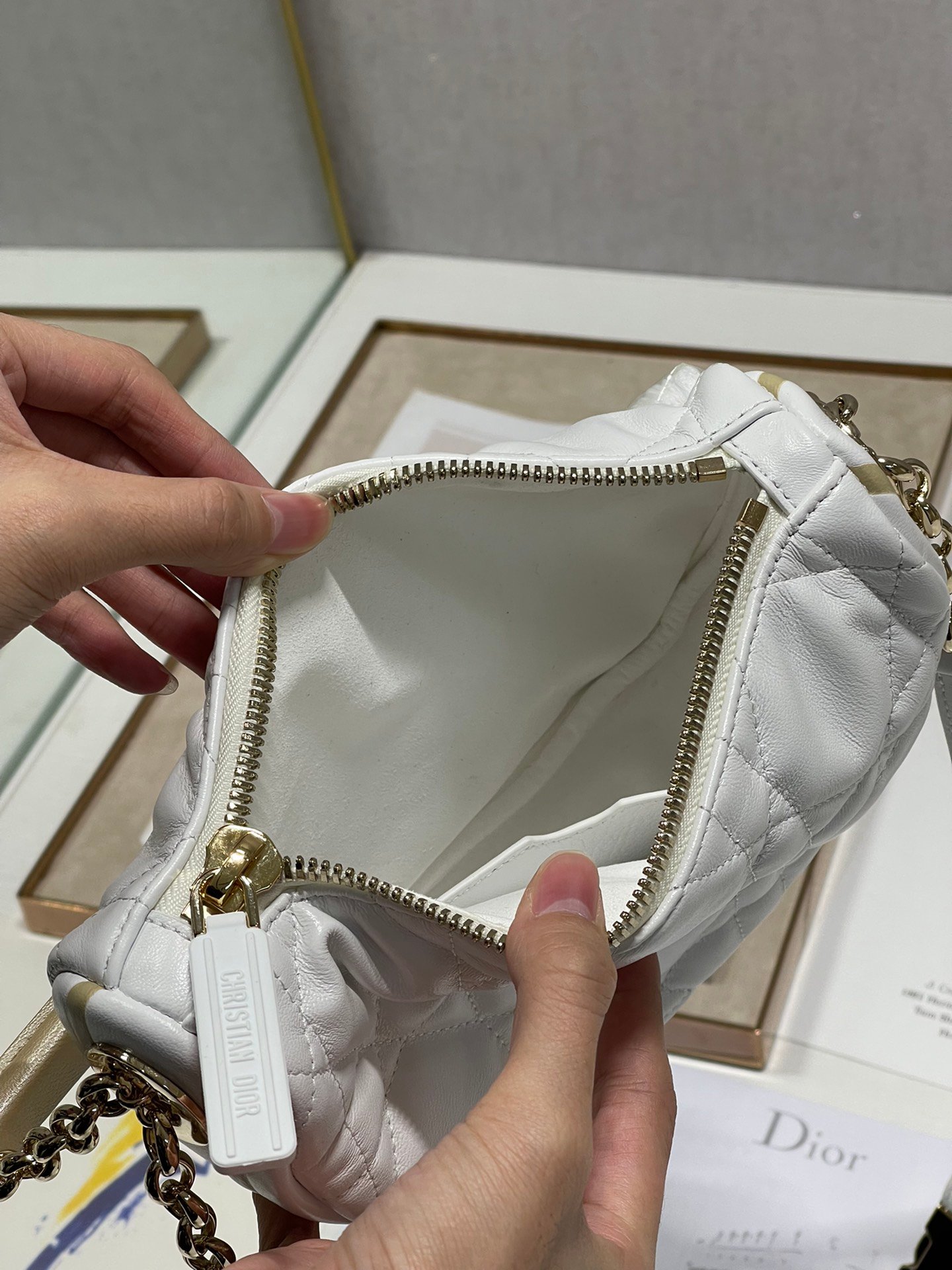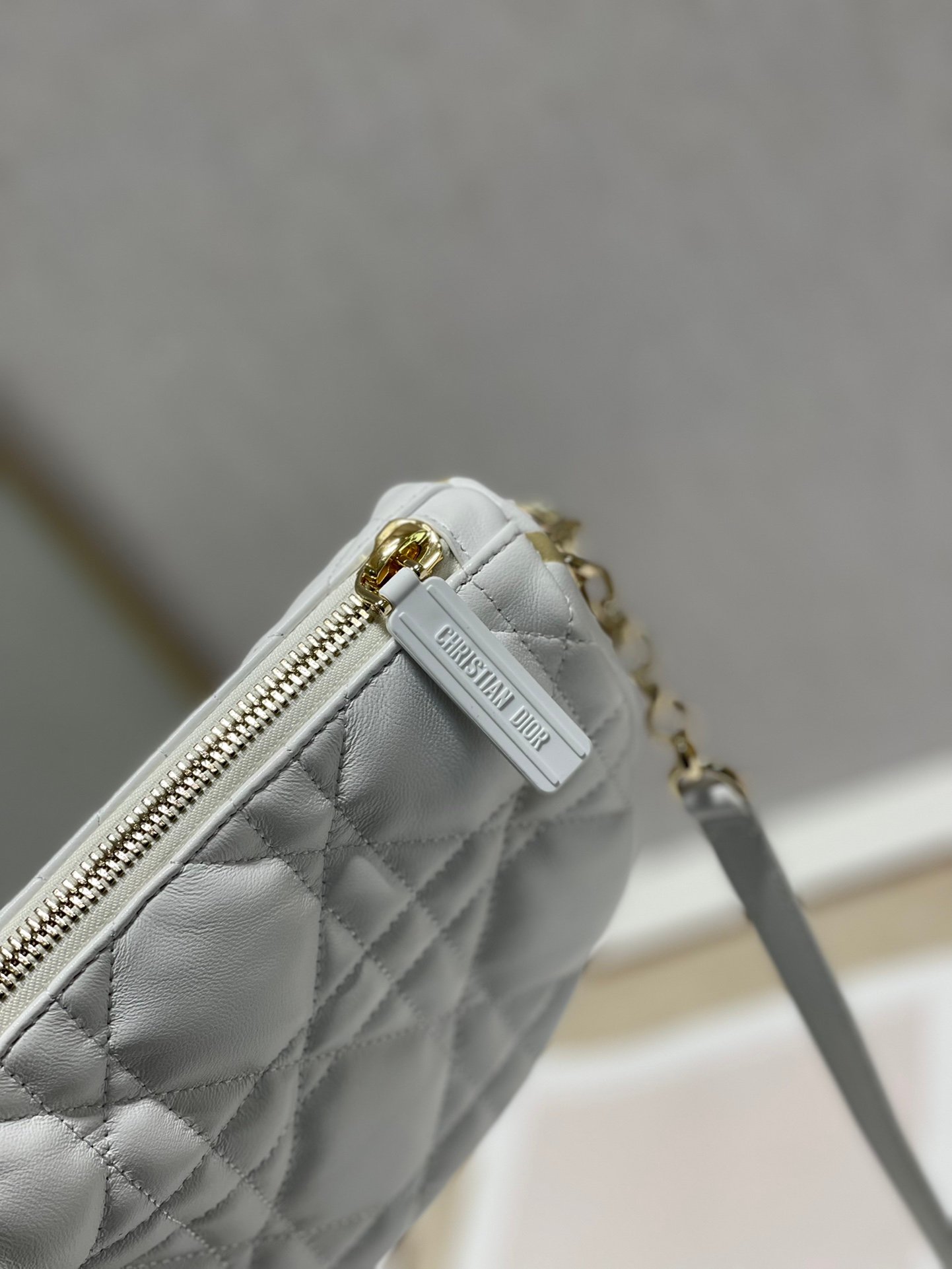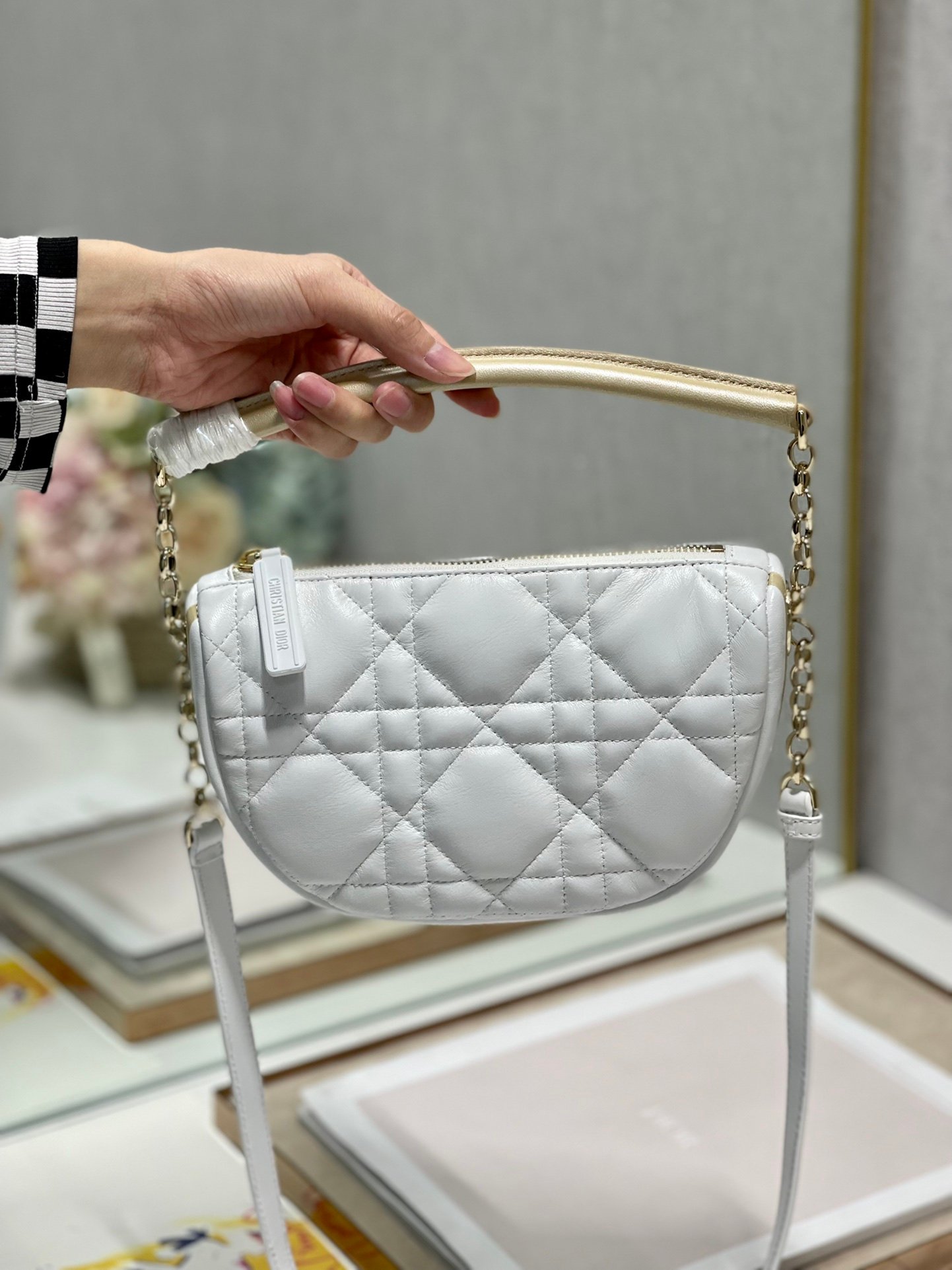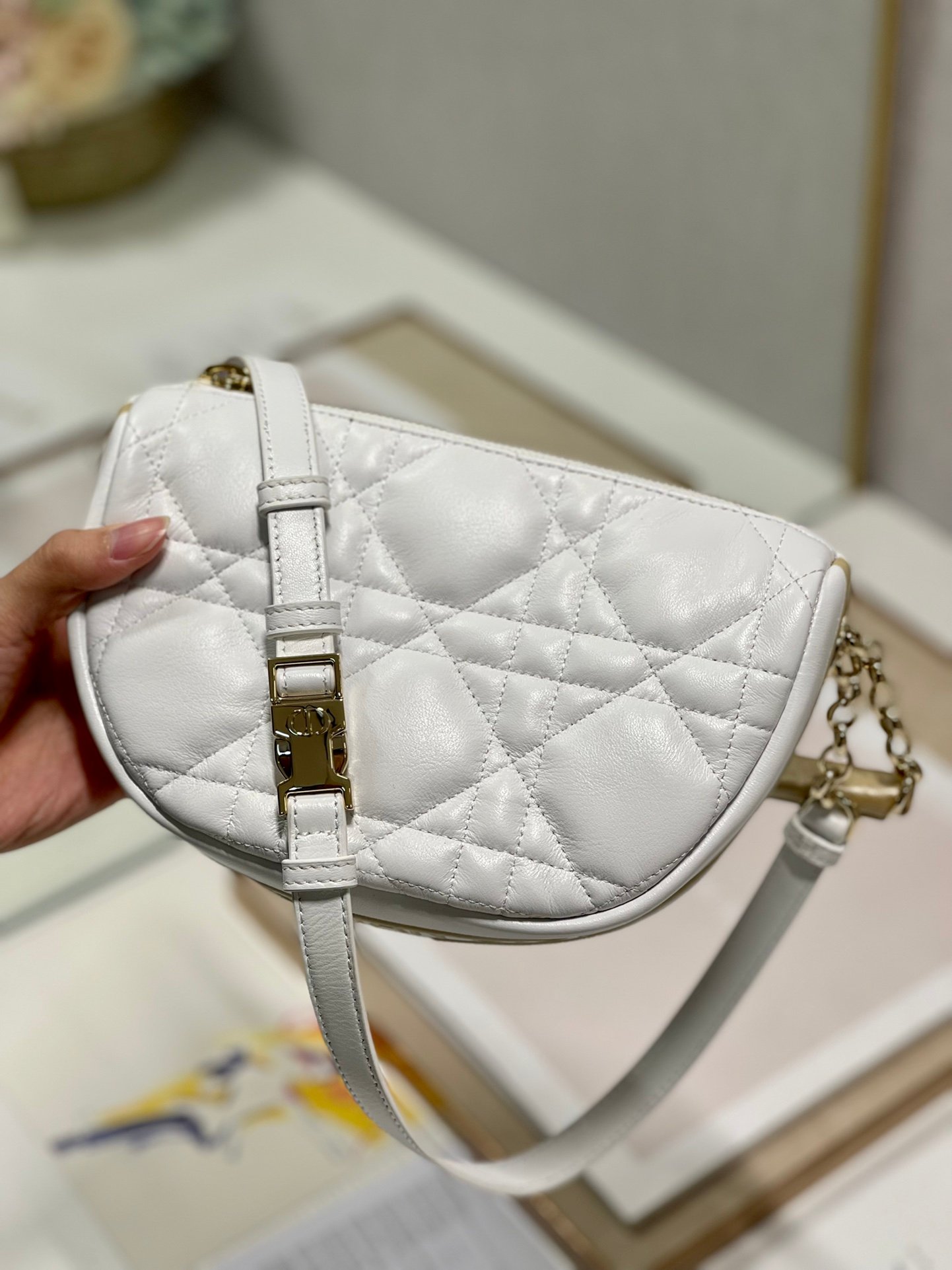 The Dior Vibe shoulder bag, newly launched this season, has a stylish silhouette that highlights the modern charm of the shoulder bag. It is carefully crafted from white cowhide leather, decorated with cannage stitching, suede cowhide lining adds a soft texture, and the bottom is decorated with a gold "CHRISTIAN DIOR PARIS" logo. The small style, with handles, detachable and adjustable shoulder straps and military-style buckles, can be carried by hand, on the shoulder or cross-body, embellishing daily or sports style looks.