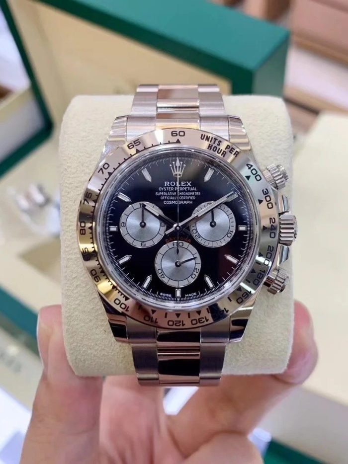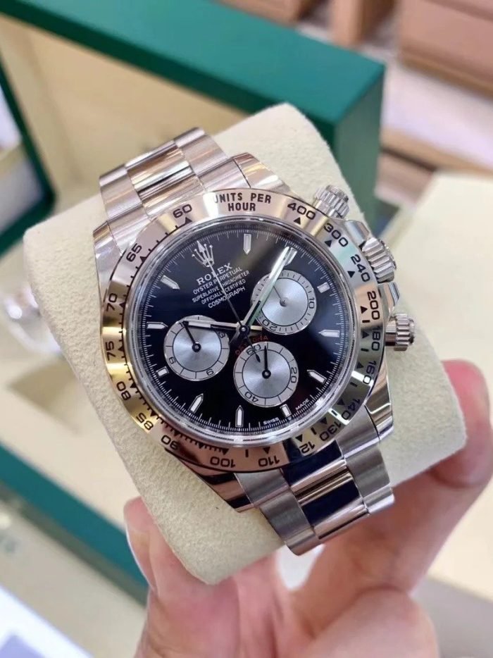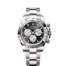 The Oyster Perpetual Cosmograph Daytona in 18 ct white gold with a glossy black and stainless steel dial and Oyster bracelet with an engraved tachymeter on an 18 ct white gold bezel. -m126509-0001 40mm