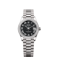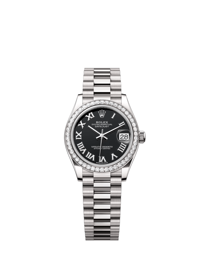 The Oyster Perpetual Datejust 31 is available in 18 ct white gold with a glossy black dial and President bracelet. -m278289rbr-0011