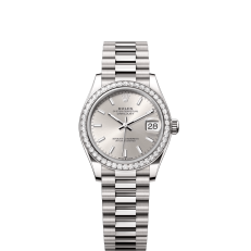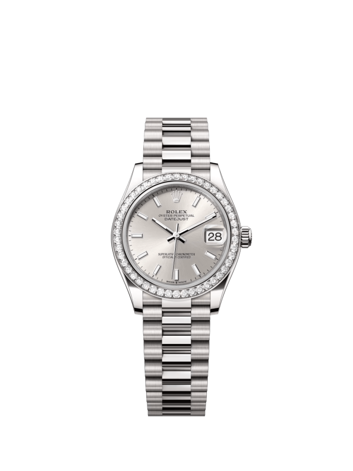 The Oyster Perpetual Datejust 31 is available in 18 ct white gold with a silver dial and a President bracelet. -m278289rbr-0012