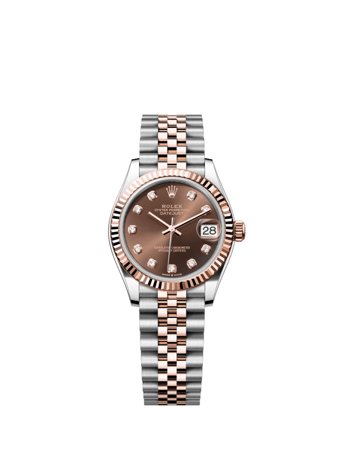 The Oyster Perpetual Datejust 31 is available in Everose gold and Oystersteel with a chocolate-coloured diamond-set dial and a Jubilee bracelet. -m278271-0028